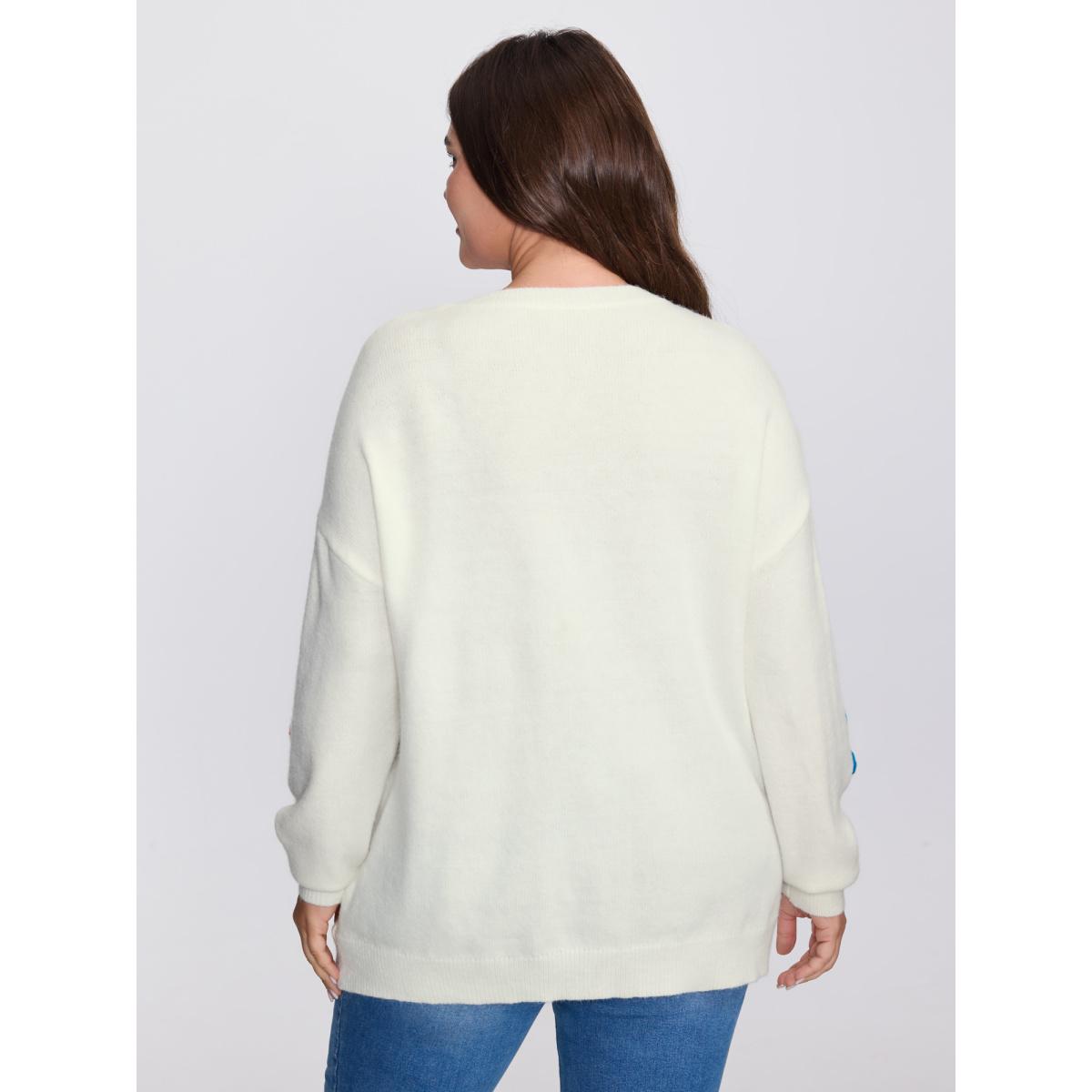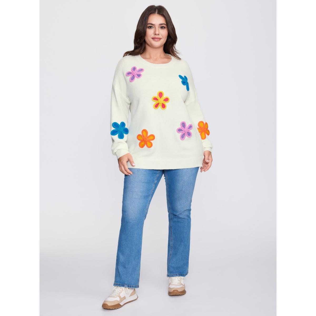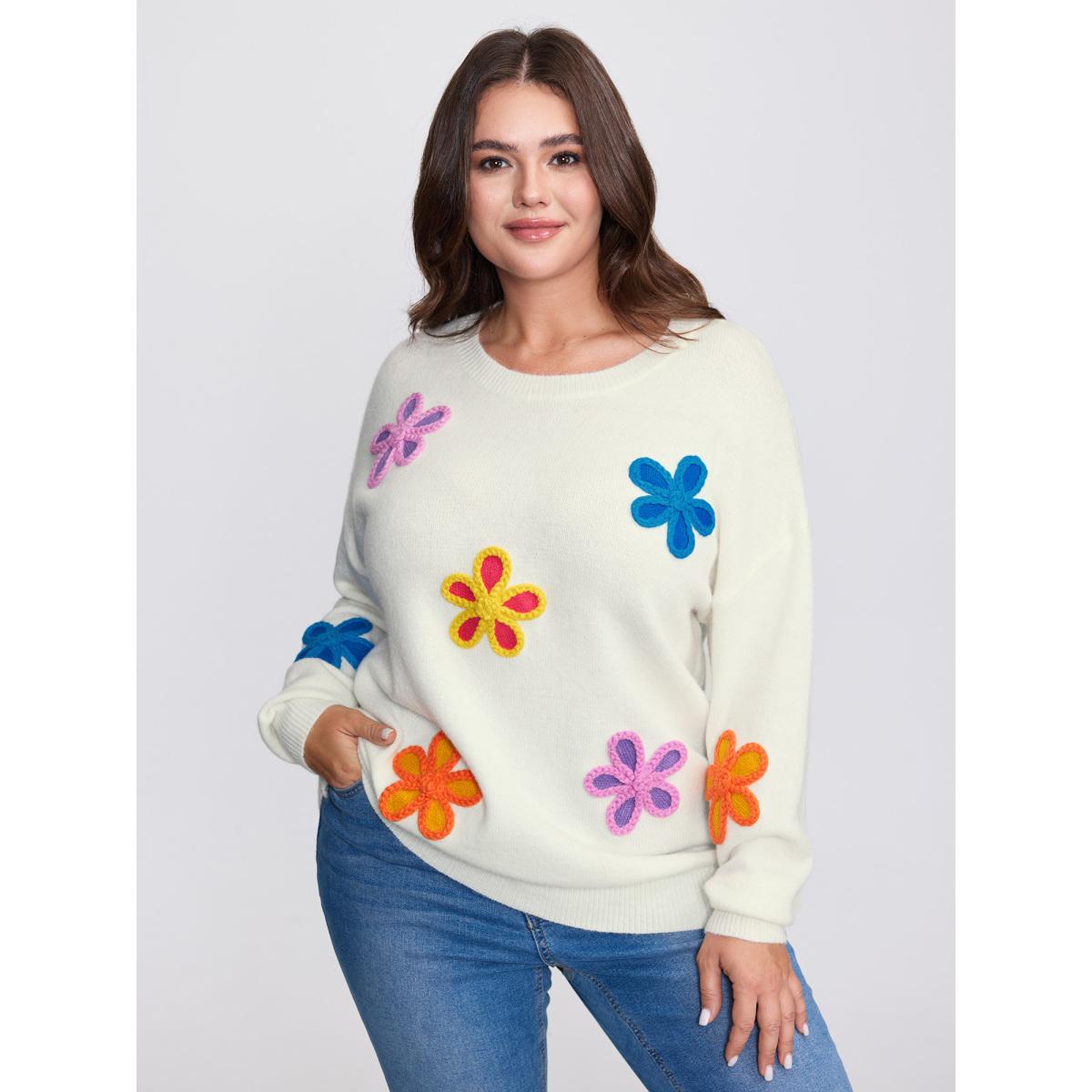 Plus Size Supersoft Multi-Color Floral Crochet Round Neck Pullover Ivory Women Playful Loose Long Sleeve Round Neck Casual Pullovers BloomChic 10/M