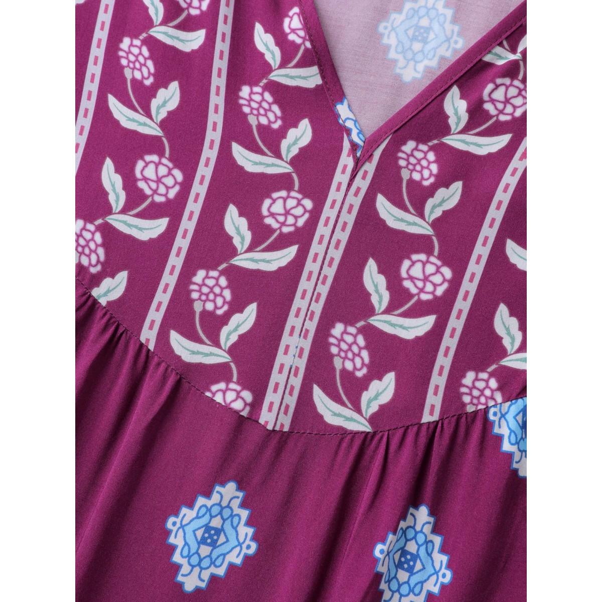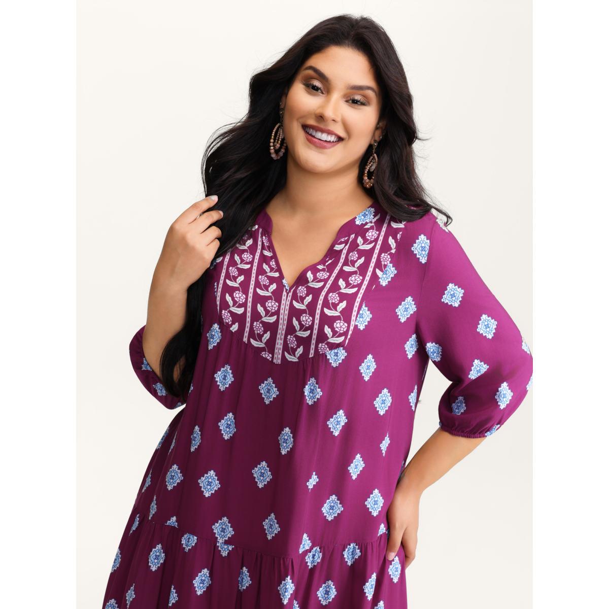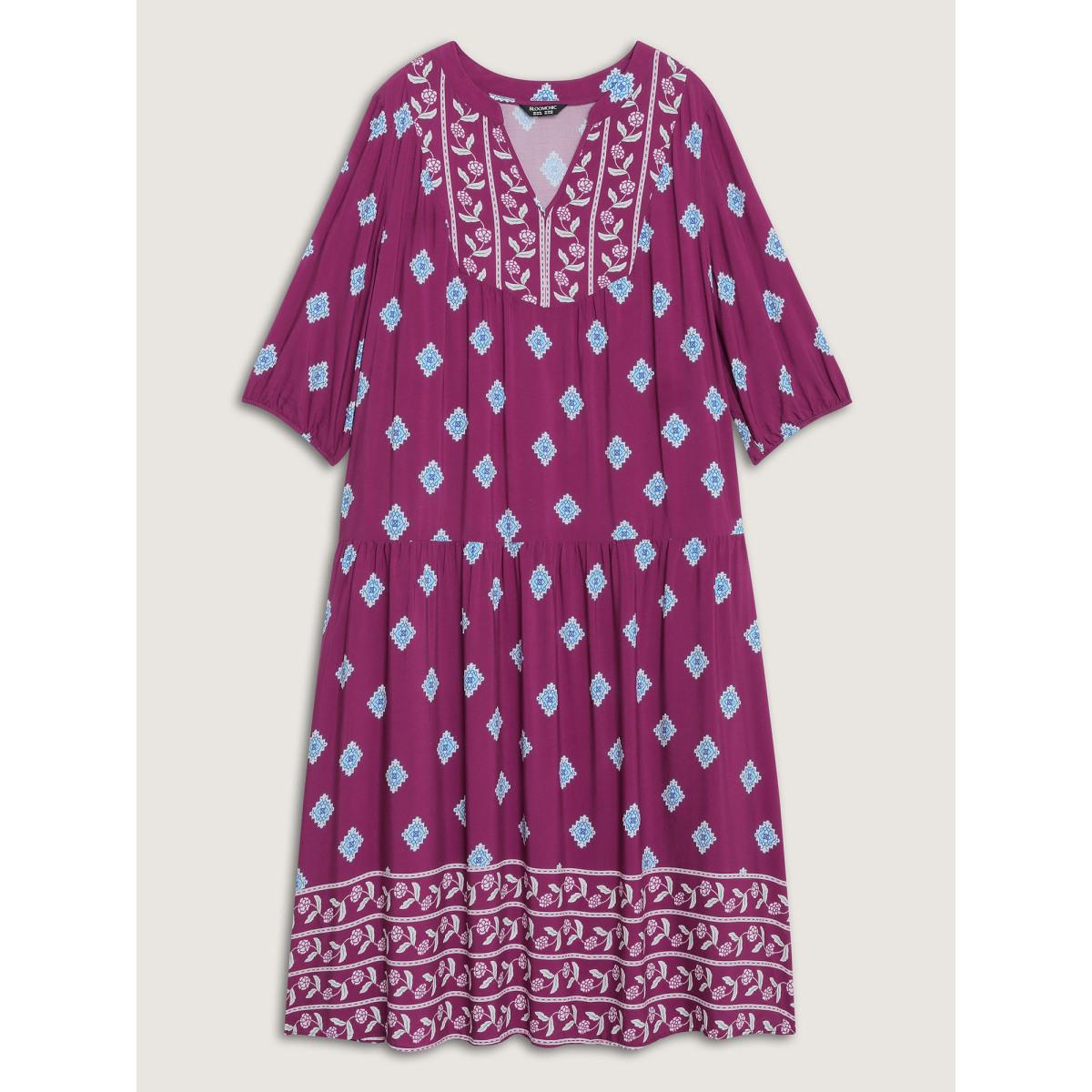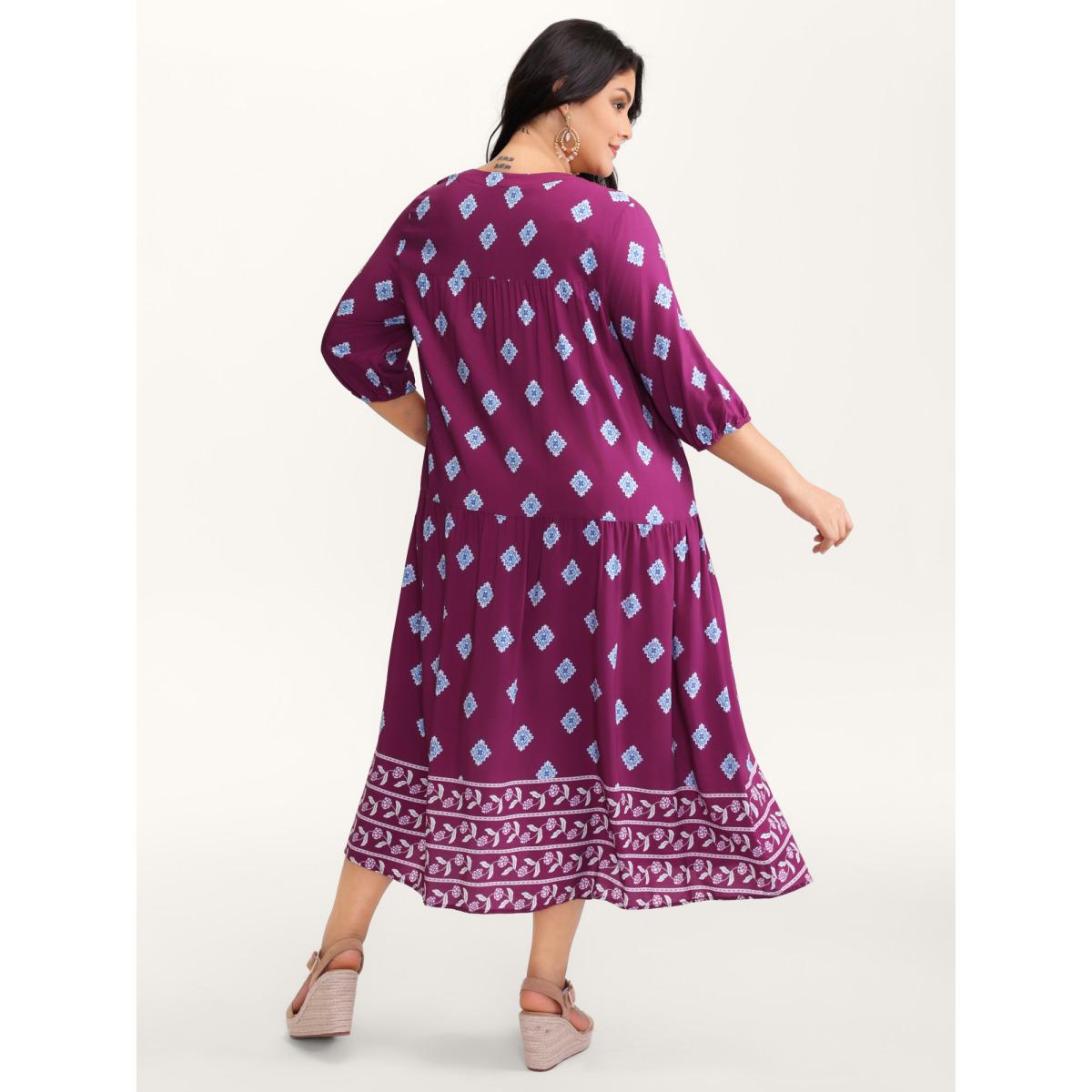 Plus Size Supersoft Rayon Boho Print Maxi Dress Multicolor Women Boho Gathered Flat collar with V-notch Elbow-length sleeve Curvy BloomChic 14-16/1X