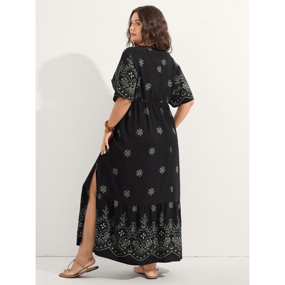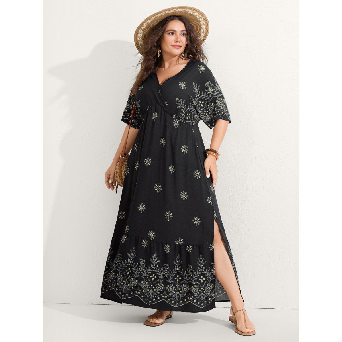Plus Size Surplice Neck Split Side Pockets Midi Dress Black Women Boho Overlapping Overlap Collar Half Sleeve Curvy BloomChic 26/4X