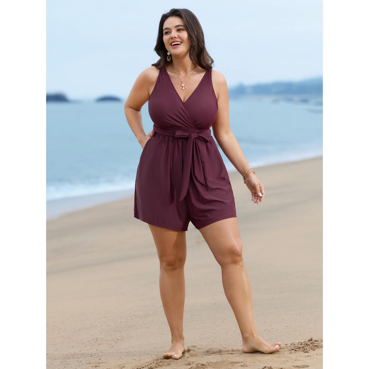 Plus Size Surplice Neckline Belted Plain One-Piece Swimsuit Women's Swimwear Plum Resort Tie knot Curve Bathing Suits High stretch One Pieces BloomChic 10/M