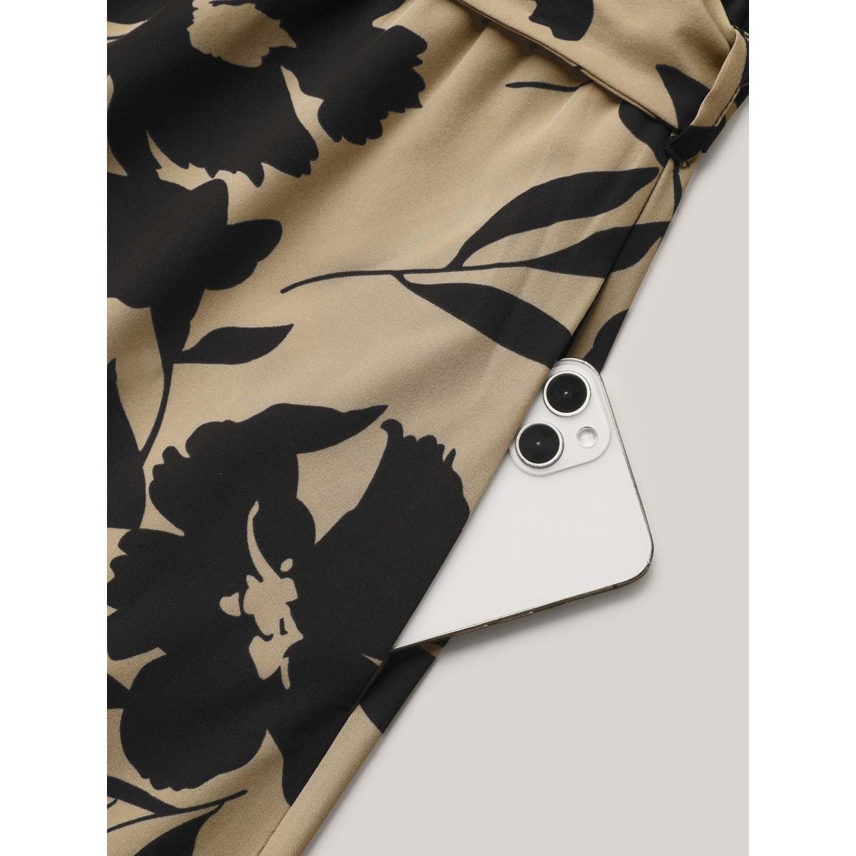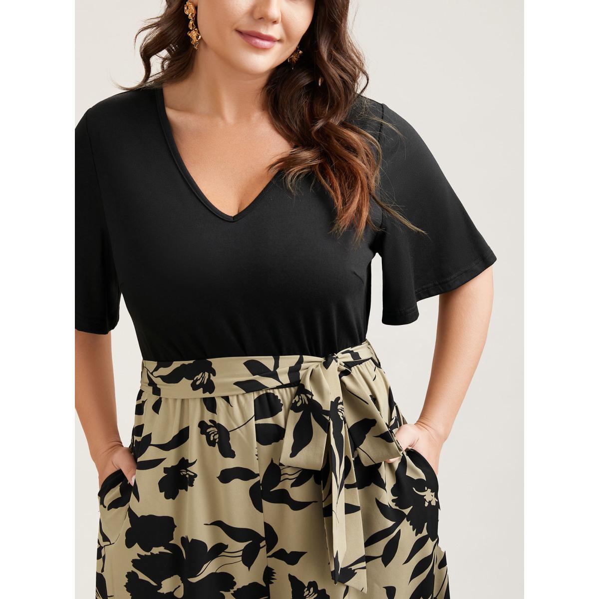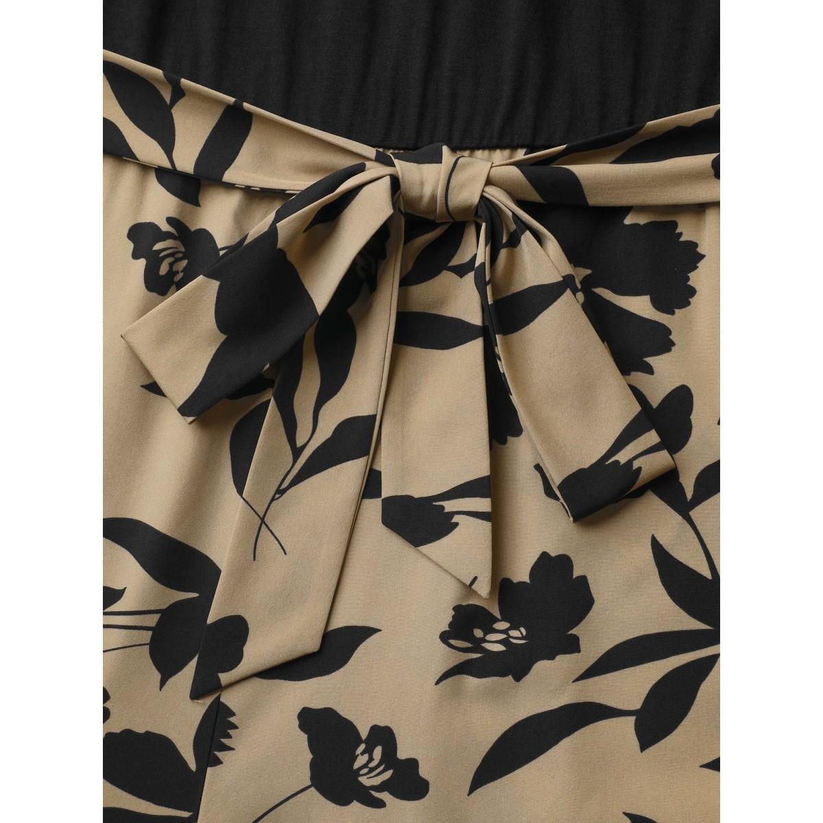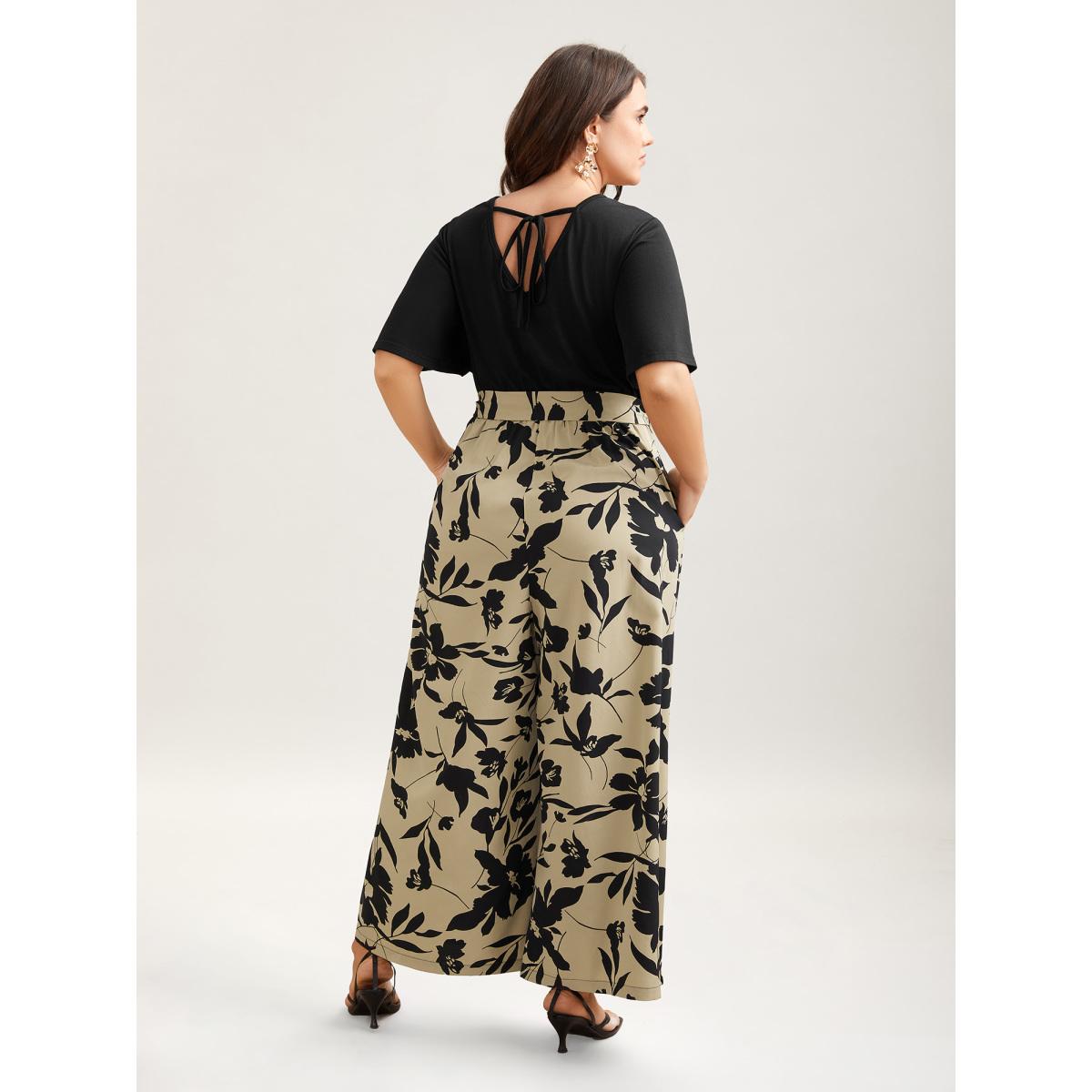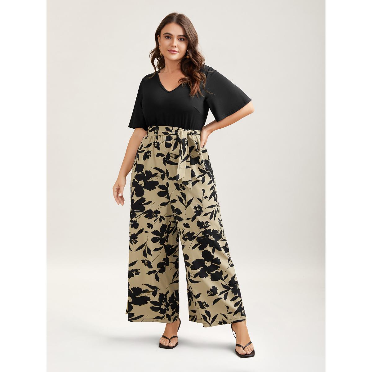 Plus Size Tan Floral Print Spliced Belted Wide-Leg Jumpsuit Women Elegant Short sleeve V-neck Everyday-Elegant Loose Jumpsuits BloomChic 18-20/2X