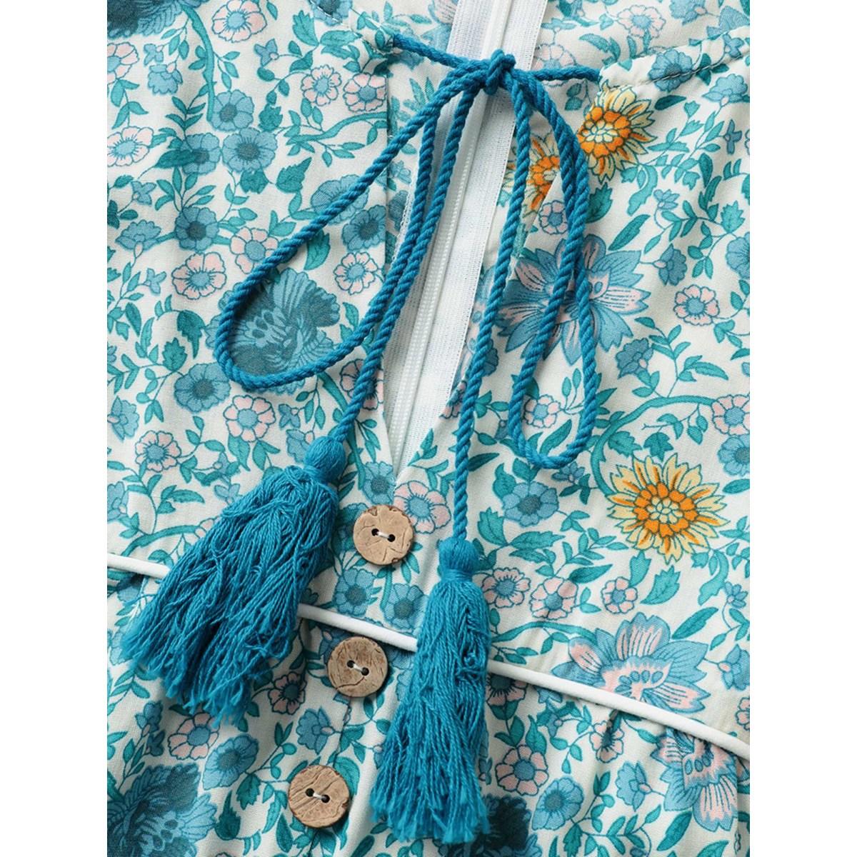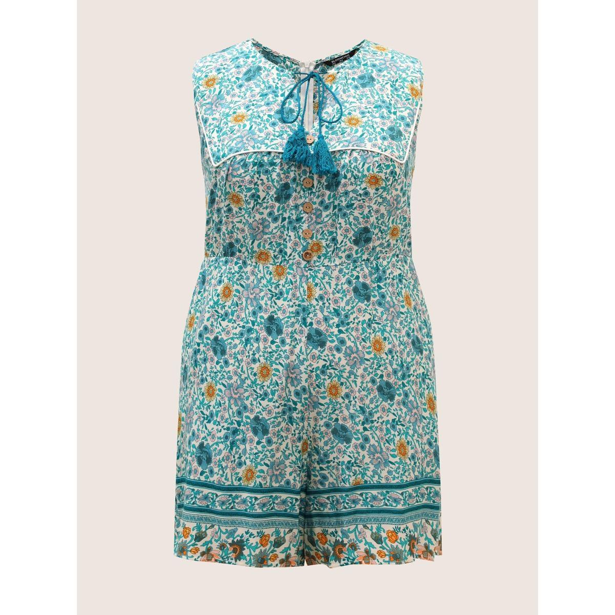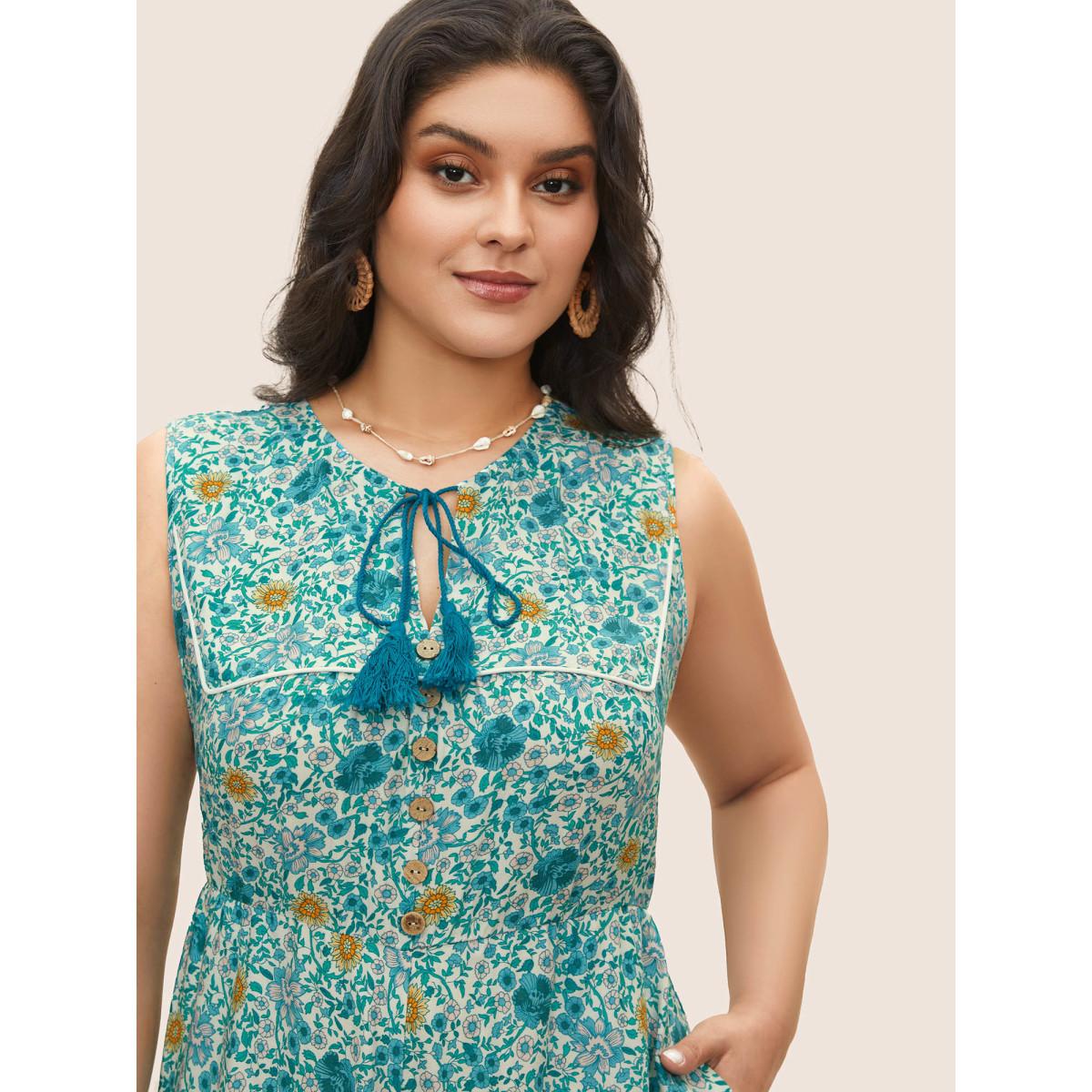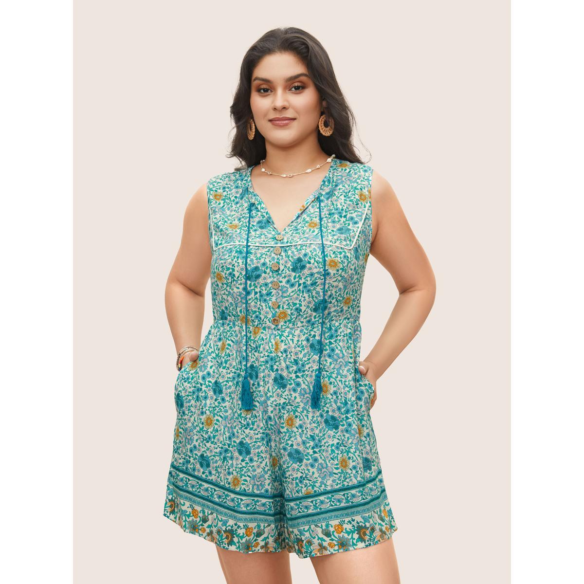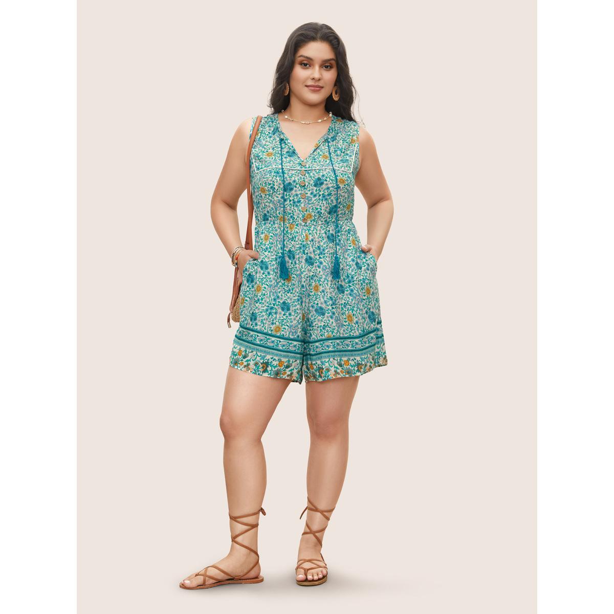 Plus Size Teal Ditsy Floral Button Detail Ties Tassel Trim Jumpsuit Women Resort Sleeveless V-neck Vacation Loose Jumpsuits BloomChic 26/4X