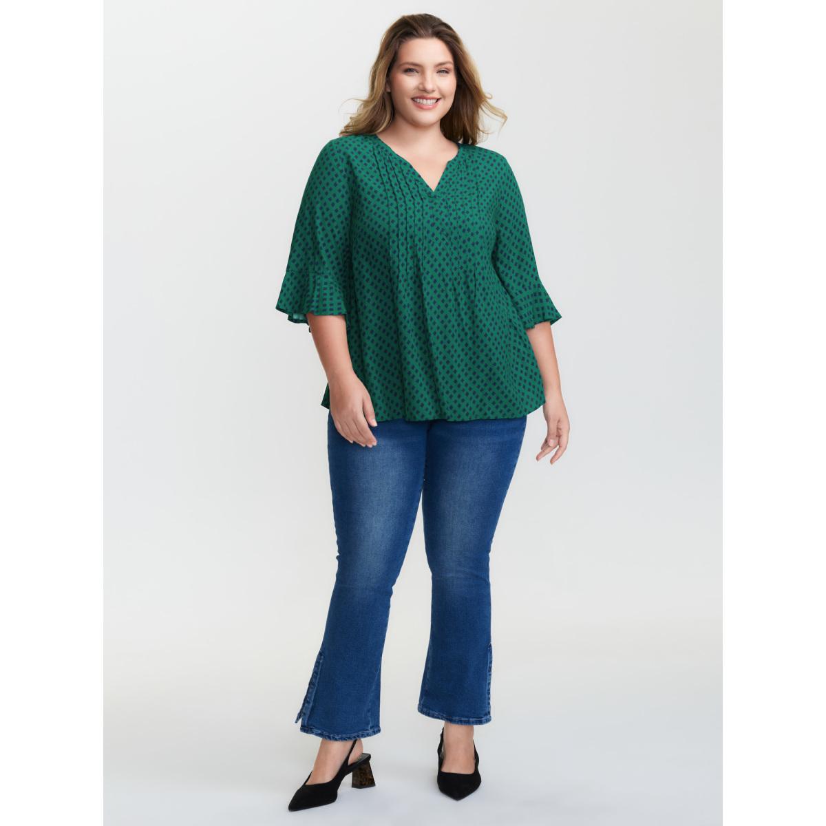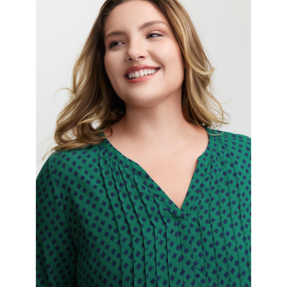 Plus Size Teal Geometric Print Bust-Ease Split Neck Blouse Women Office Three Quarter Length Sleeve Flat collar with V-notch Office Blouses BloomChic 18-20/2X
