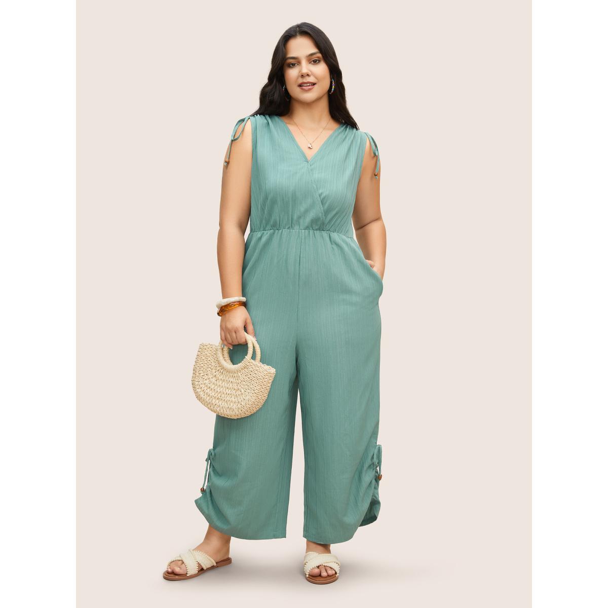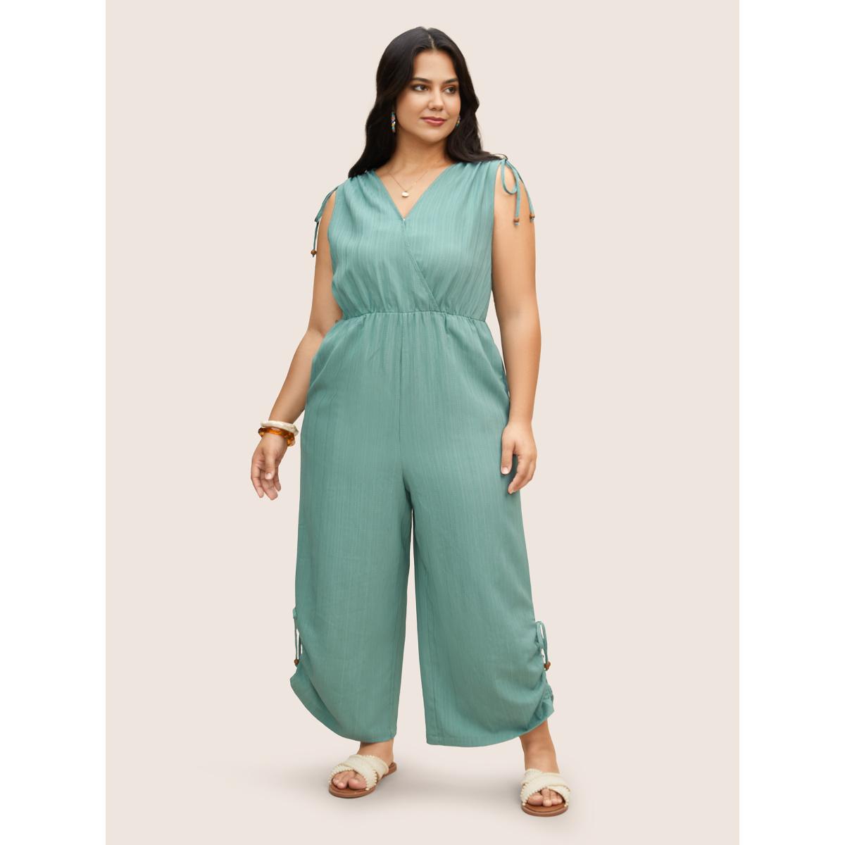 Plus Size Teal Plain Textured Surplice Neck Drawstring Jumpsuit Women Resort Sleeveless V-neck Vacation Loose Jumpsuits BloomChic 30/6X