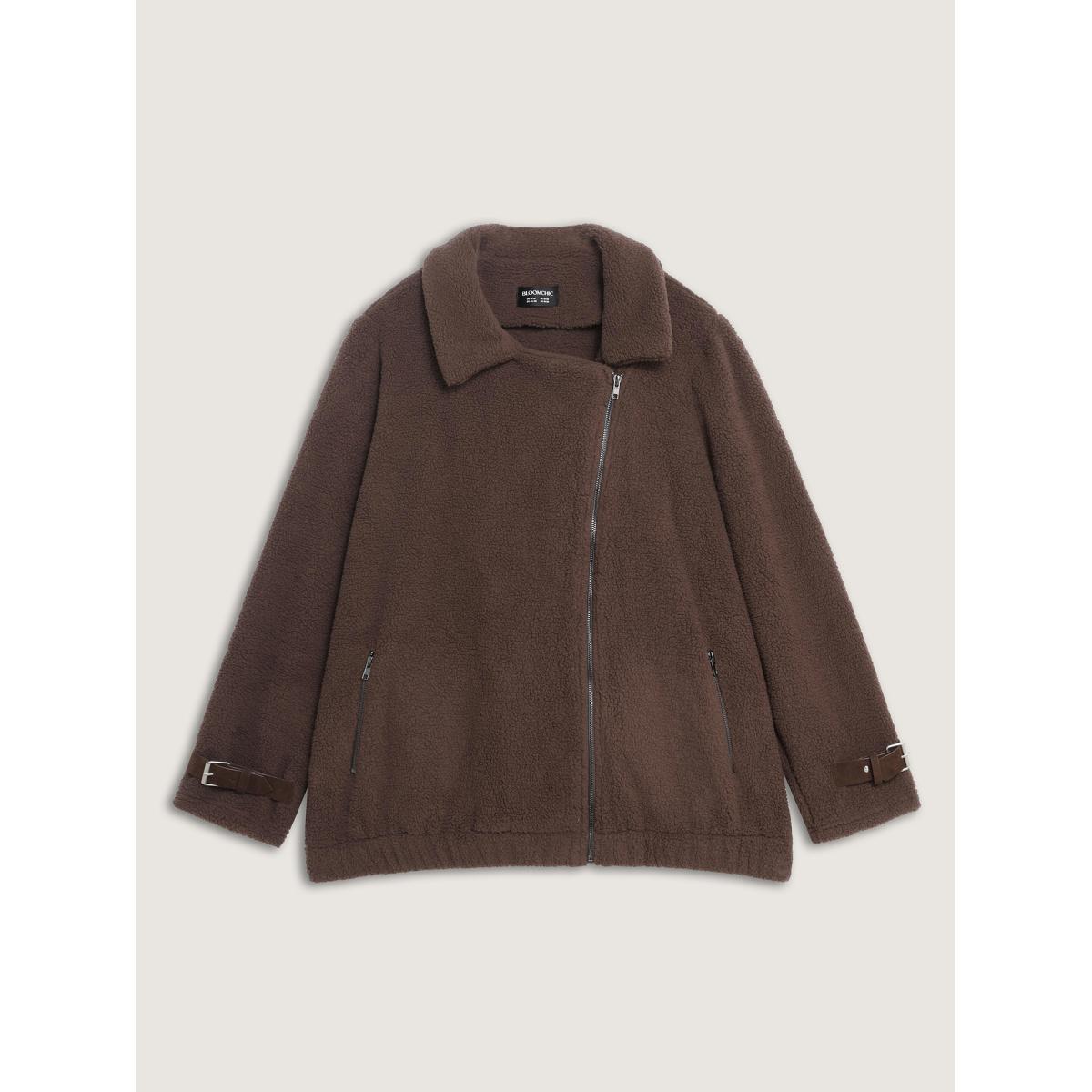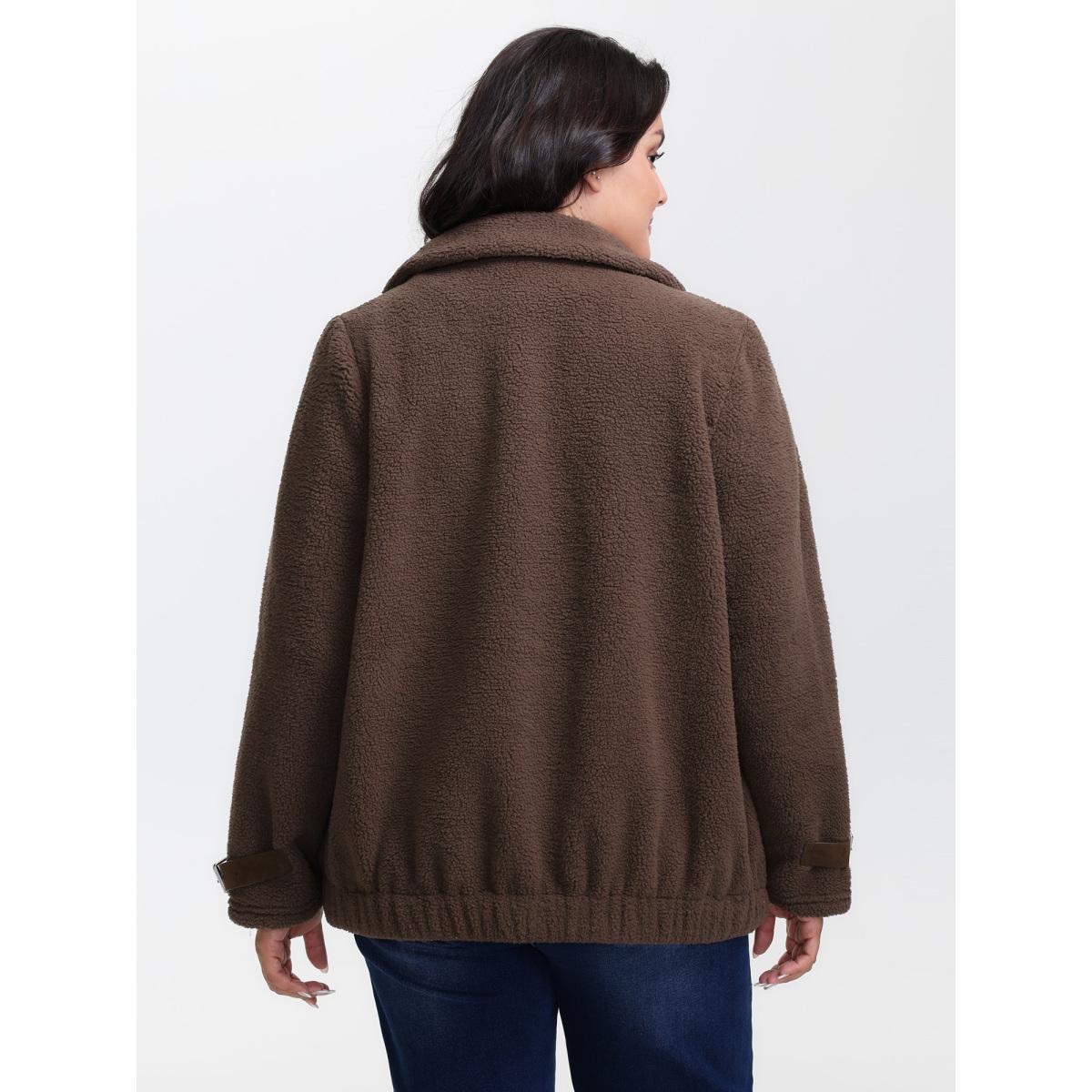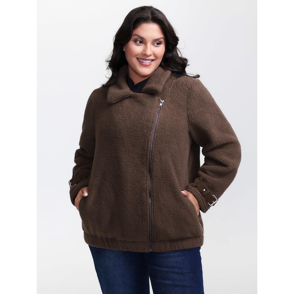 Plus Size Teddy Fleece Zipper Jacket Women DarkBrown Non Slanted pocket Casual Jackets BloomChic 22-24/3X Product Image
