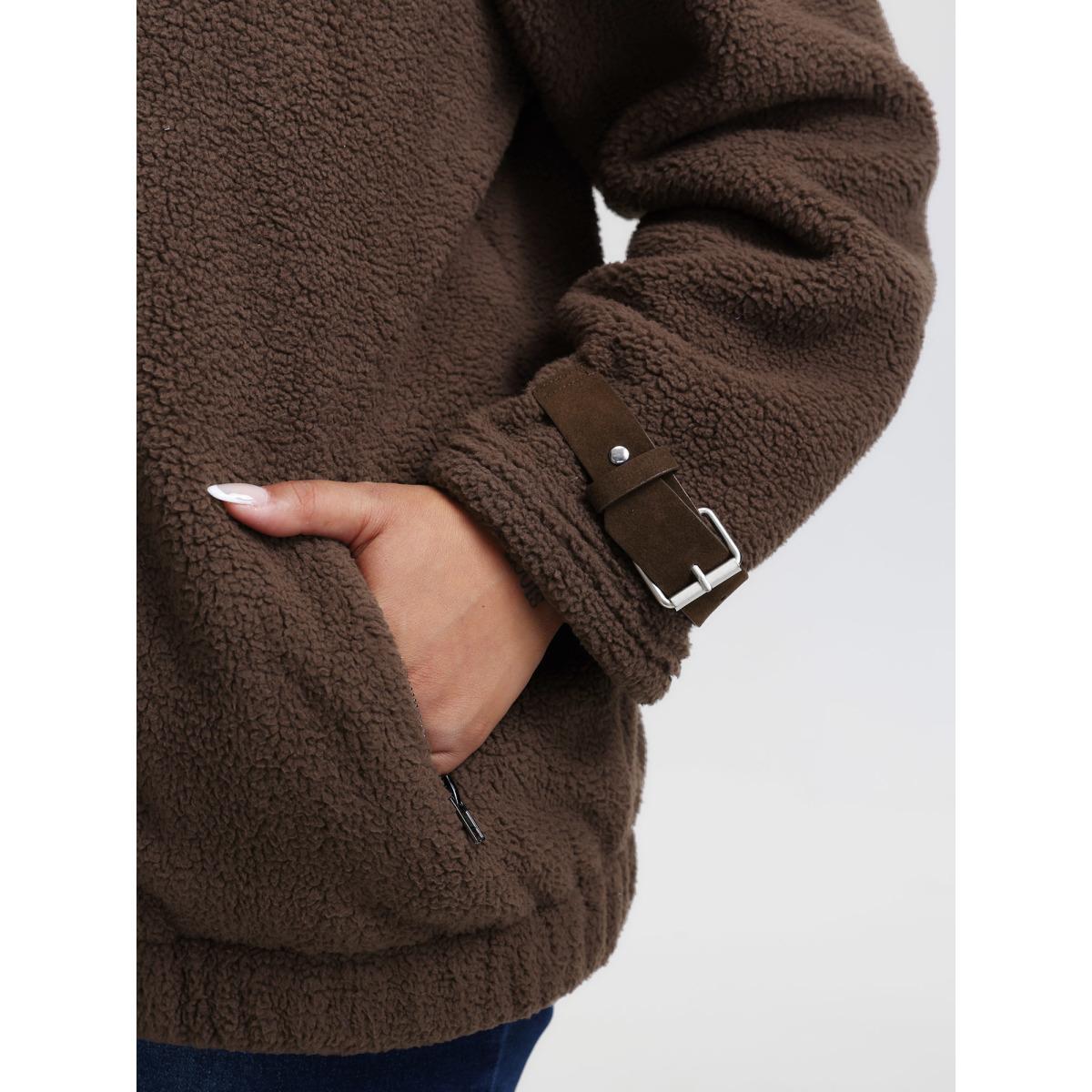Plus Size Fuzzy Trim Patchwork Zipper Drawstring Buckle Detail Jacket Women DarkBrown Elastic cuffs Pocket Dailywear Jackets BloomChic 26/4X