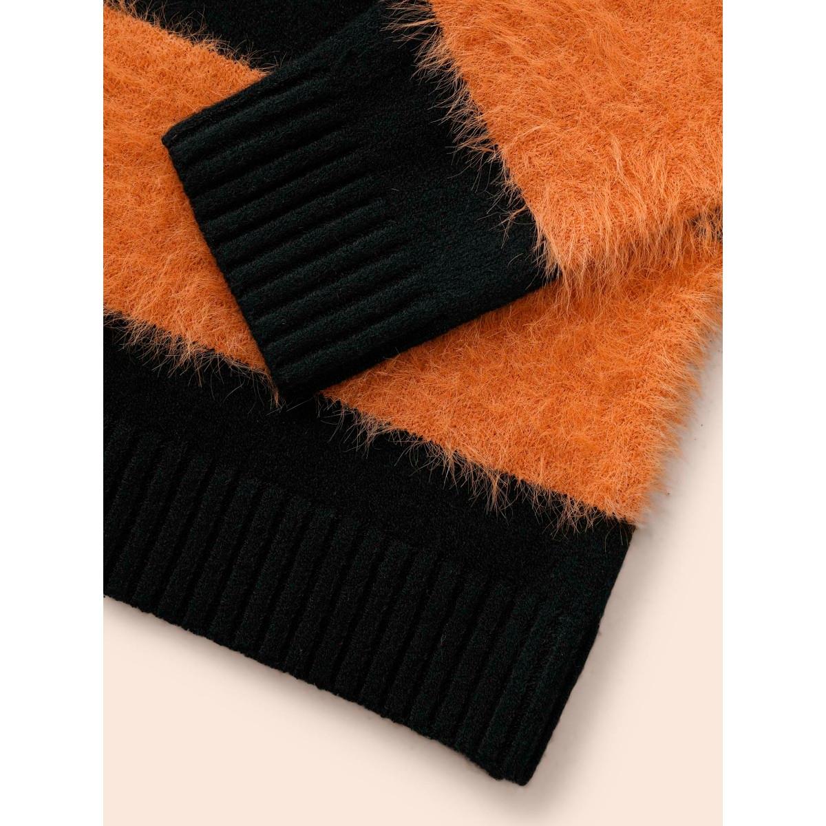 Plus Size Colorblock Contrast Pointelle Knit Pullover OrangeRed Women Casual Long Sleeve V-neck Everyday Pullovers BloomChic 14-16/1X