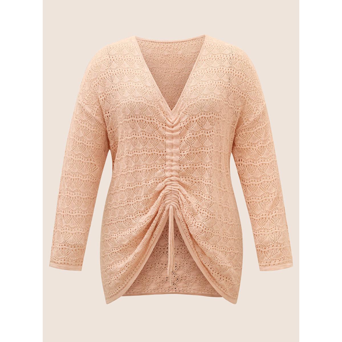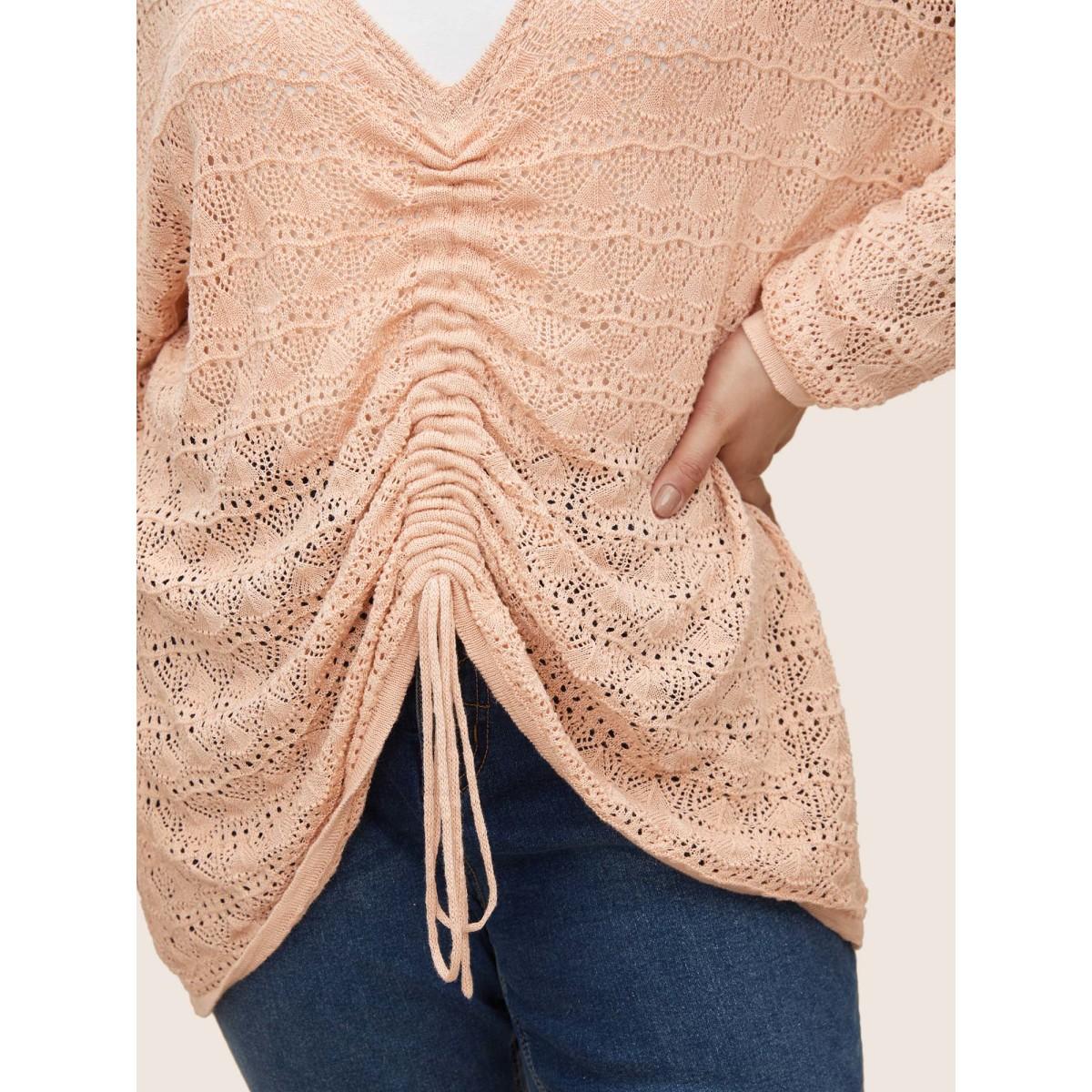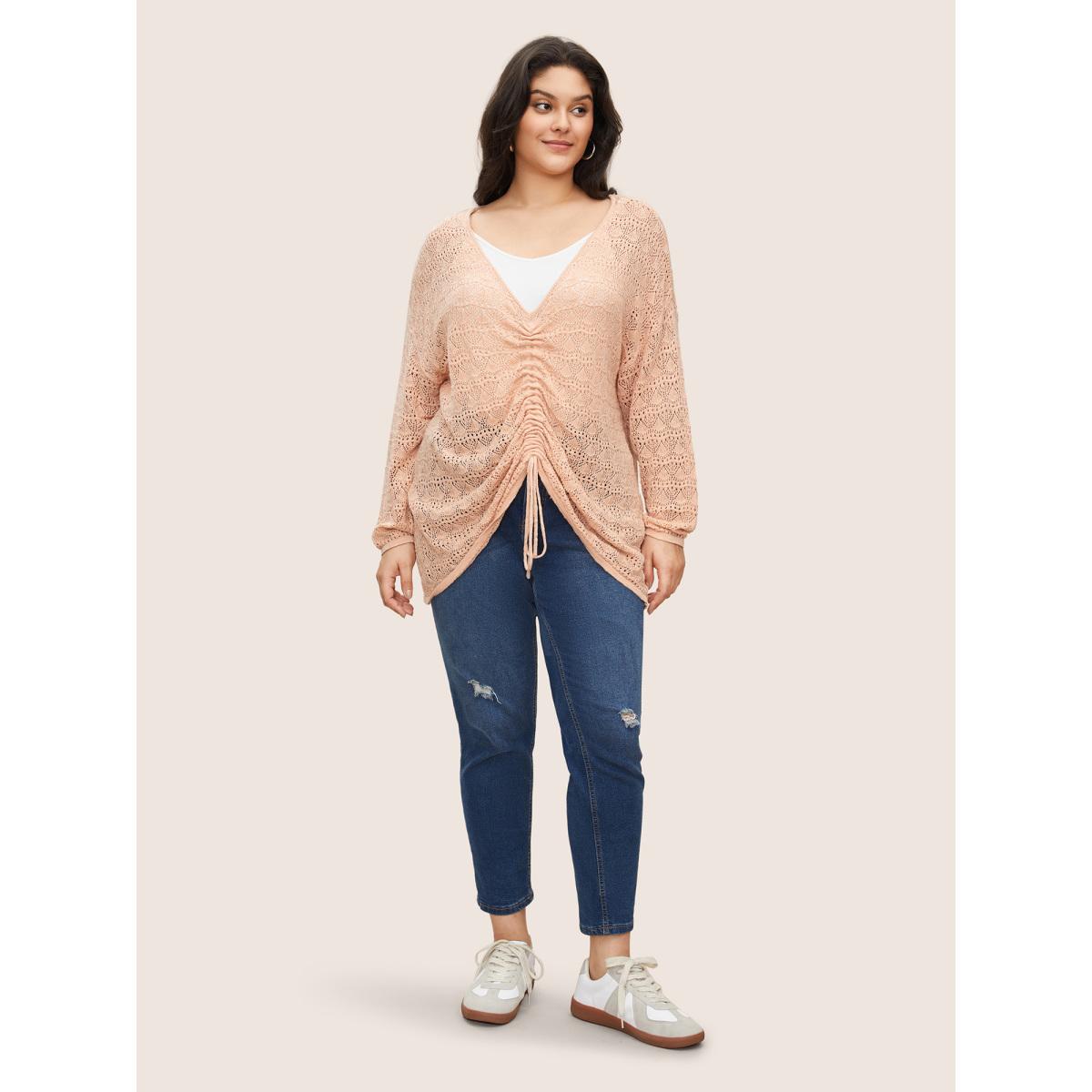 Plus Size Texture Drawstring Shoulder Sleeve Pullover Coral Women Casual Long Sleeve Deep V-neck Everyday Pullovers BloomChic 30/6X