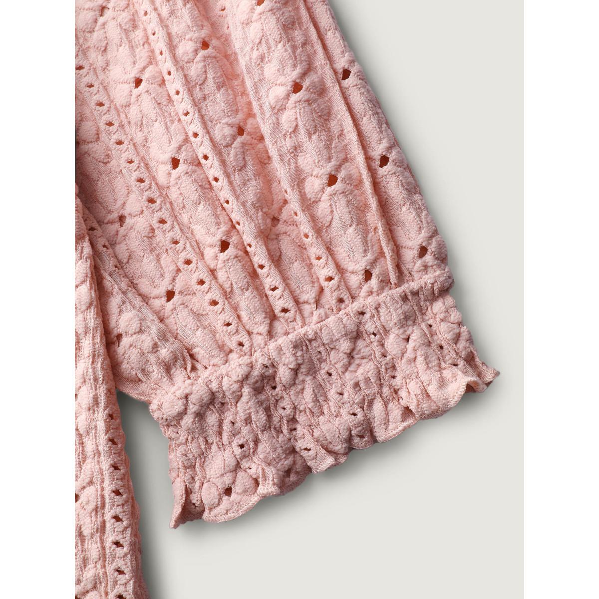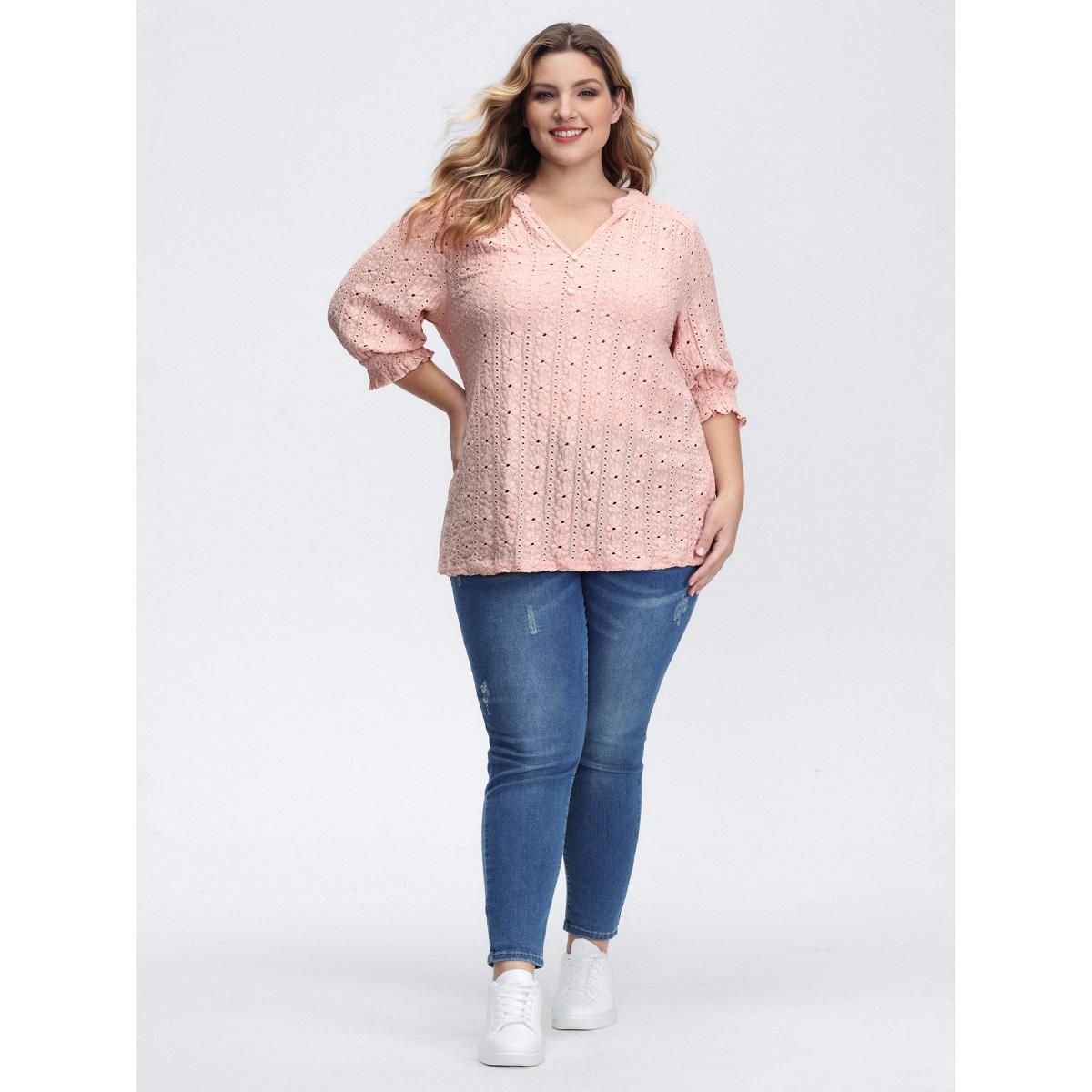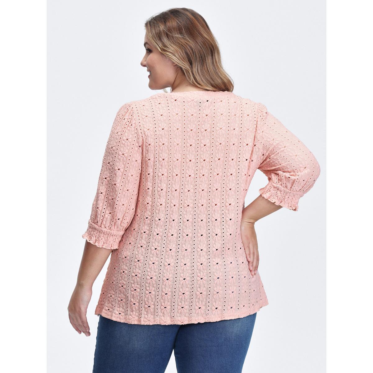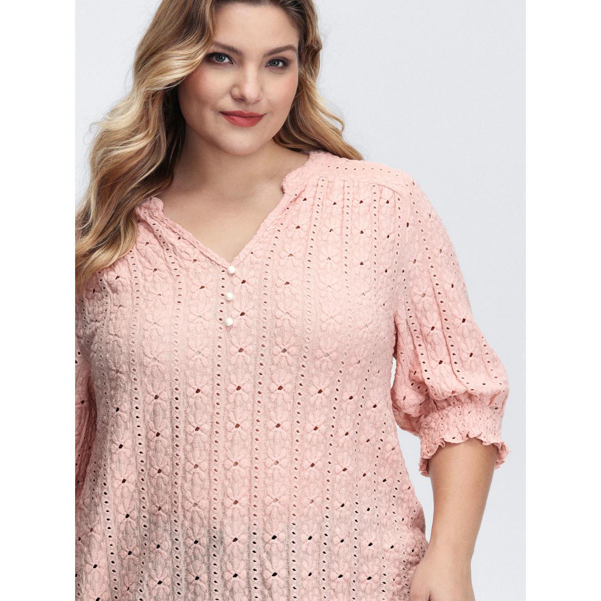 Plus Size Texture Shirred Sleeve Cut Out T-Shirt MistyRose Women Leisure Texture Flat collar with V-notch Casual T-shirts BloomChic 12/L