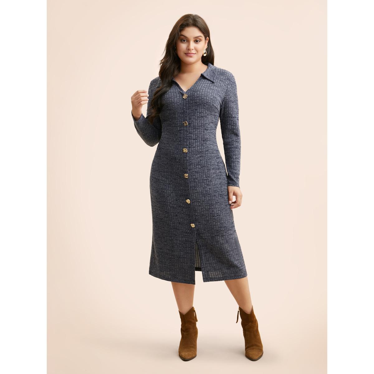 Plus Size Textured Buckle Detail Split Hem Dress Indigo Women At the Office Texture Shirt collar Long Sleeve Curvy BloomChic 30/6X