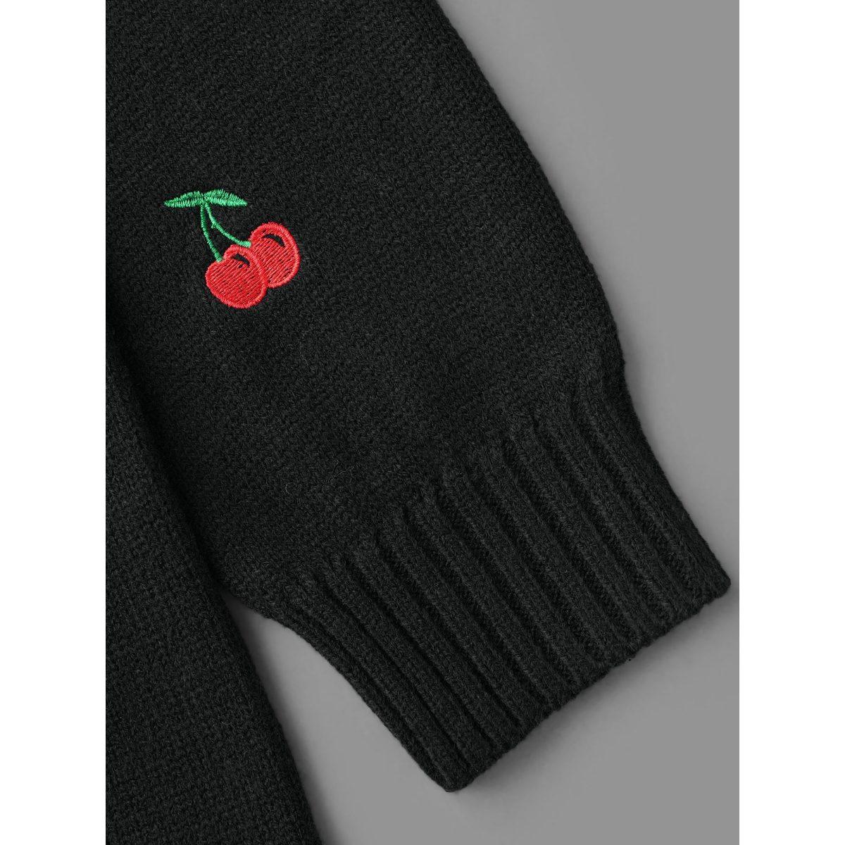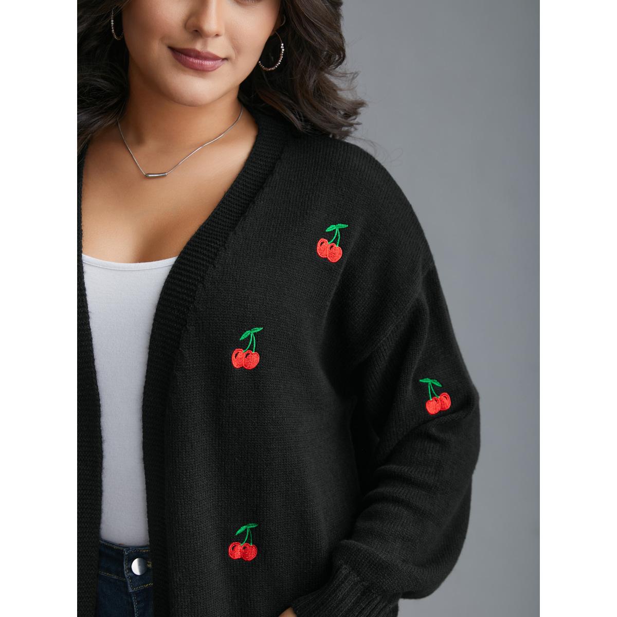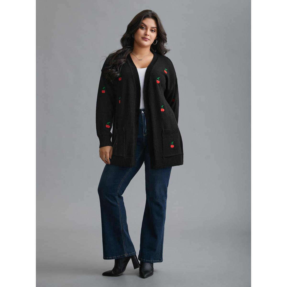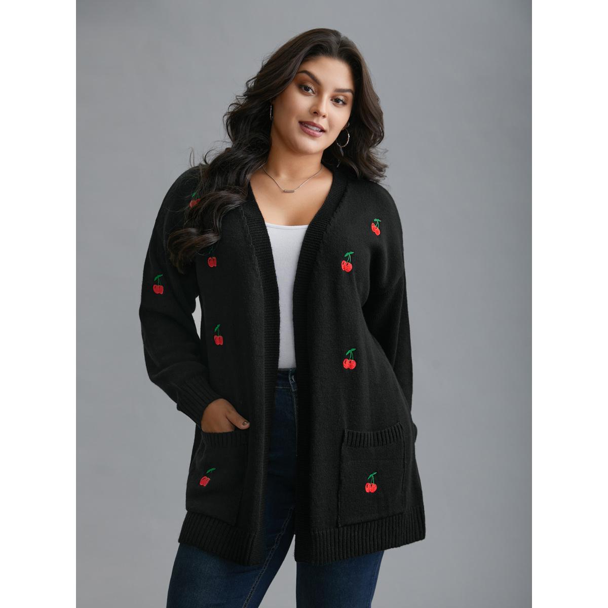 Plus Size Textured Cherry Embroidery Pocket Pullover Black Women Casual Loose Long Sleeve Everyday Cardigans BloomChic 14-16/1X