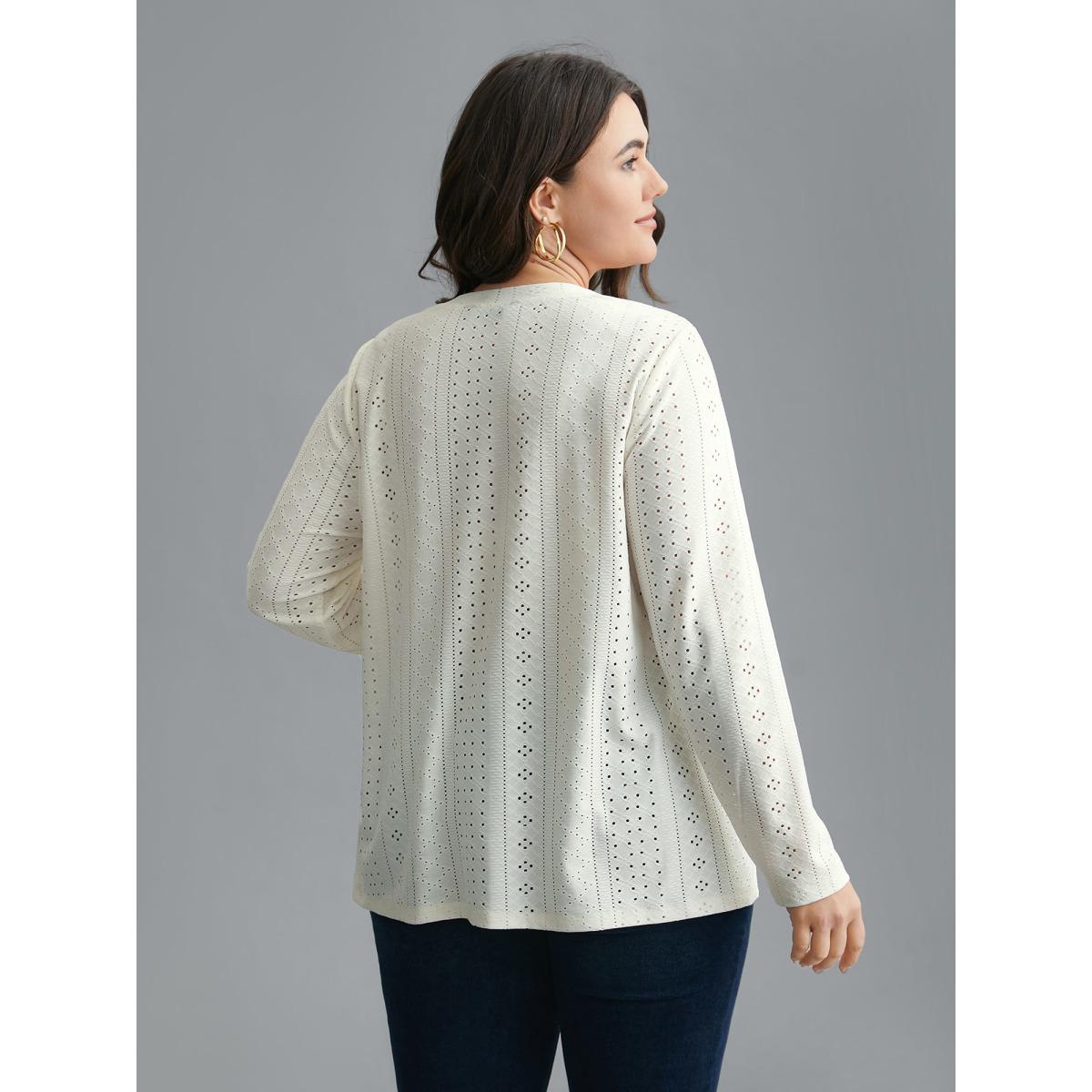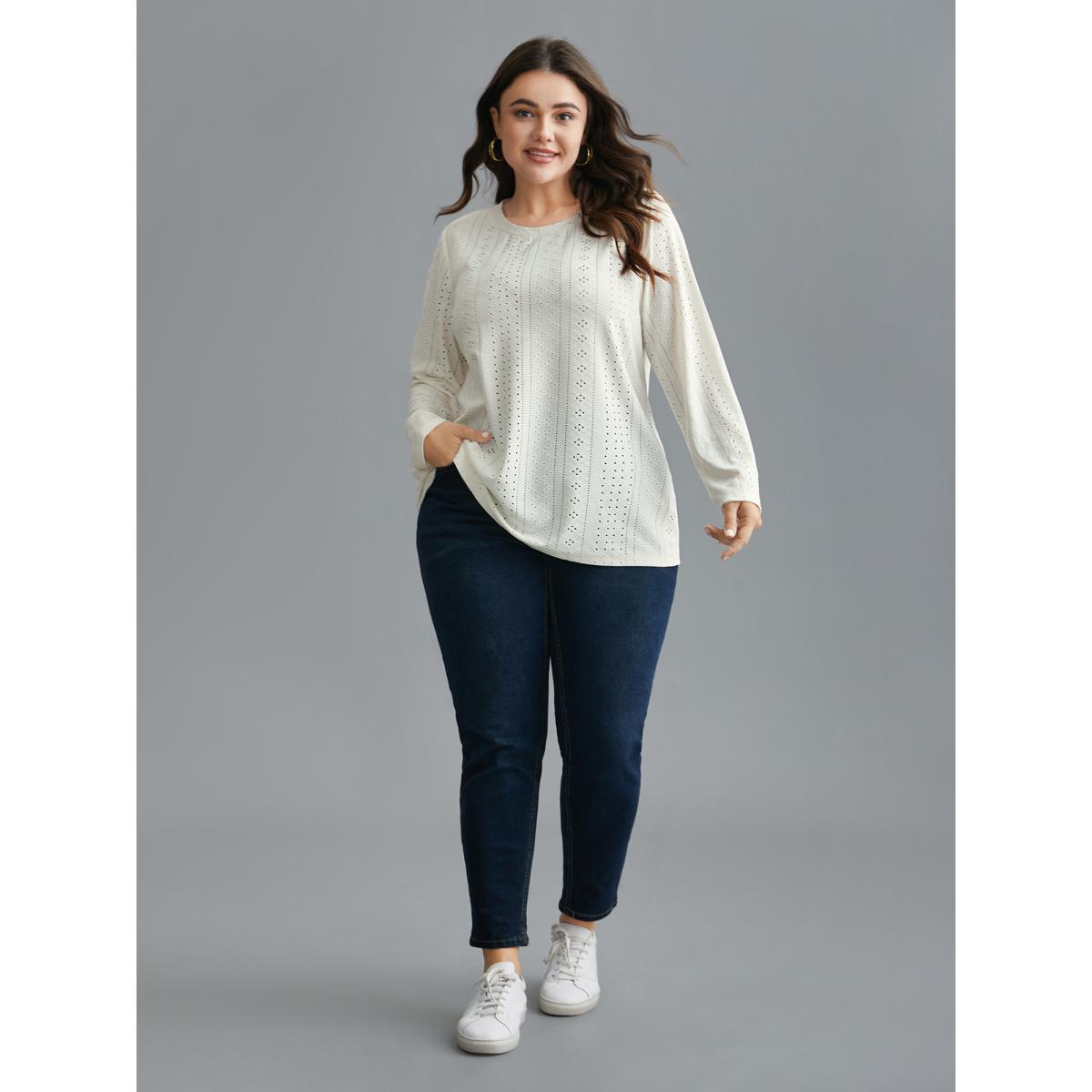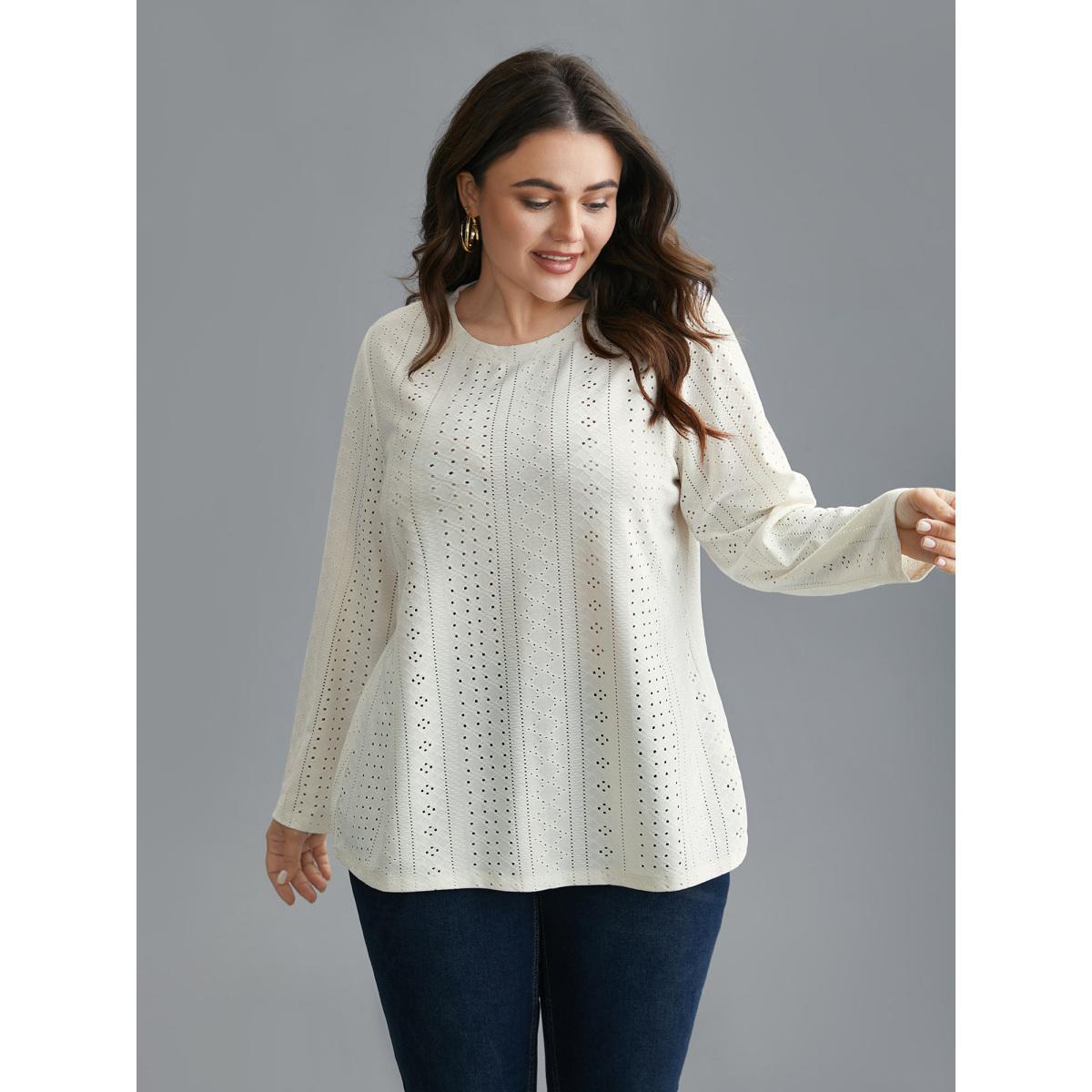 Plus Size Textured Cut-out Elastic Round Neck T-shirt Ivory Women Casual Texture Round Neck Everyday T-shirts BloomChic 10/M