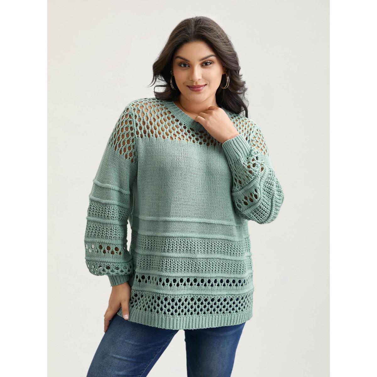 Plus Size Cable Knit Lantern Sleeve Drop Shoulder Pullover Mint Women Casual Loose Long Sleeve V-neck Dailywear Pullovers BloomChic 30/6X