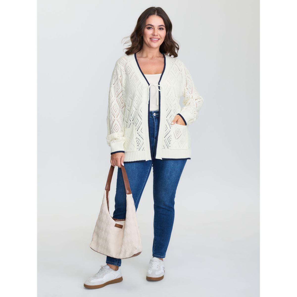 Plus Size Cut-Out Neck Tie Knit Cardigan Ivory Women Casual Loose Long Sleeve Everyday Cardigans BloomChic 22-24/3X
