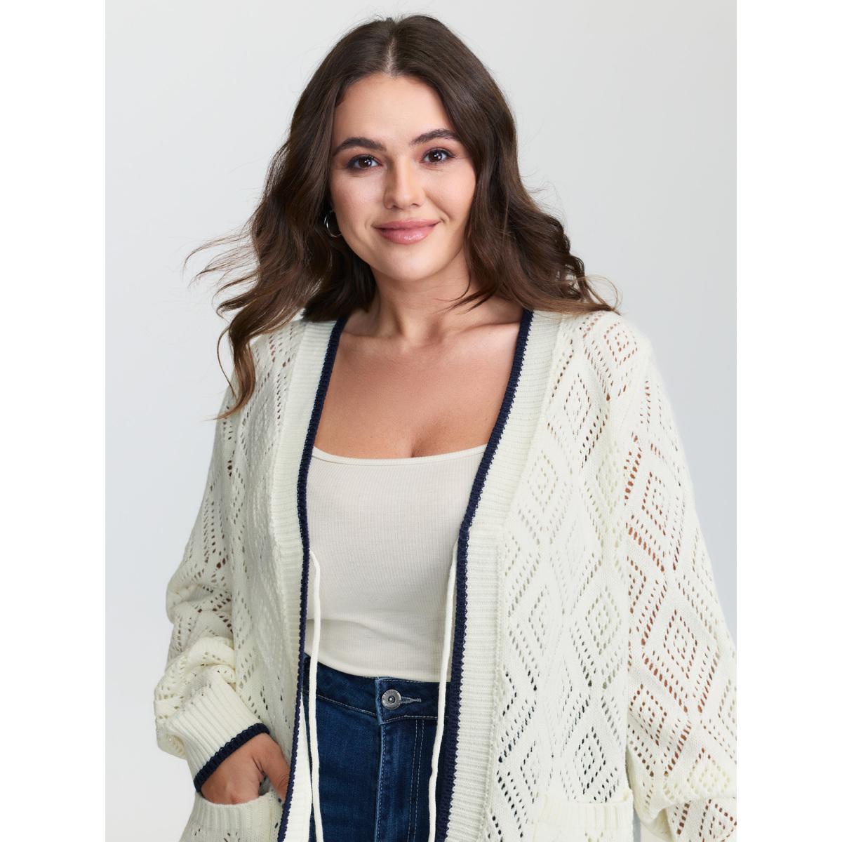Plus Size Textured Cut-Out Tie-Front Knit Cardigan Ivory Women Leisure Loose Long Sleeve Casual Cardigans BloomChic 14-16/1X