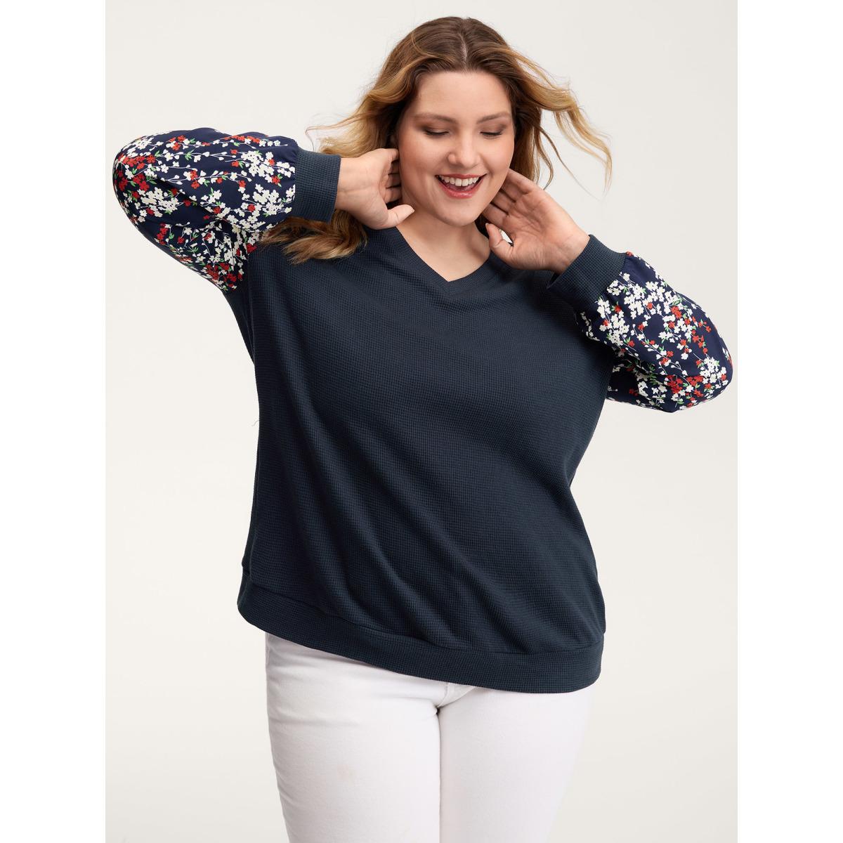 Plus Size Textured Floral Sleeve V-Neck Sweatshirt Women Indigo Leisure Texture V-neck Casual Sweatshirts BloomChic 26/4X