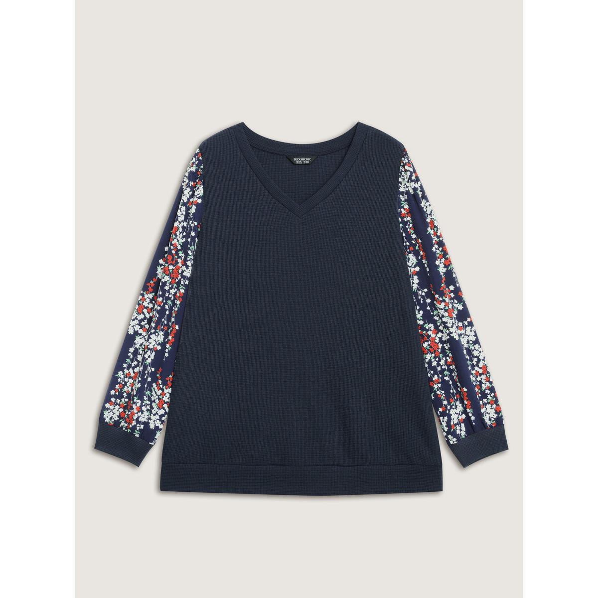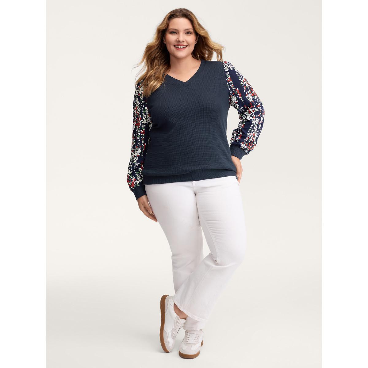 Plus Size Textured Floral Sleeve V-Neck Sweatshirt Women Indigo Leisure Texture V-neck Casual Sweatshirts BloomChic 26/4X Product Image