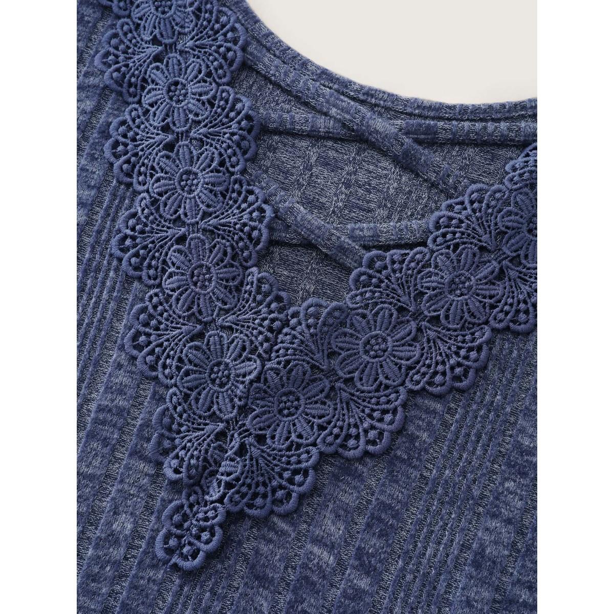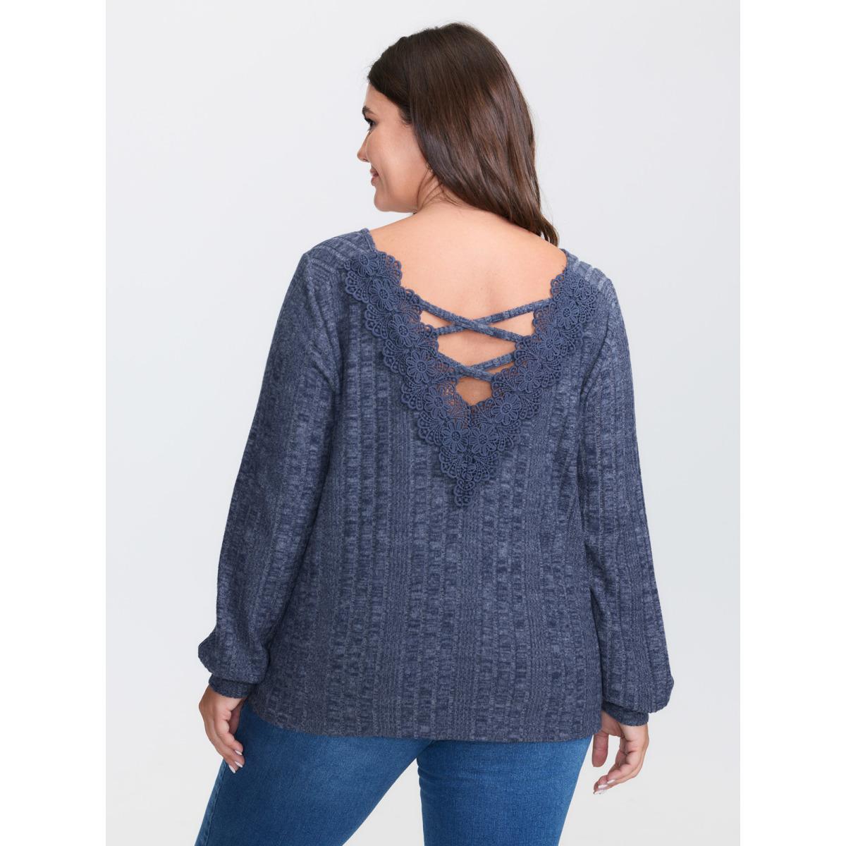 Plus Size Patchwork Lace Panel V Neck Waffle Knit Sweatshirt Women Blue Elegant Rib Knit V-neck Dailywear Sweatshirts BloomChic 14-16/1X
