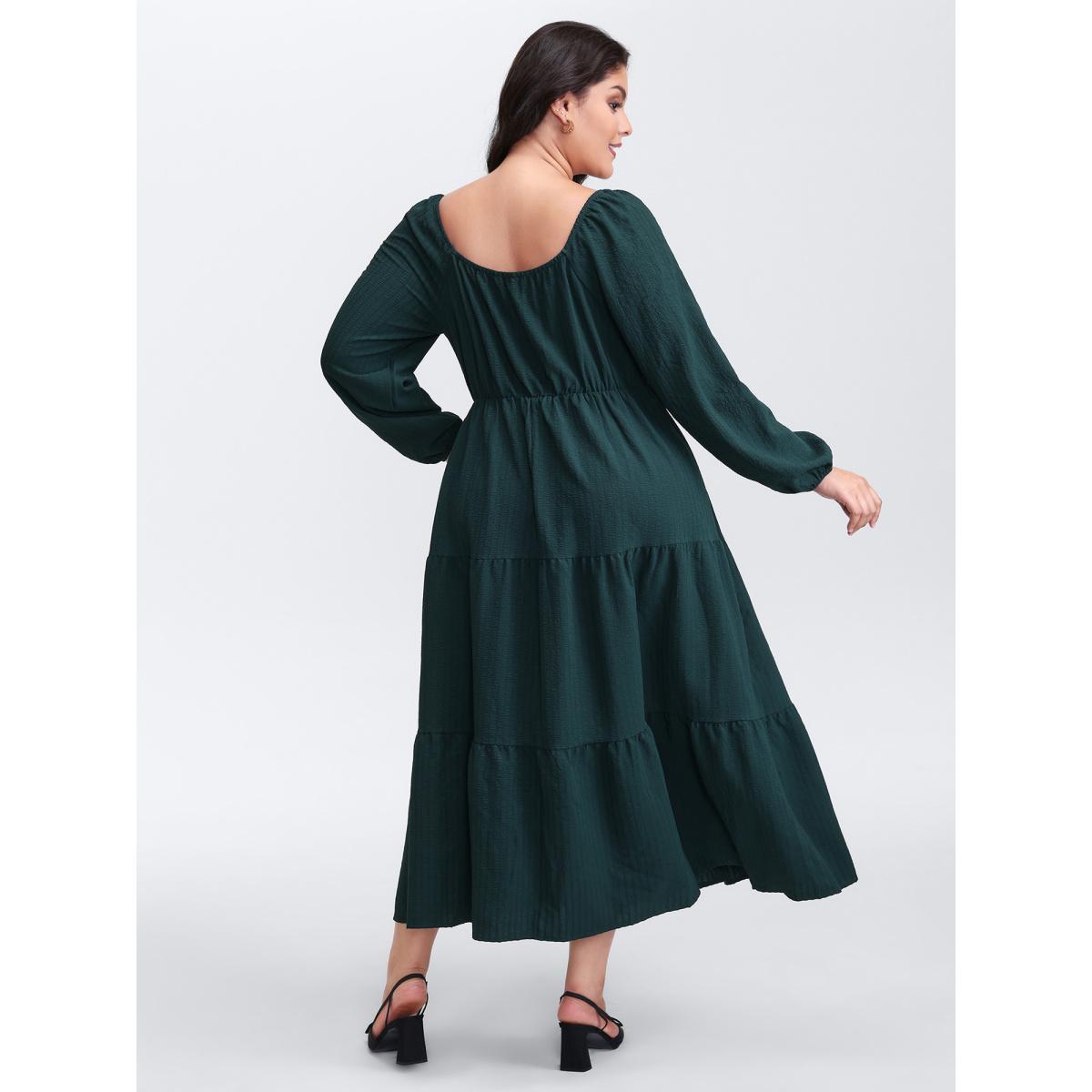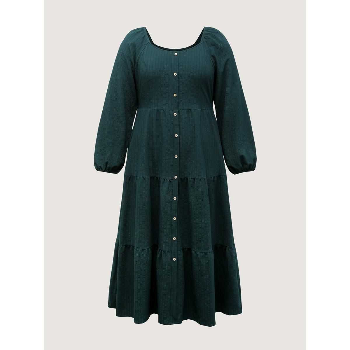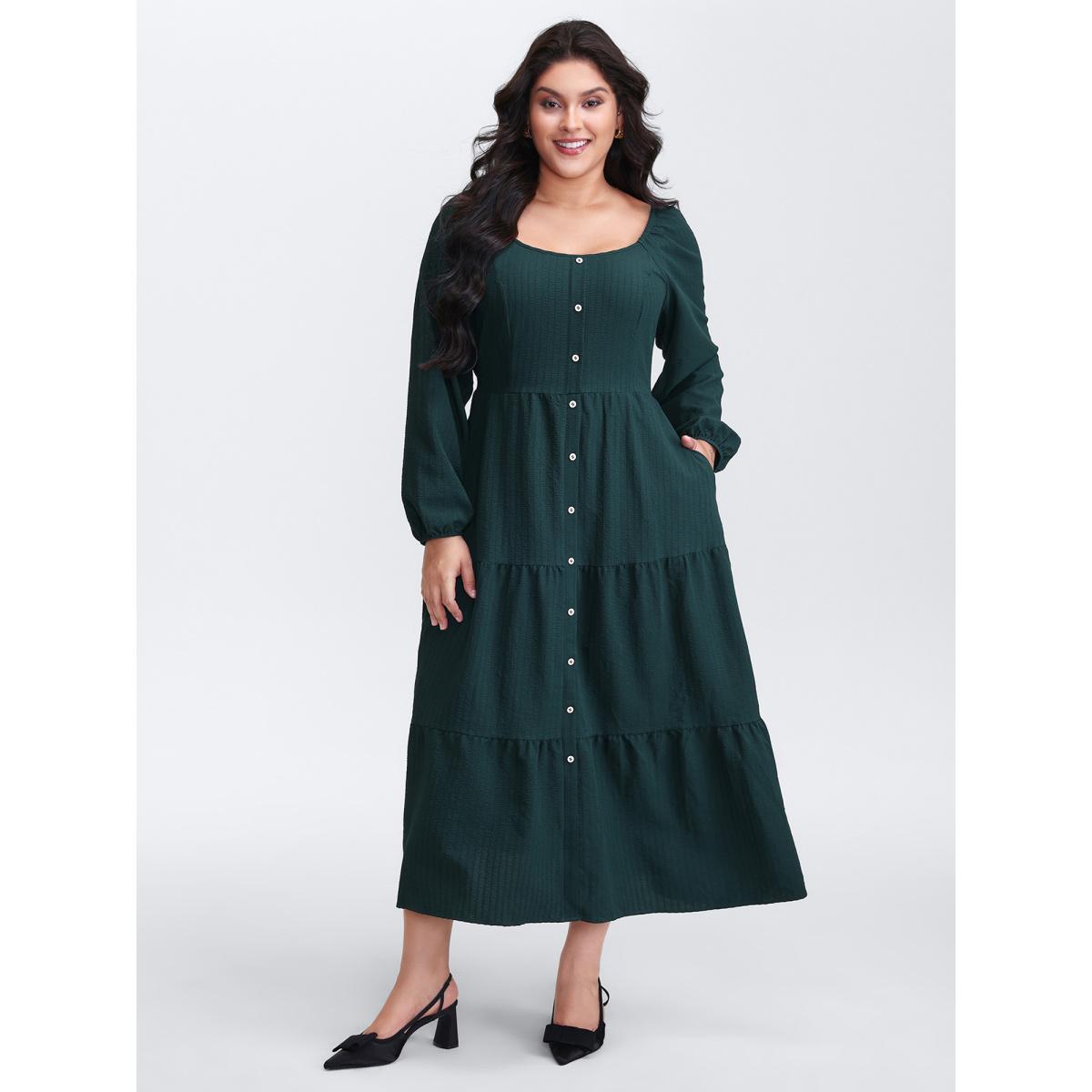 Plus Size Textured Pockets Button Detail Tiered Maxi Dress Cyan Women Timeless Texture U-neck Long Sleeve Curvy BloomChic 22-24/3X