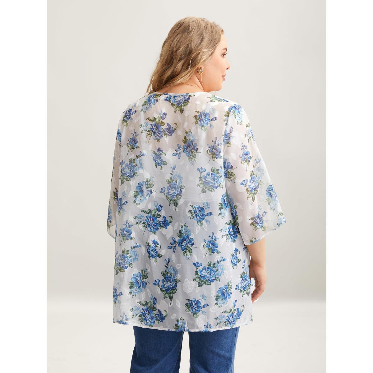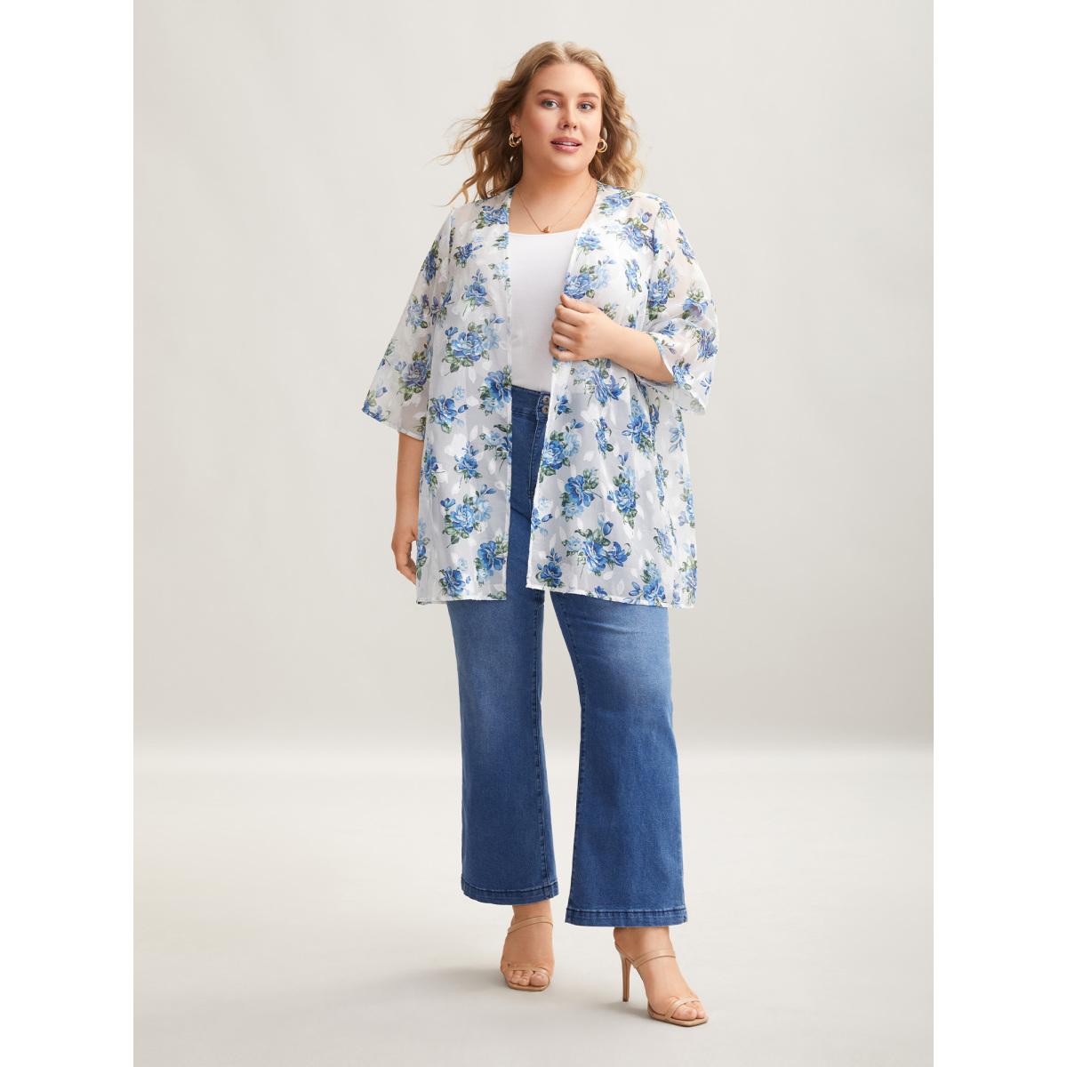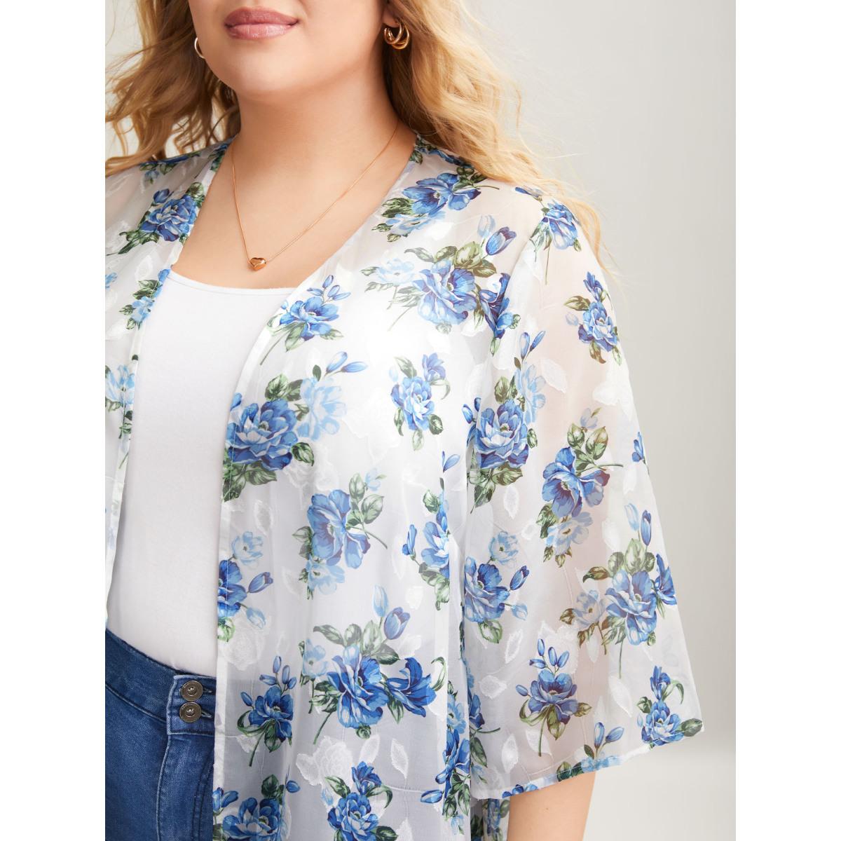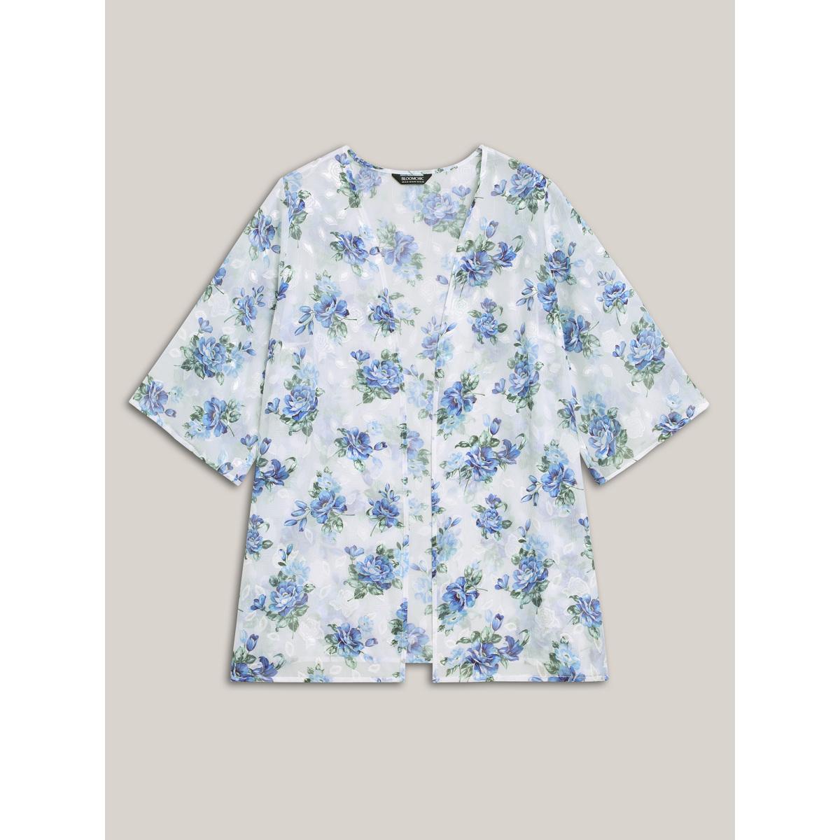Plus Size Textured Printed Puff Sleeve Kimono Cardigan Women Originalwhite Elegant Texture Loose Everyday Kimonos BloomChic 30/6X