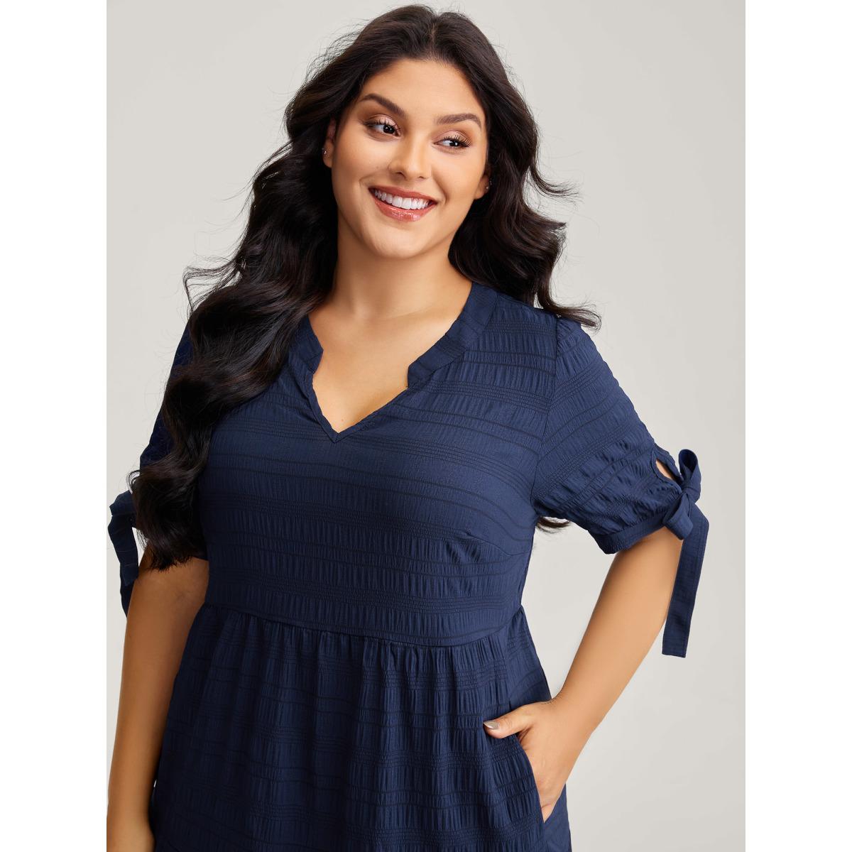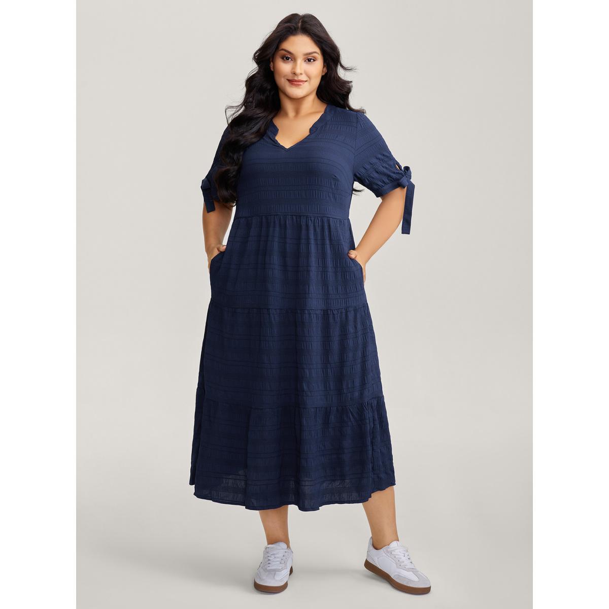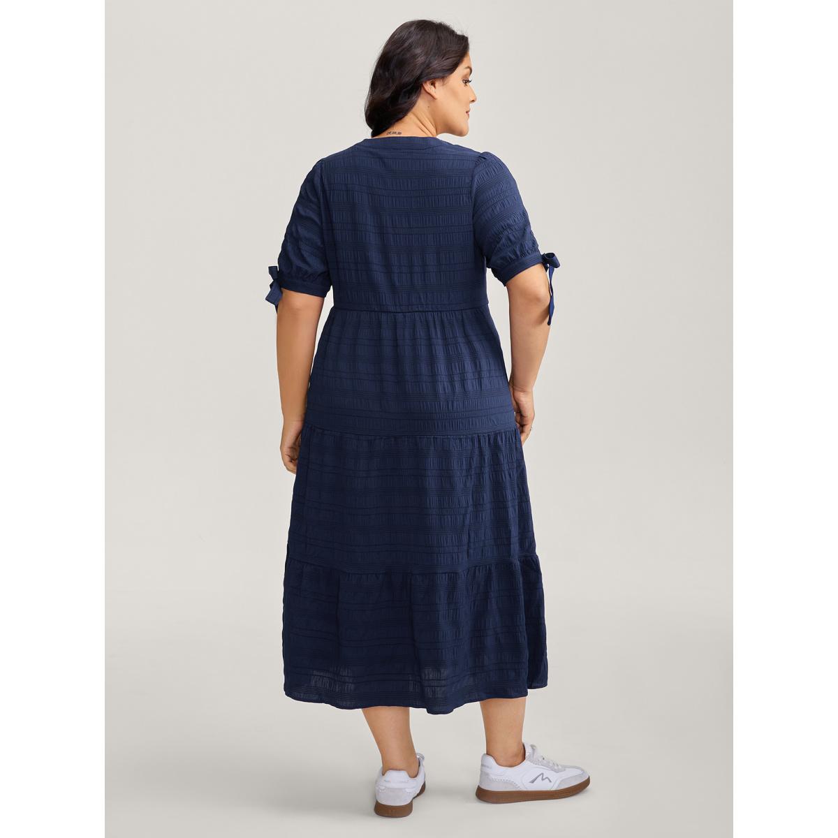 Plus Size Textured Sleeve-Tie Tiered Maxi Dress DarkBlue Women Leisure Tiered Flat collar with V-notch Half Sleeve Curvy BloomChic 14-16/1X