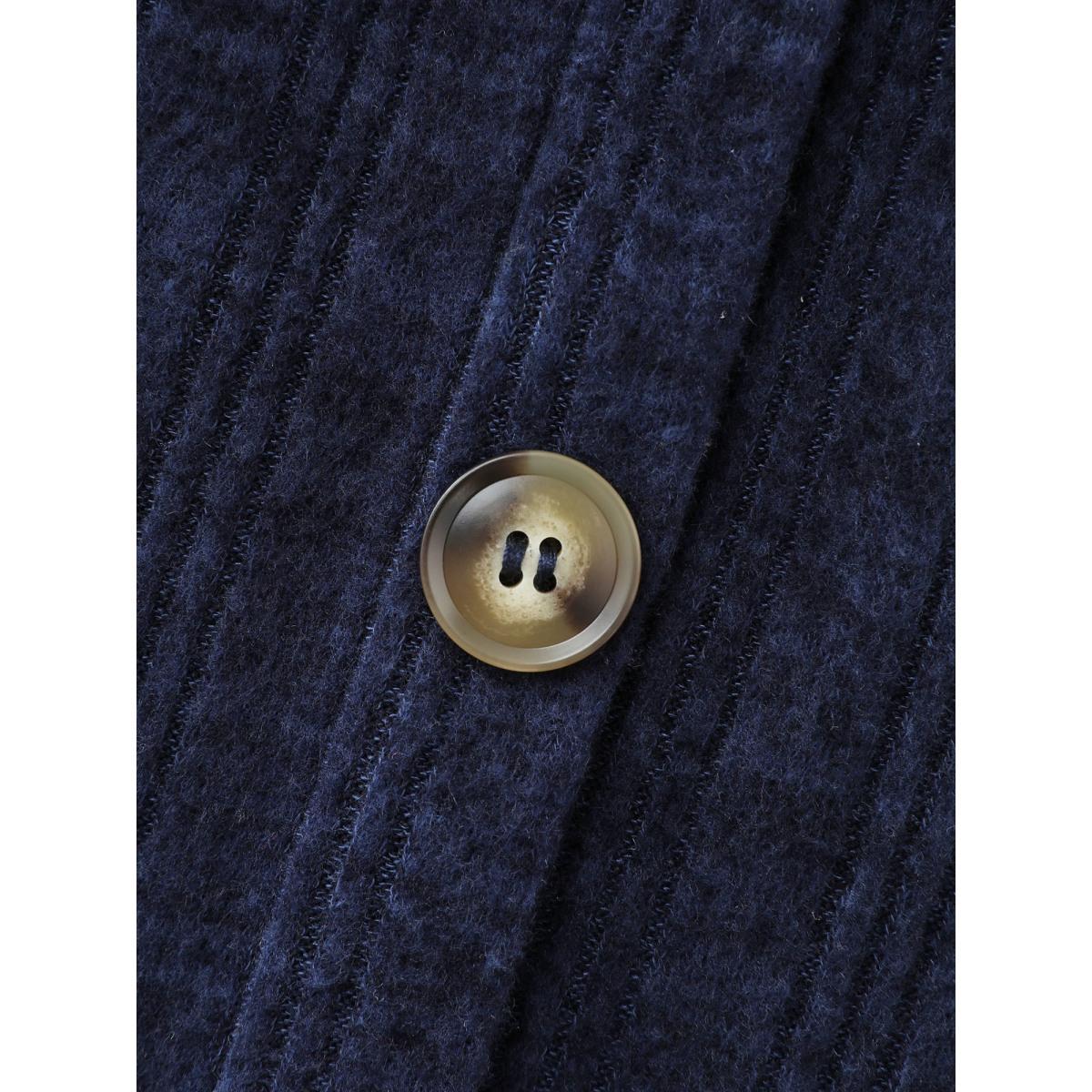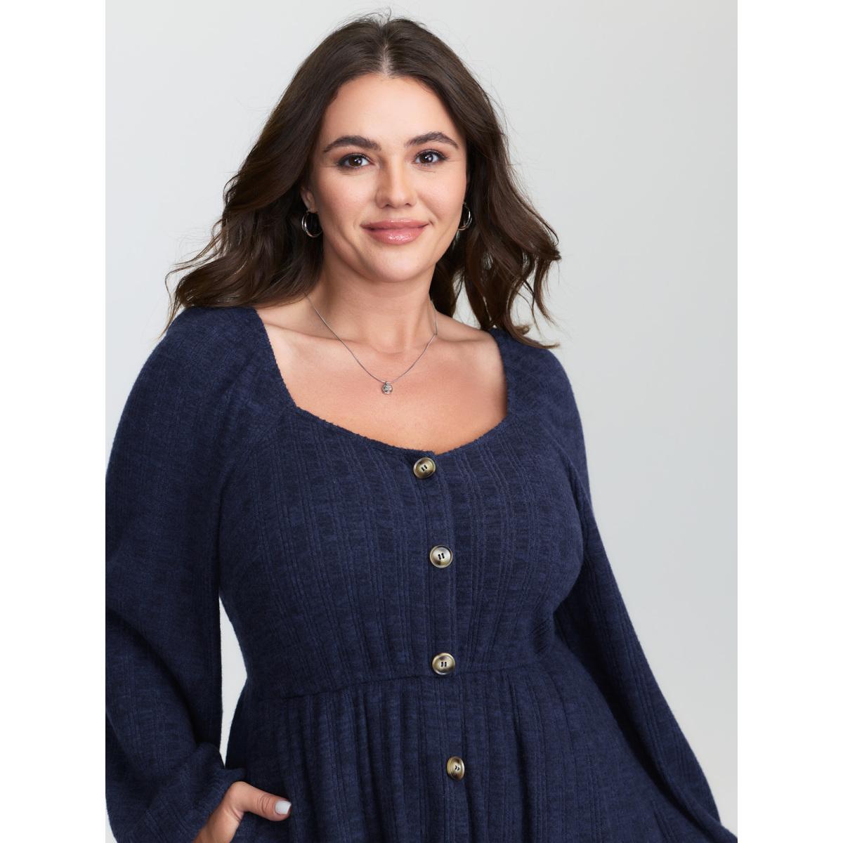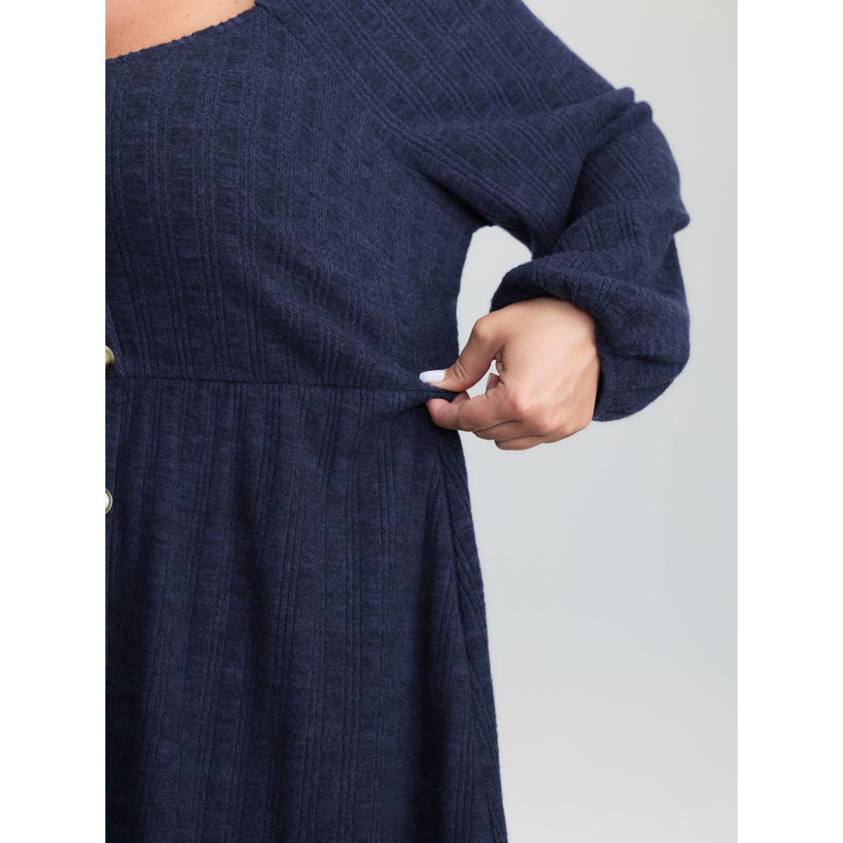 Plus Size Textured Stretchy Waist Button Detail Midi Dress DarkBlue Women Leisure Texture Heart neckline Extra Long Sleeve Curvy BloomChic 30/6X