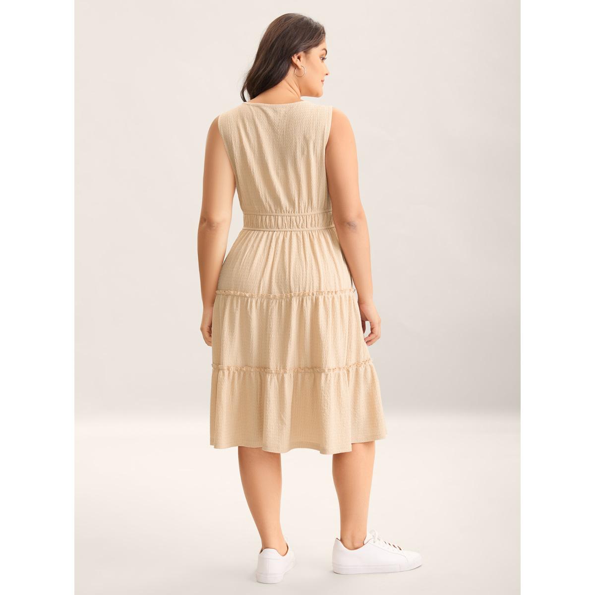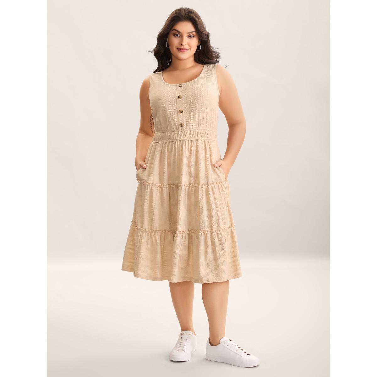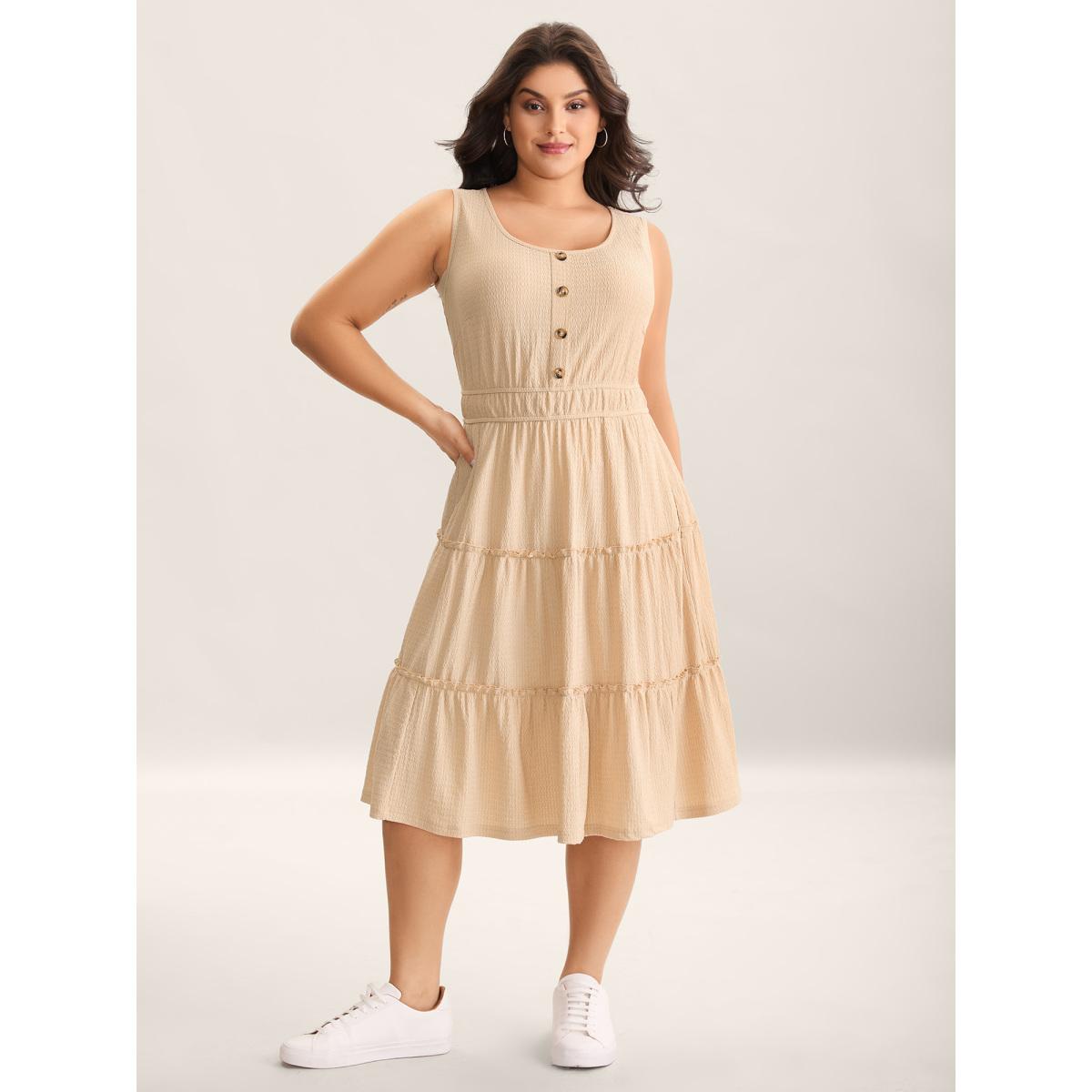 Plus Size Textured Stretchy Waist Button Midi Dress Wheat Women Non Sleeveless Curvy BloomChic 22-24/3X