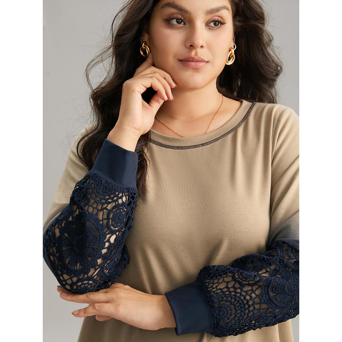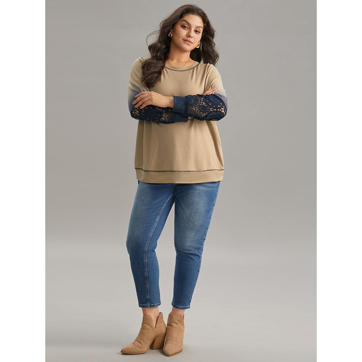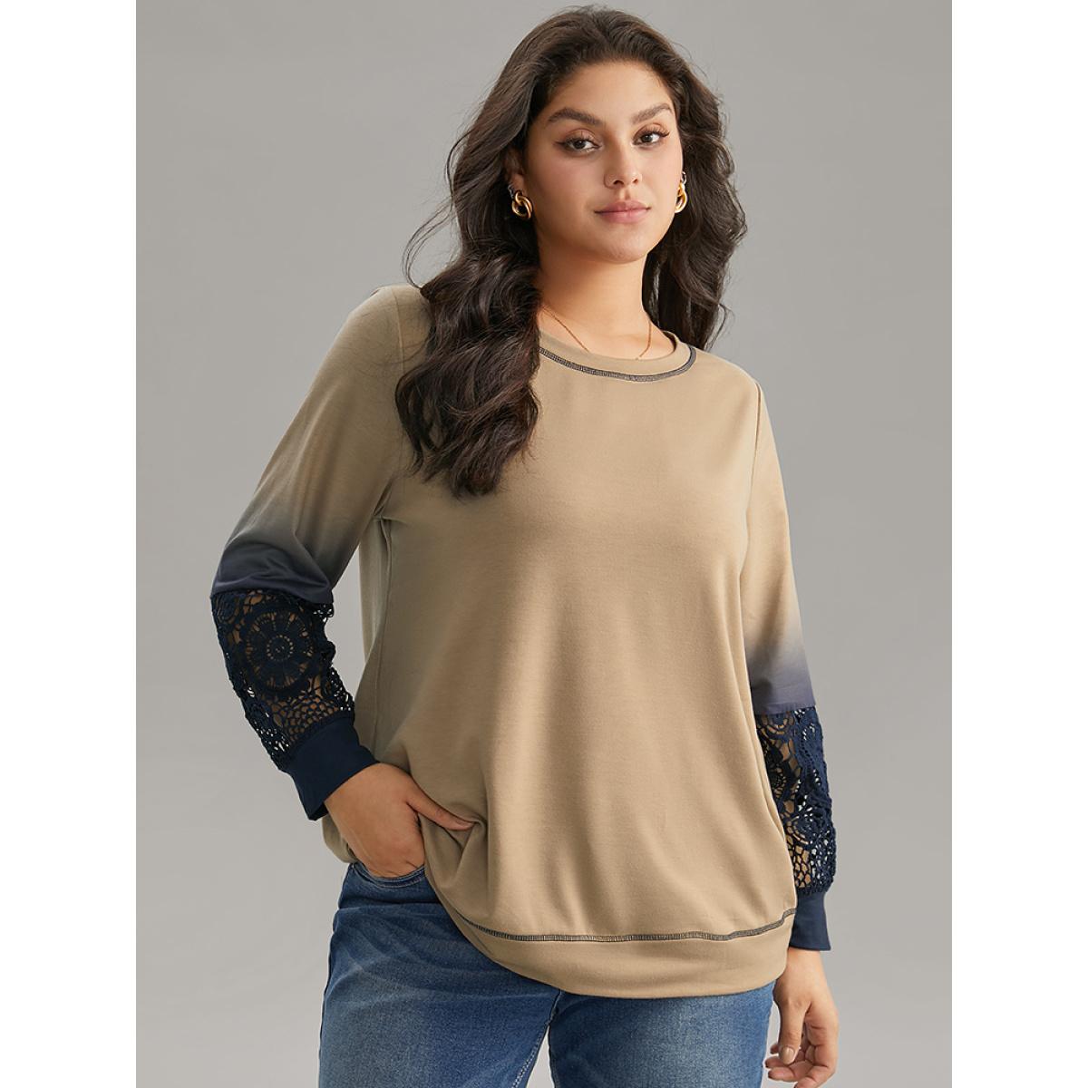 Plus Size Tie Dye Contrast Lace Panel Sweatshirt Women Tan Elegant Contrast Round Neck Dailywear Sweatshirts BloomChic 14-16/1X