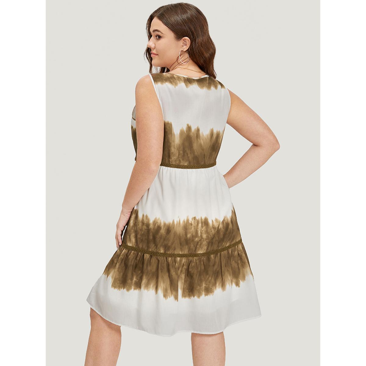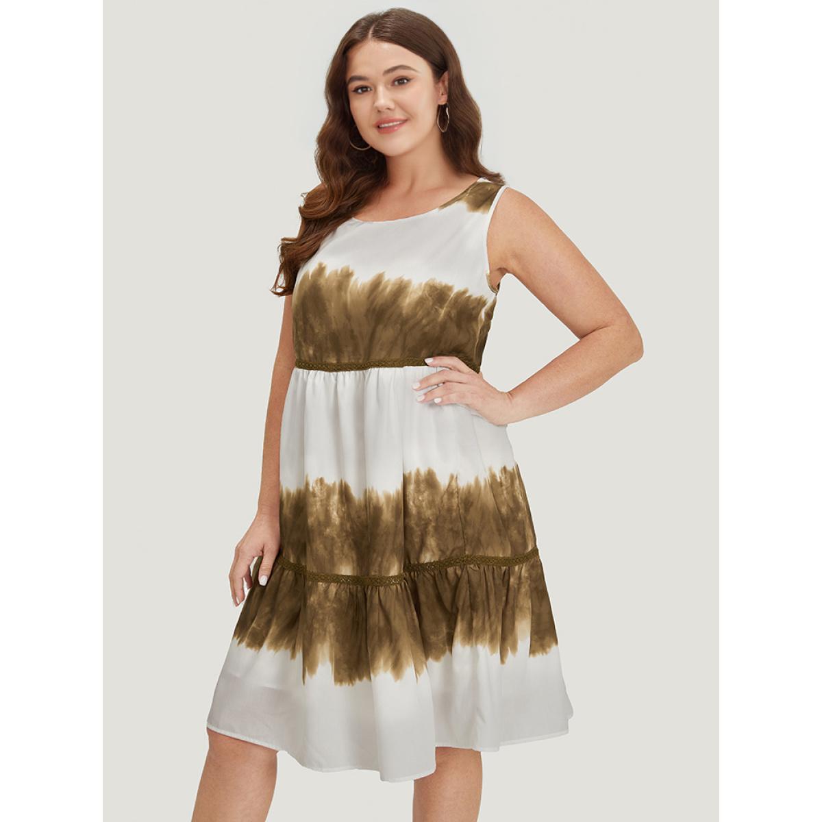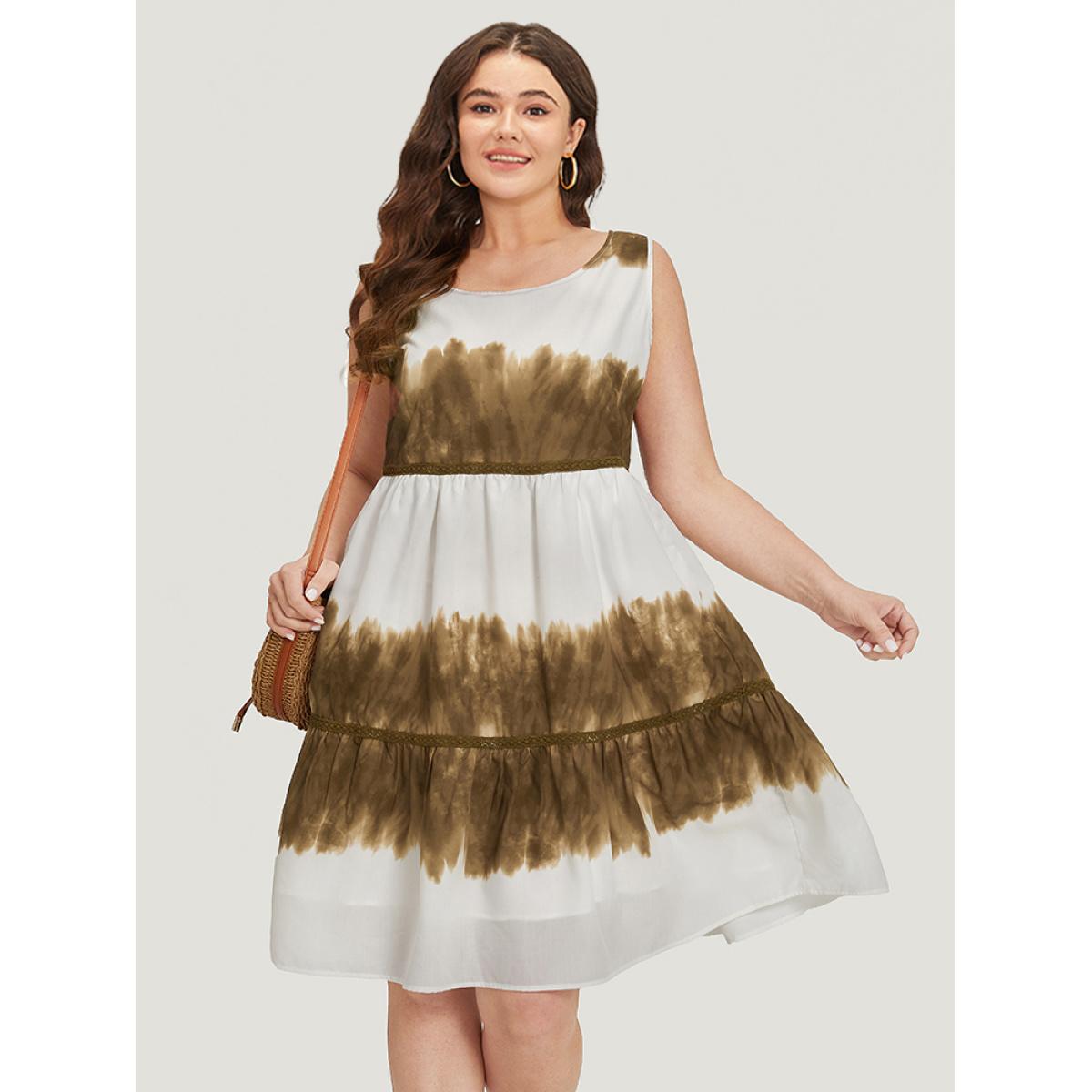 Plus Size Tie Dye Crochet Lace Ruffle Layered Hem Tank Dress Tan Women Elegant Patchwork Round Neck Sleeveless Curvy Knee Dress BloomChic 28/5X