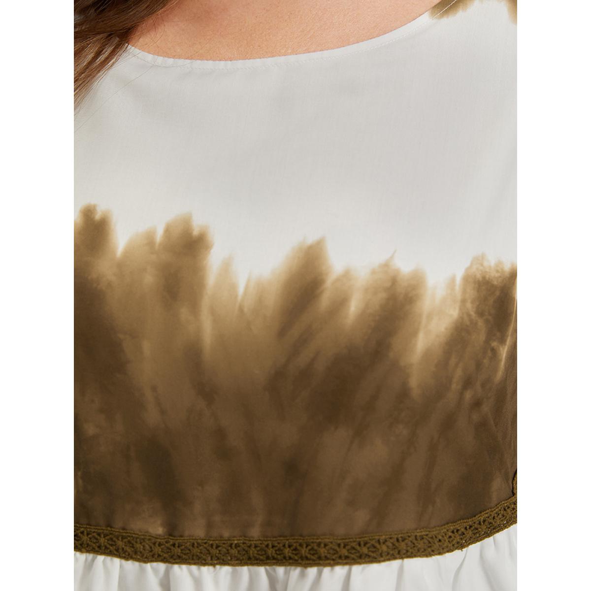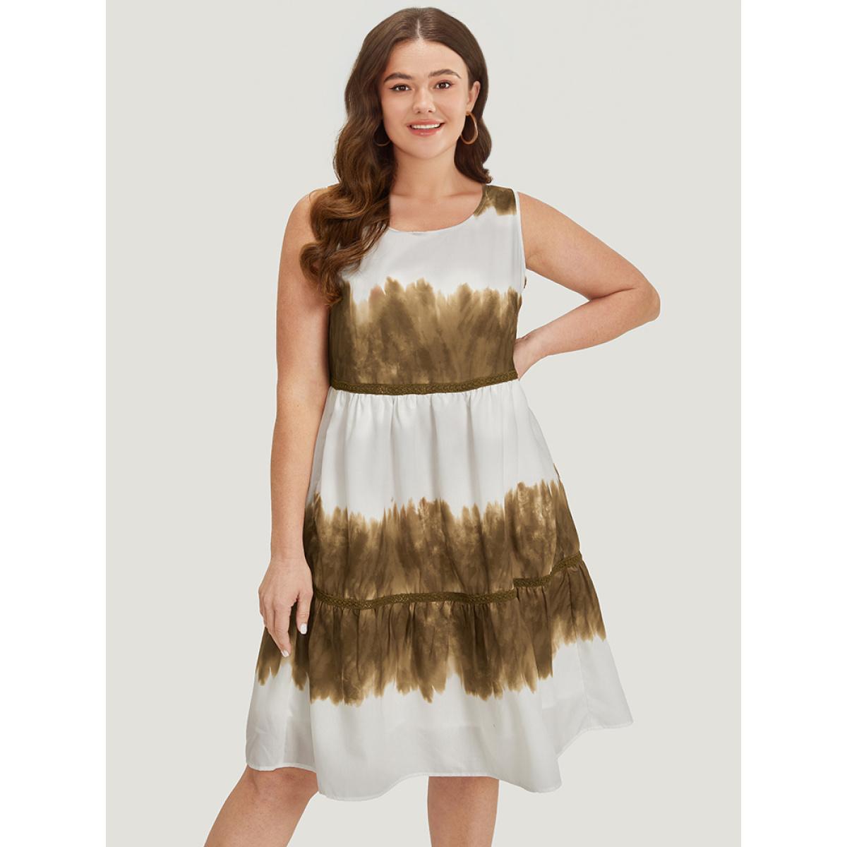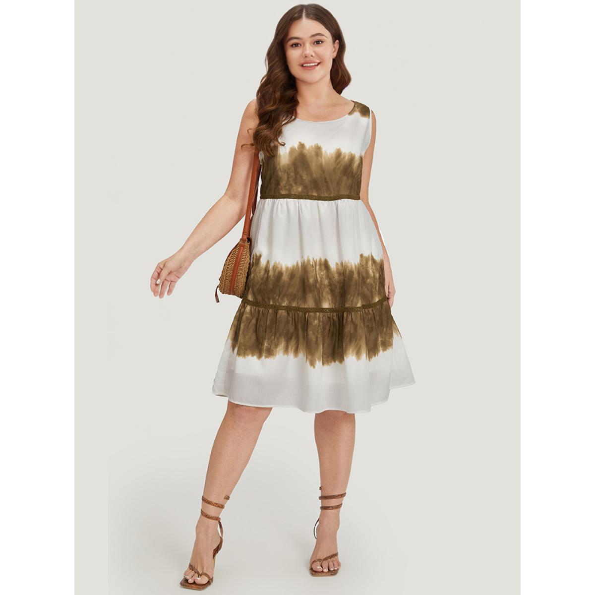 Plus Size Tie Dye Crochet Lace Ruffle Layered Hem Tank Dress Tan Women Elegant Patchwork Round Neck Sleeveless Curvy Knee Dress BloomChic 28/5X