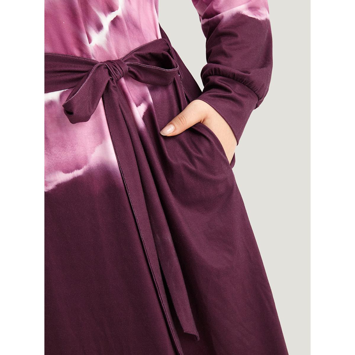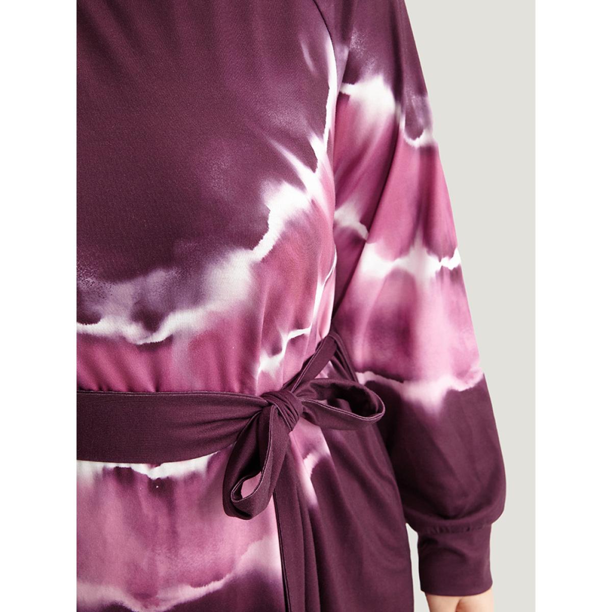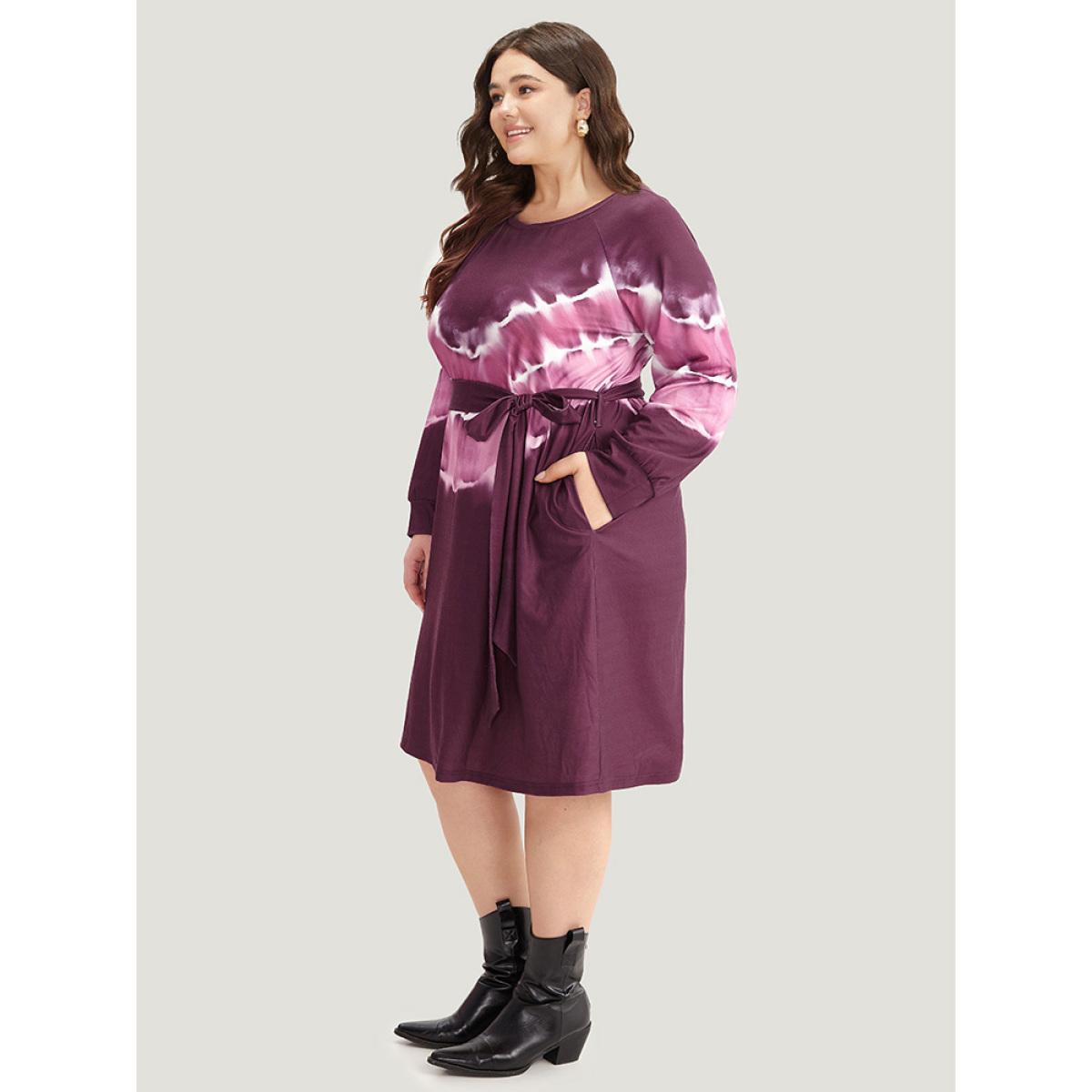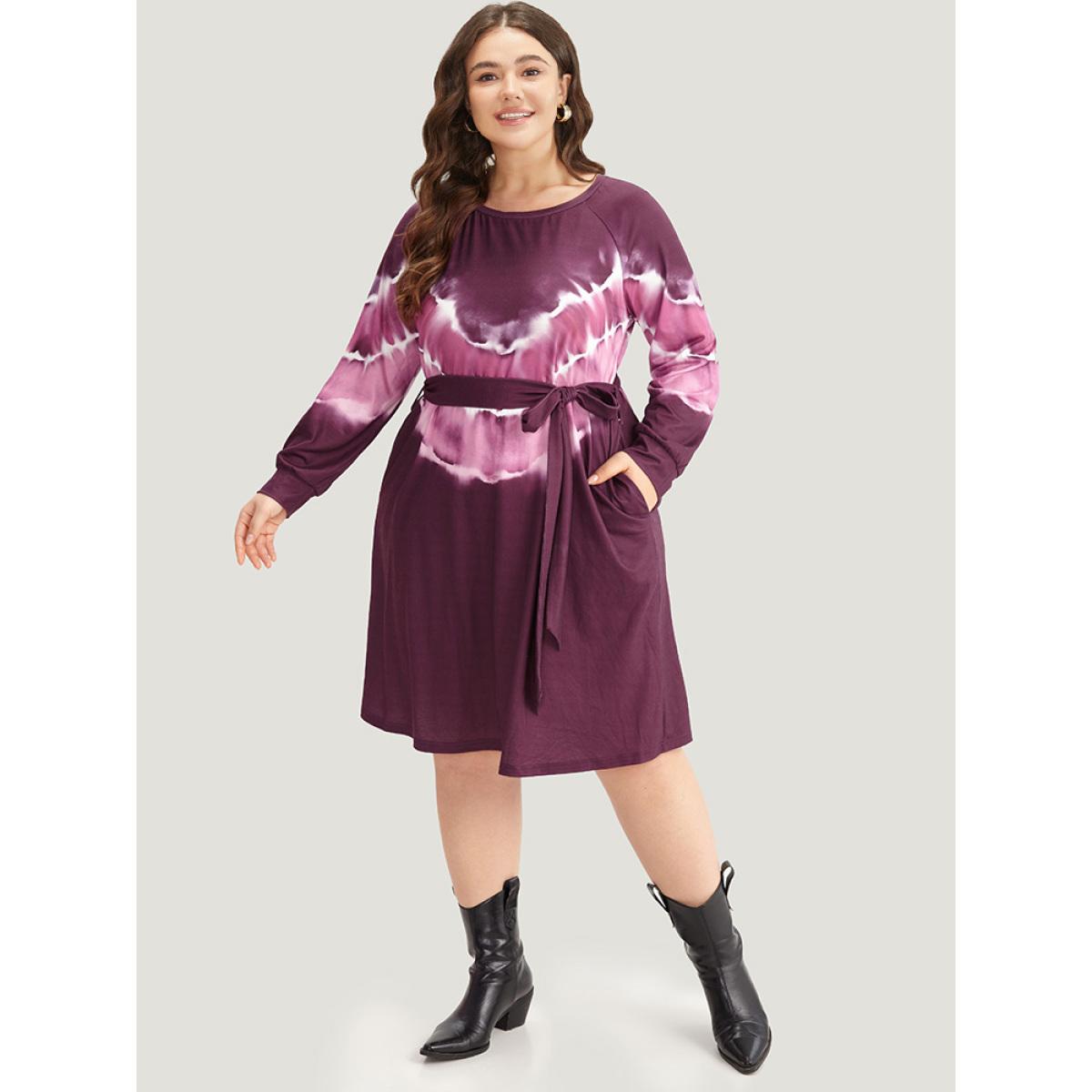 Plus Size Tie Dye Pocket Round Neck Belted Raglan Sleeve Dress Multicolor Women Casual Belted Round Neck Long Sleeve Curvy Knee Dress BloomChic 28/5X