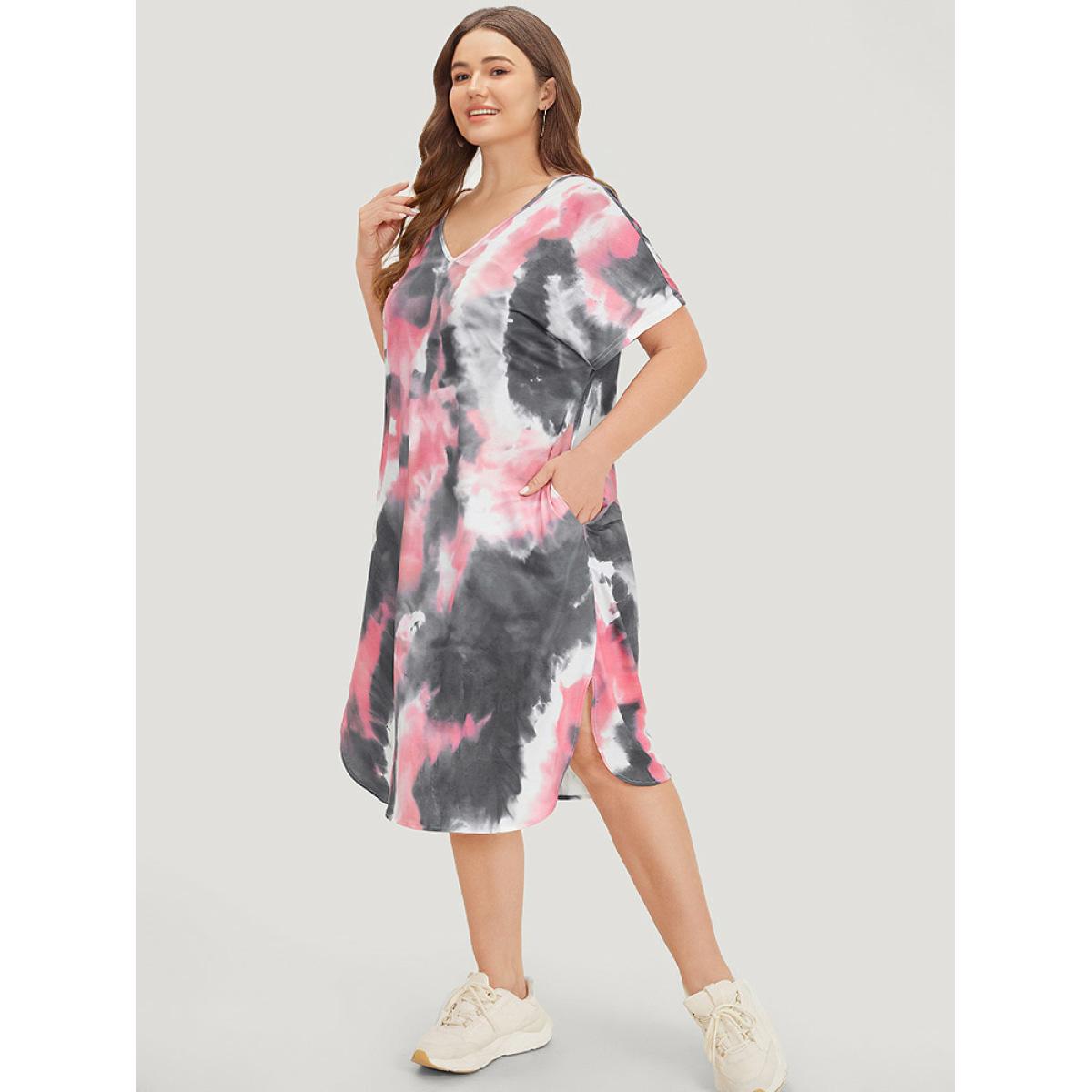 Plus Size Tie Dye Pocket Split Side Dolman Sleeve Dress Multicolor Women Casual Tie Dye V-neck Short sleeve Curvy Midi Dress BloomChic 28/5X