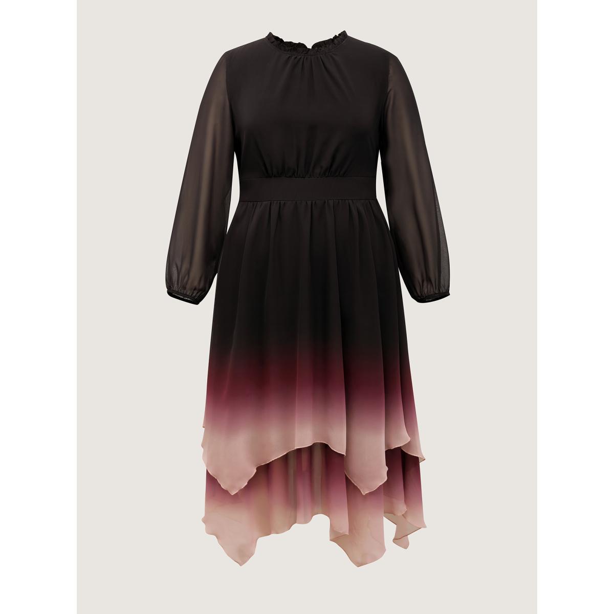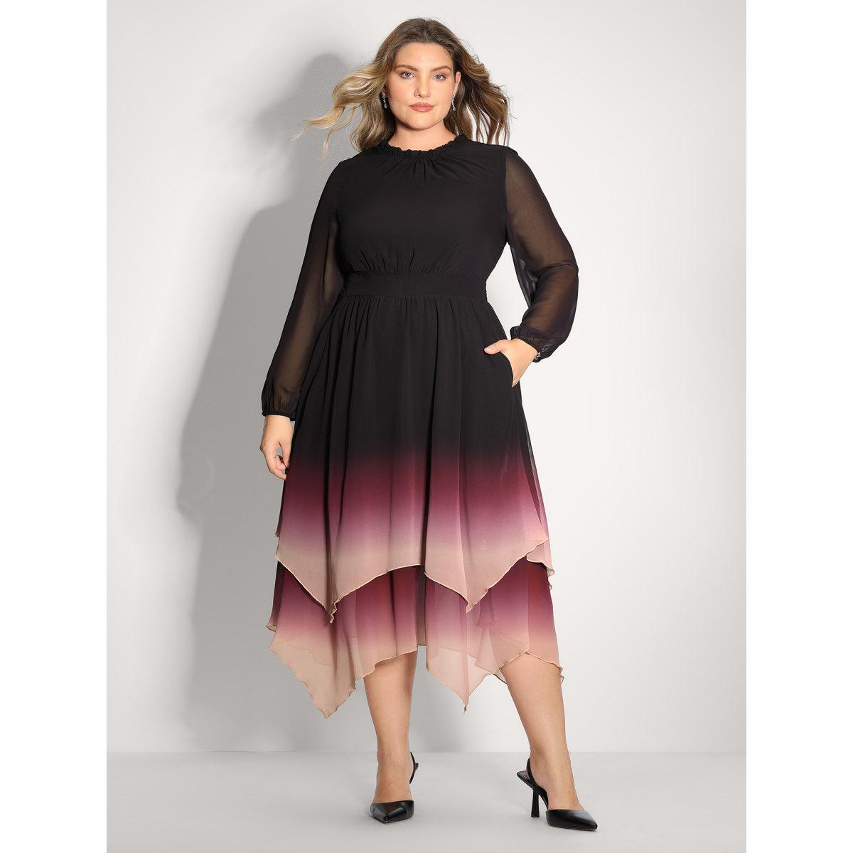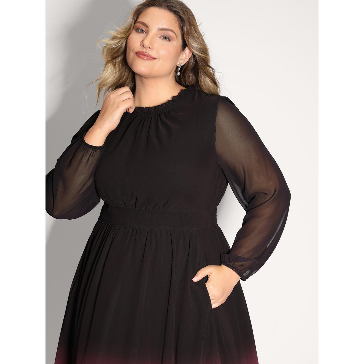 Plus Size Tie-Dye Sheer Shirred Waist Midi Dress Black Women Formal Lace collar Long Sleeve Curvy BloomChic 28/5X