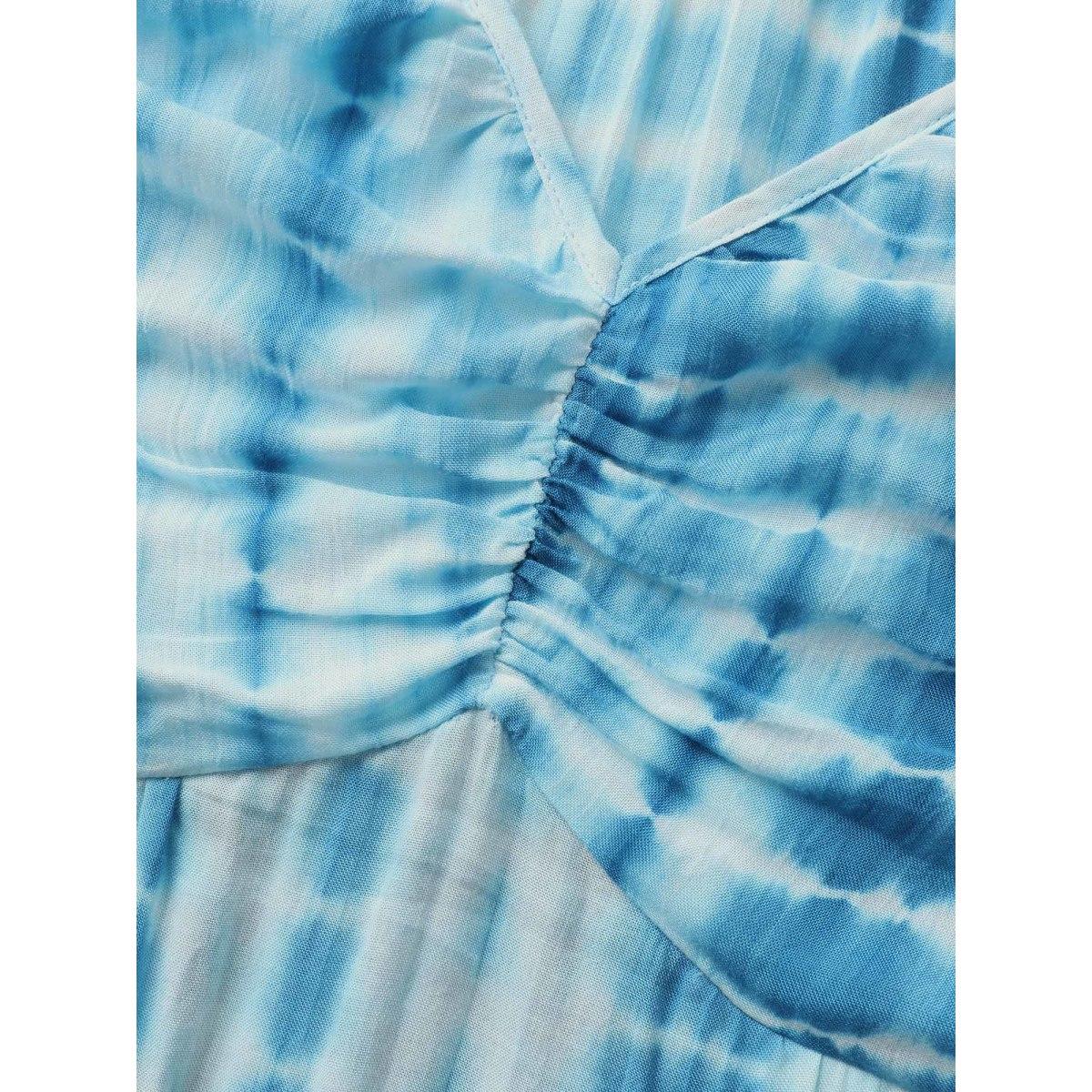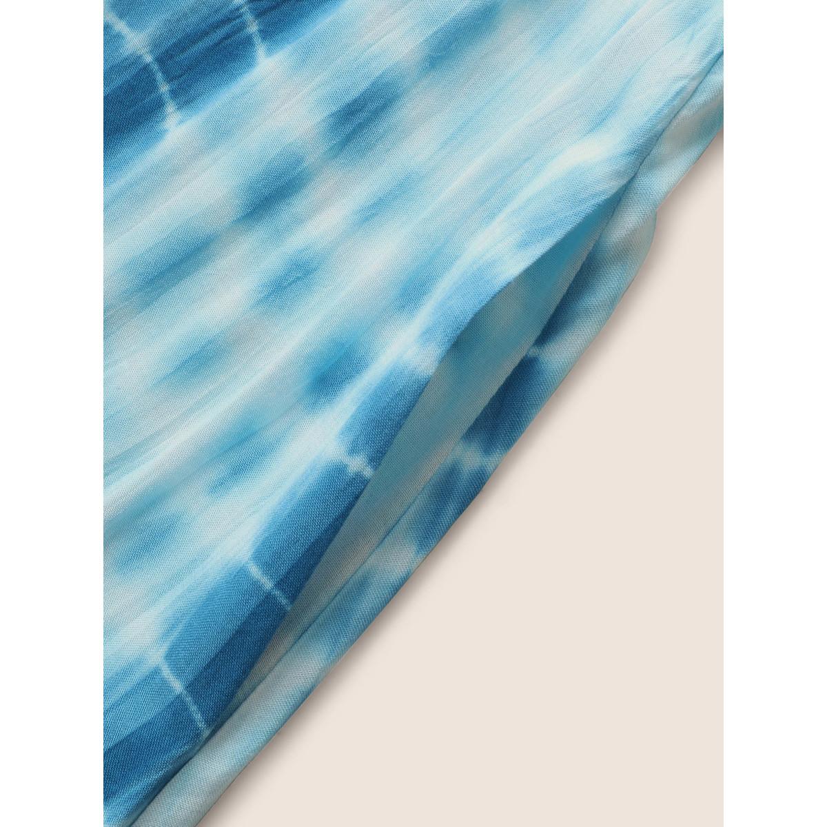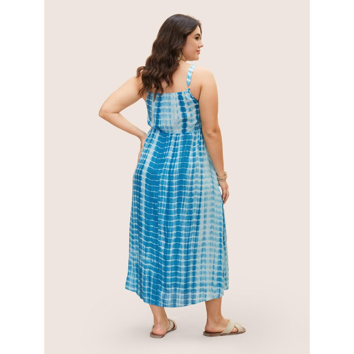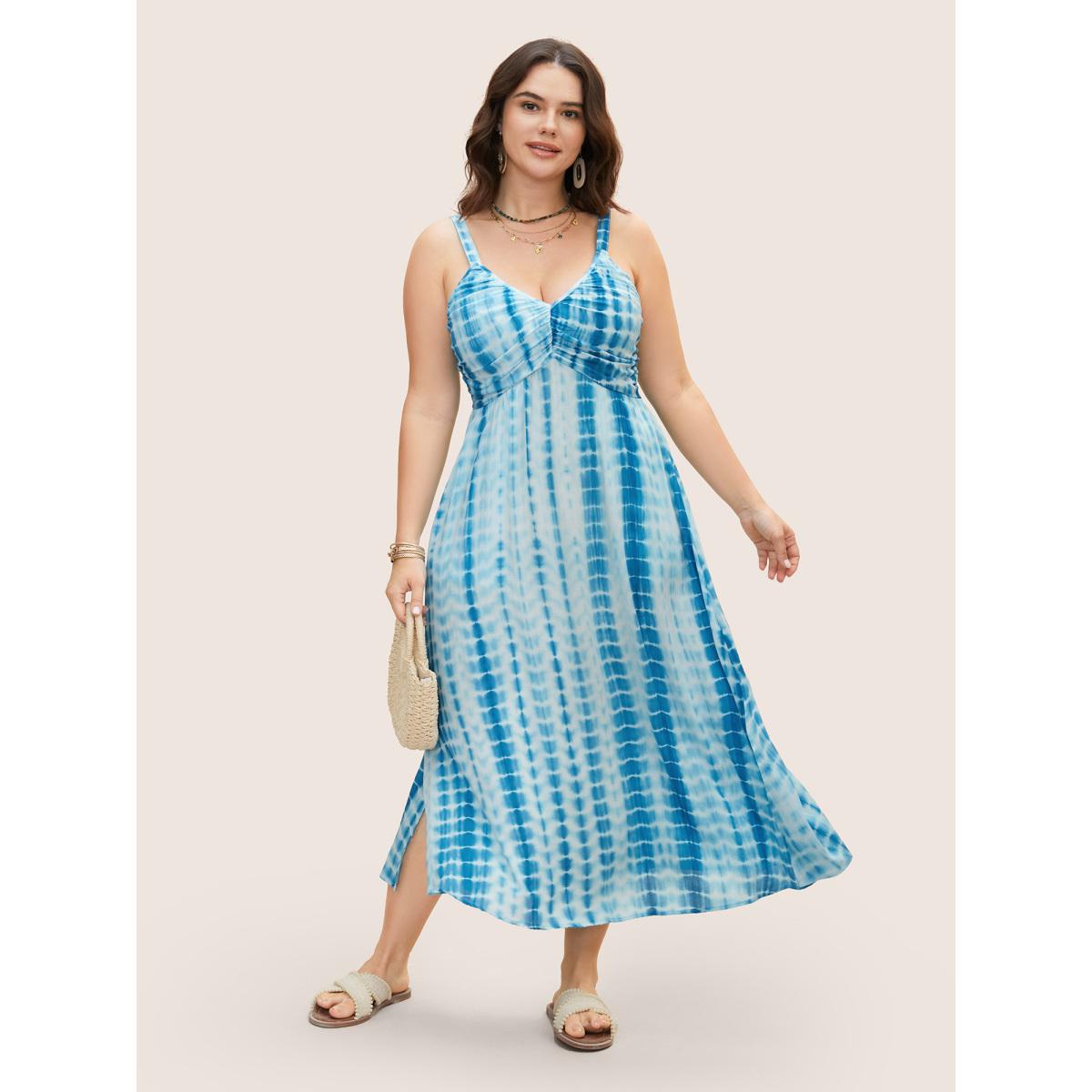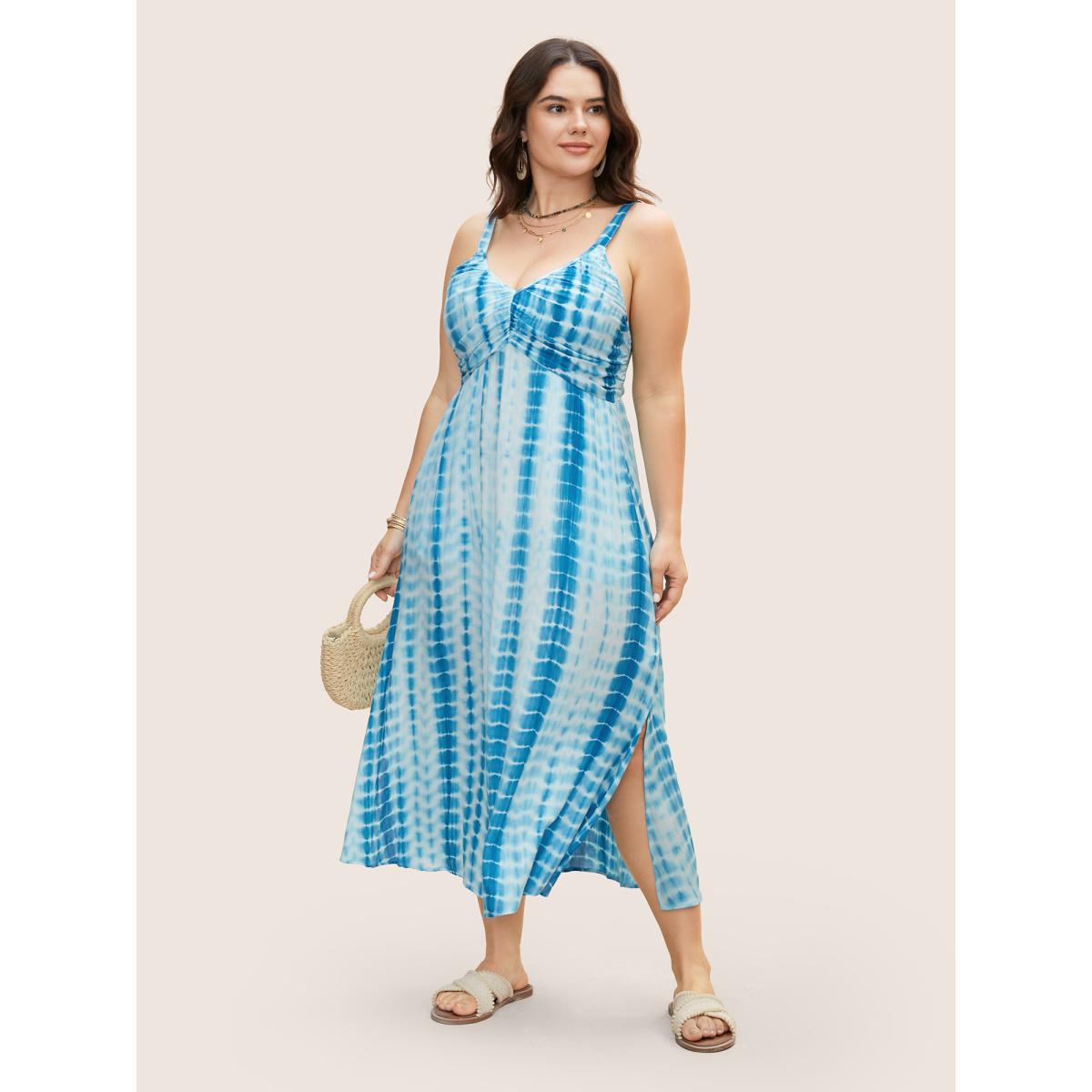 Plus Size Tie Dye Split Hem Maxi Cami Dress Skyblue Women Resort Gathered V-neck Sleeveless Curvy BloomChic 12/L