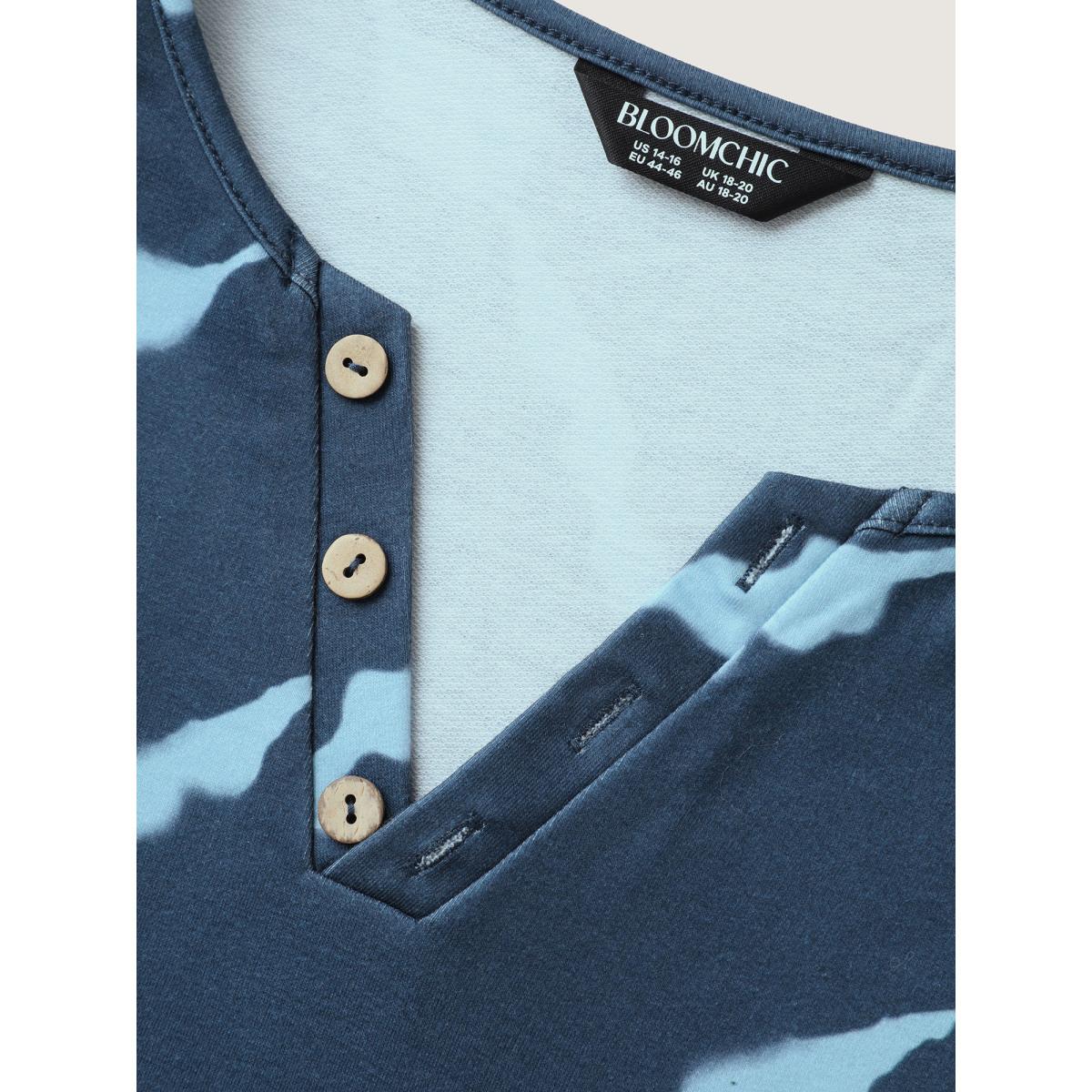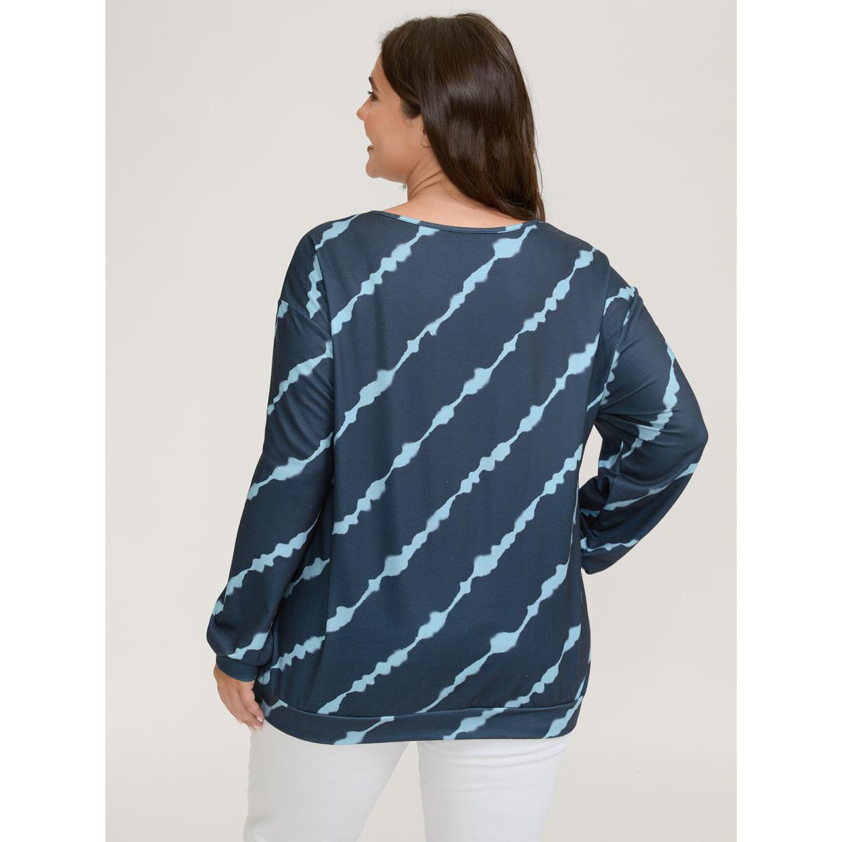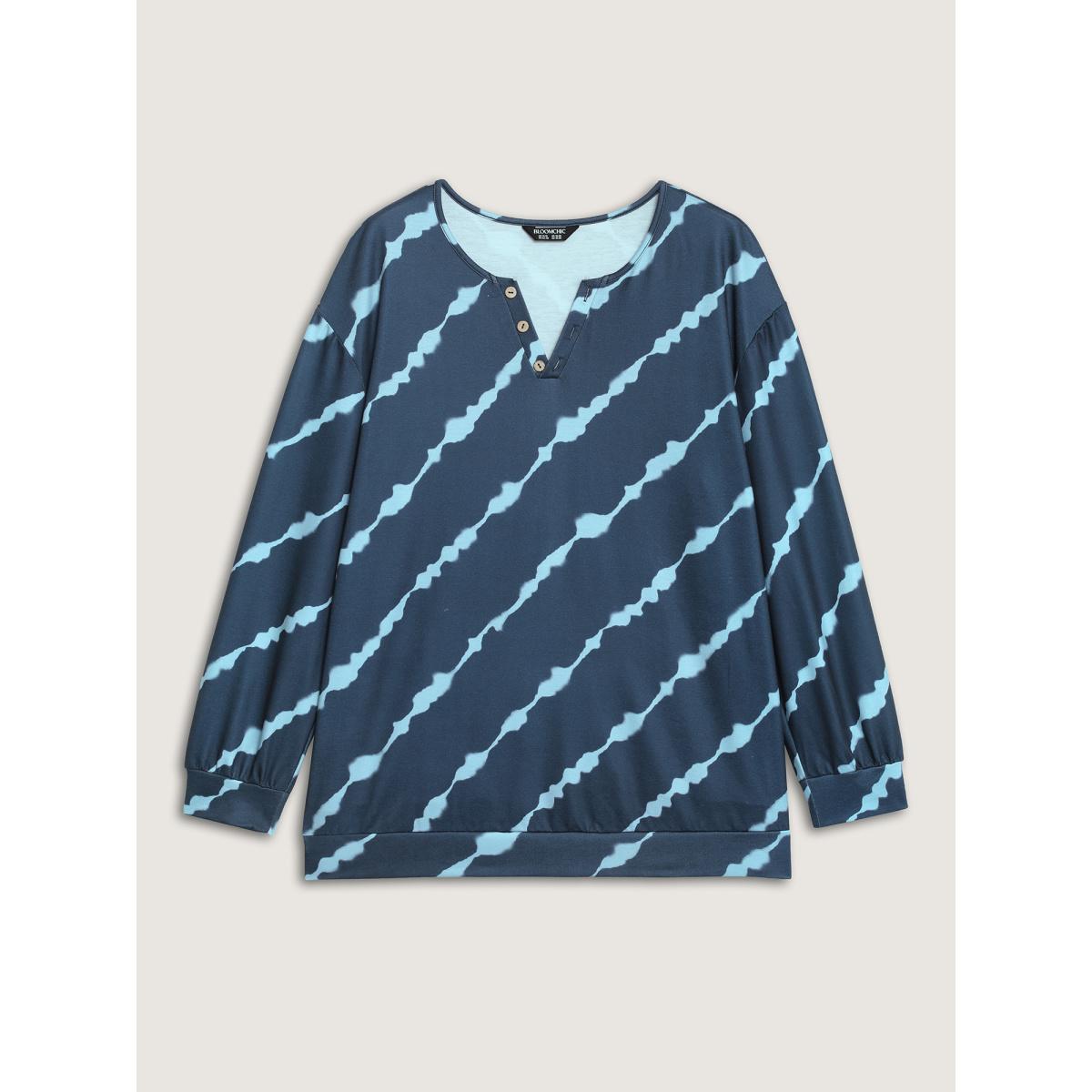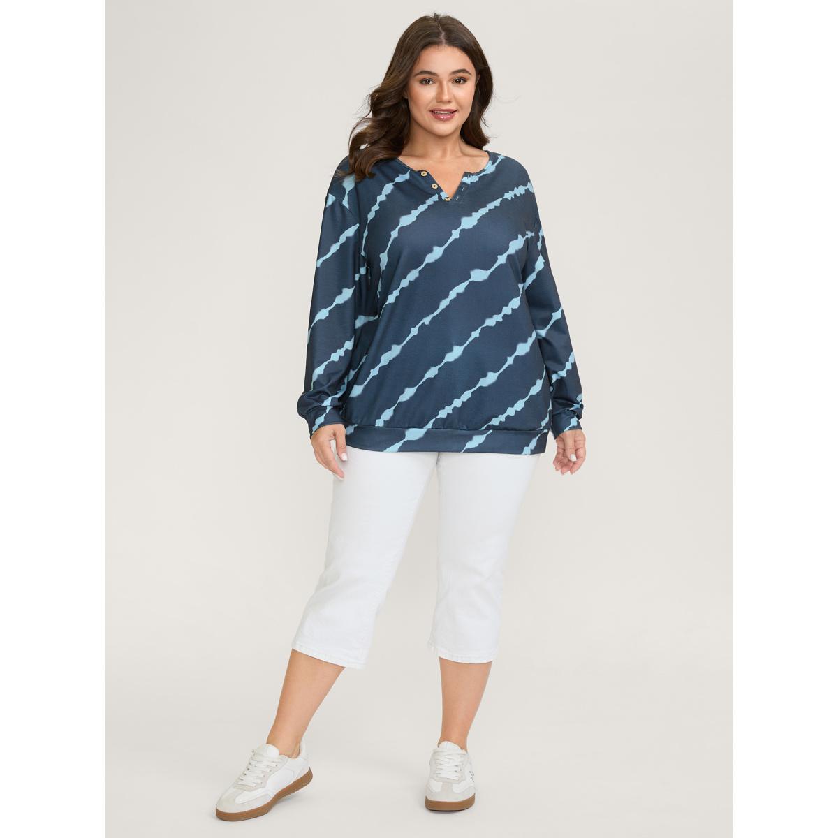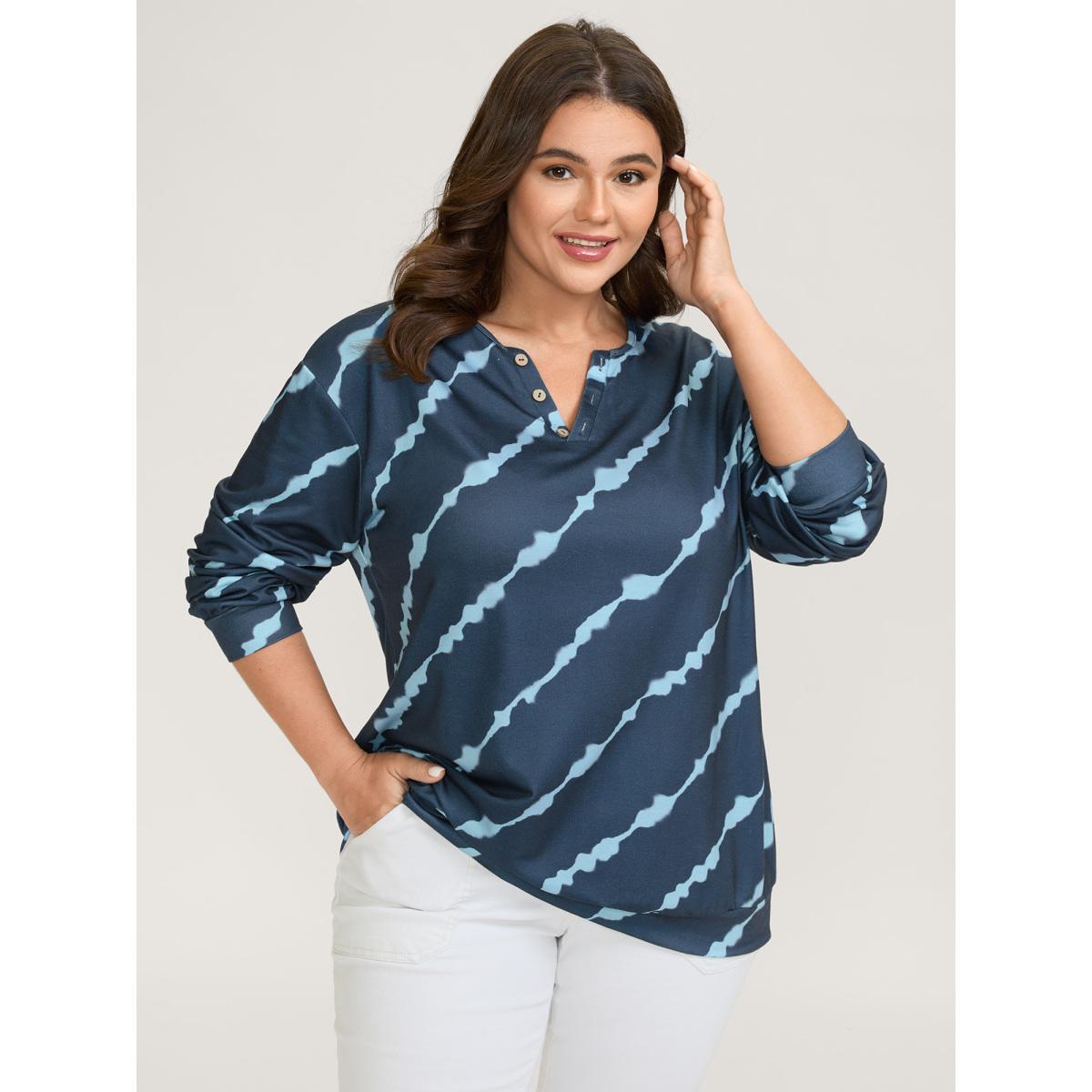 Plus Size Tie-Dye Stripes Button Detail Sweatshirt Women DarkBlue Leisure Non Flat collar with V-notch Casual Sweatshirts BloomChic 12/L