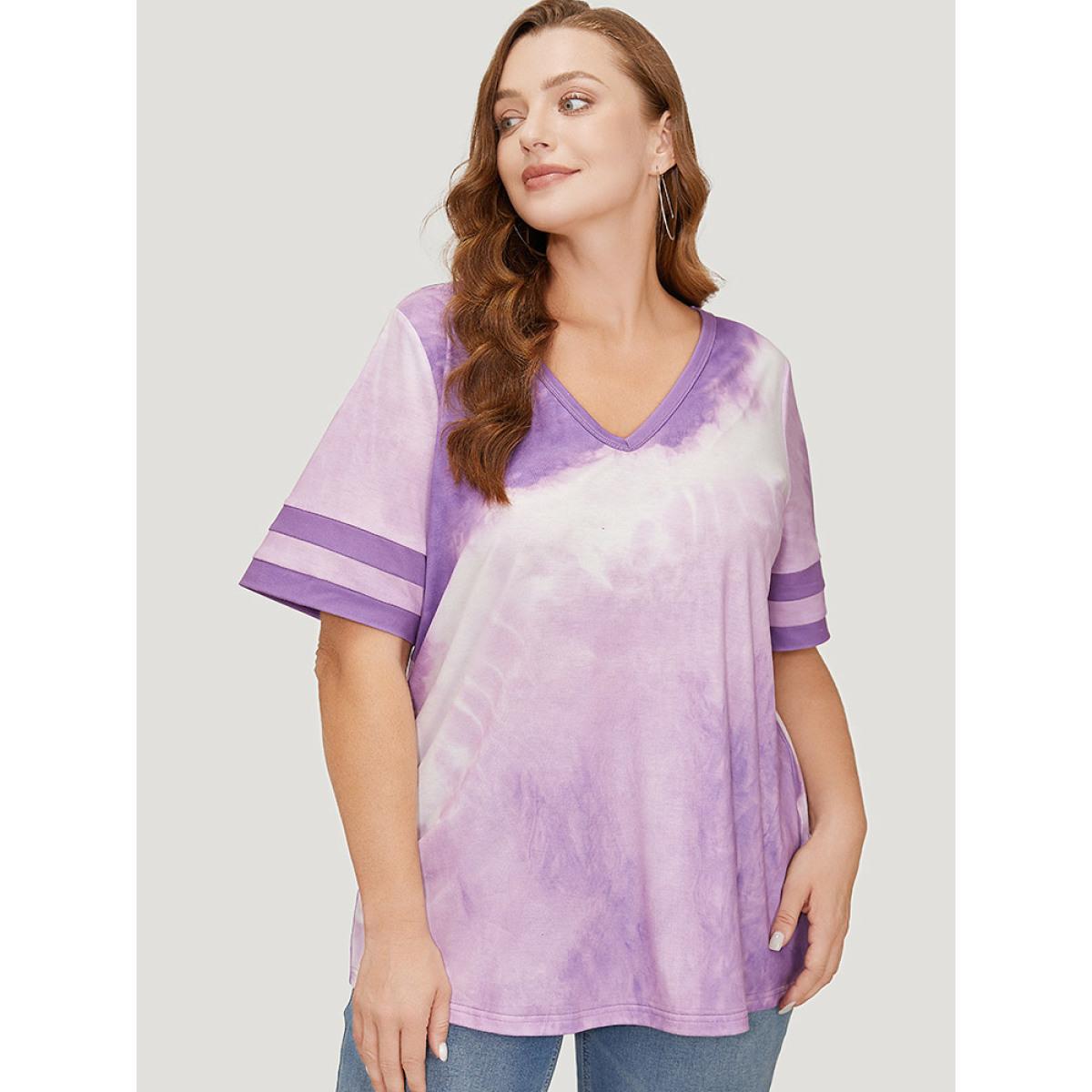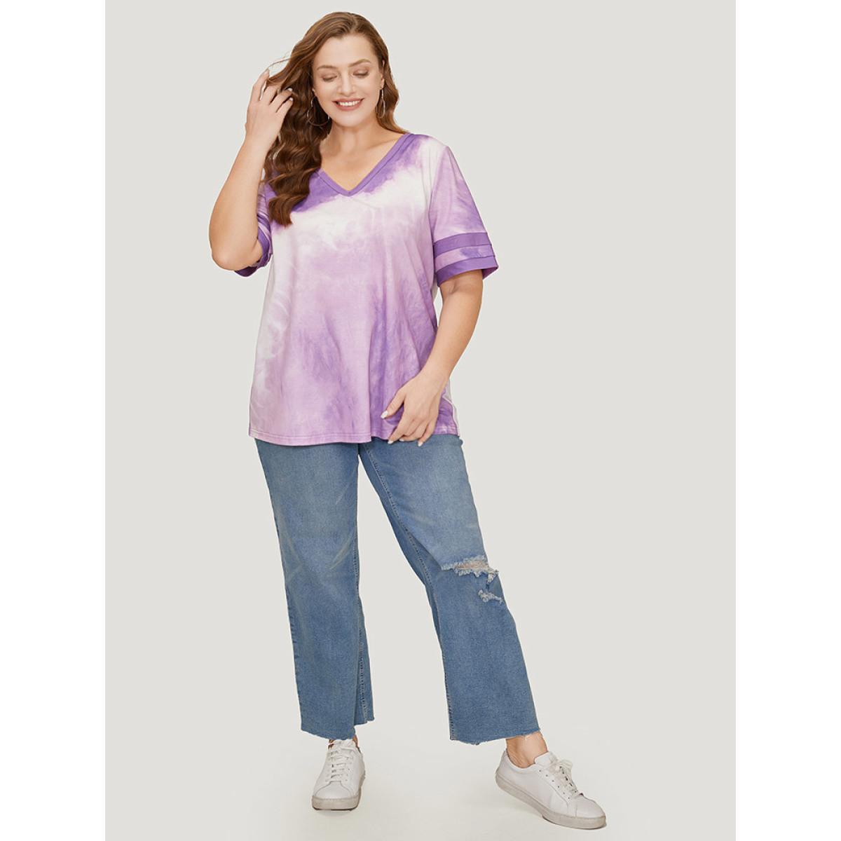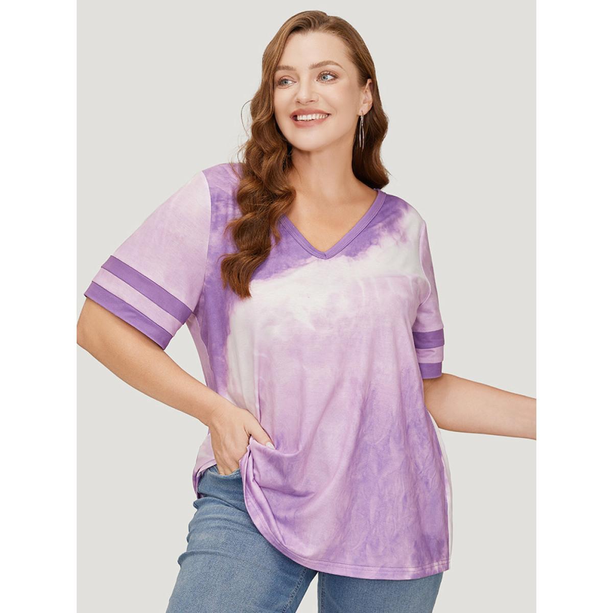 Plus Size Tie Dye V Neck Contrast Trim T-shirt Lilac Women Casual Contrast Tie Dye V-neck Dailywear T-shirts BloomChic 10/M