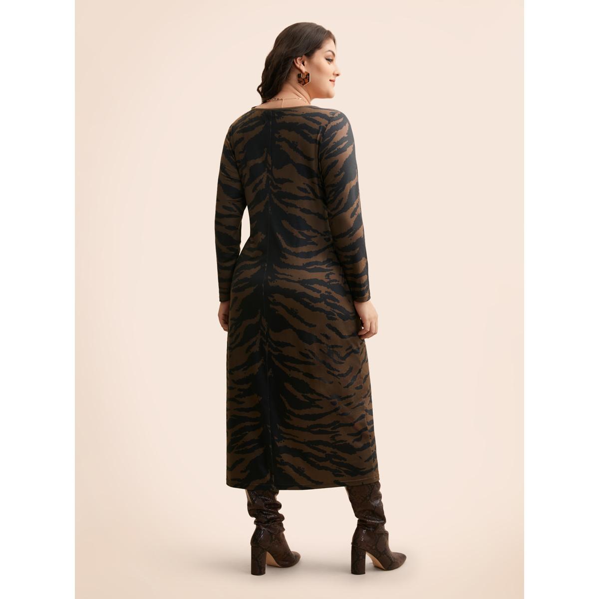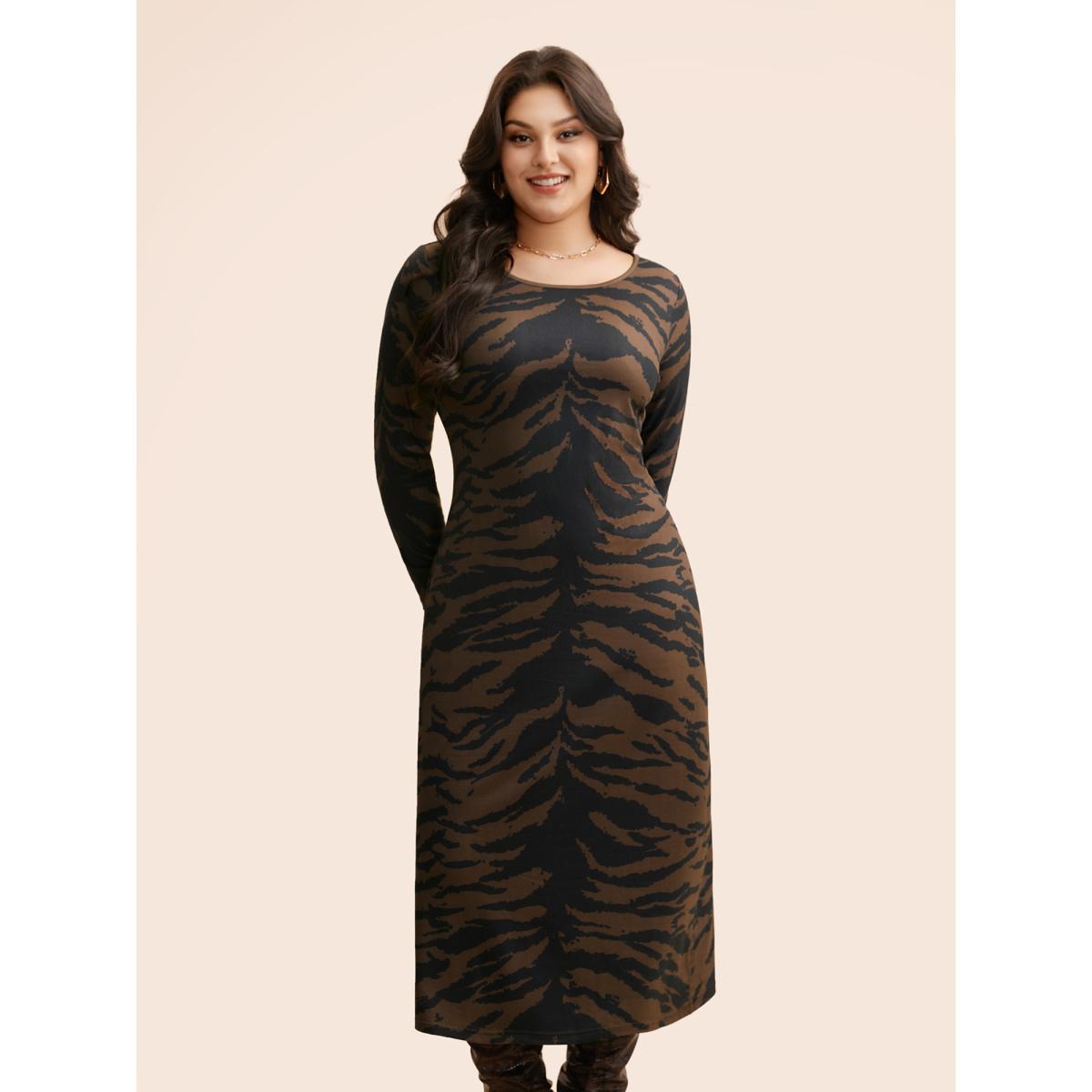 Plus Size Tiger Print Boat Neck Midi Dress DarkBrown Women Elegant Non Boat Neck Long Sleeve Curvy BloomChic 28/5X Product Image