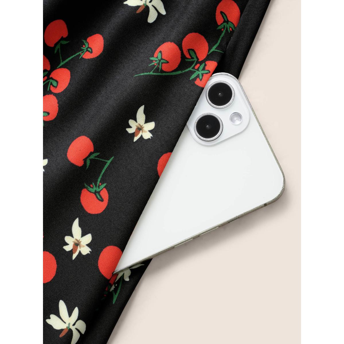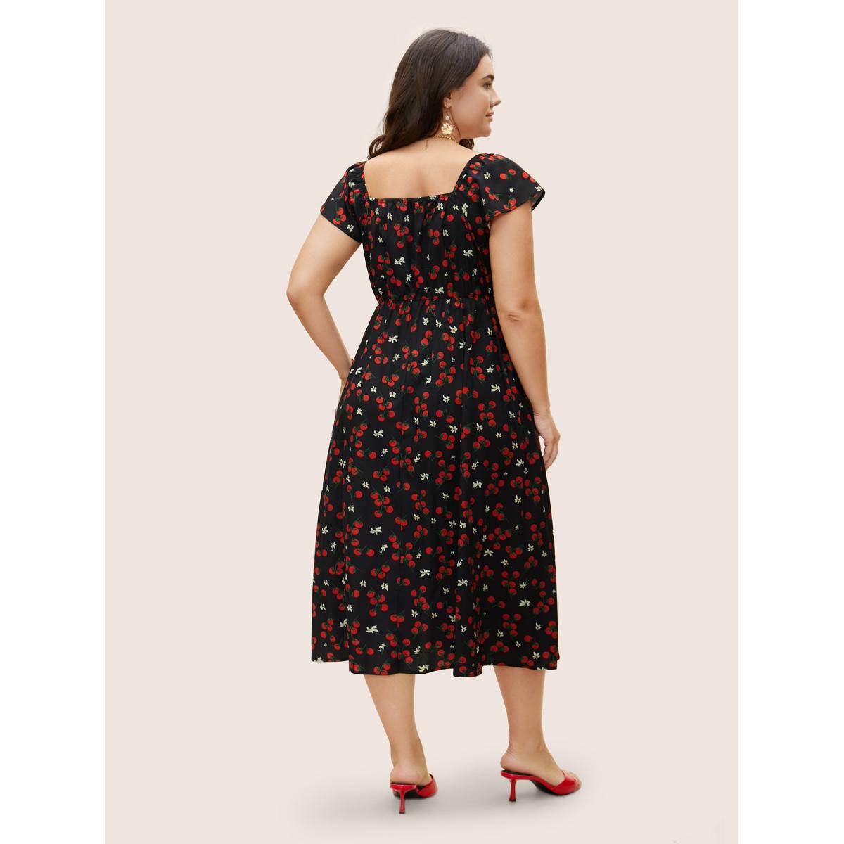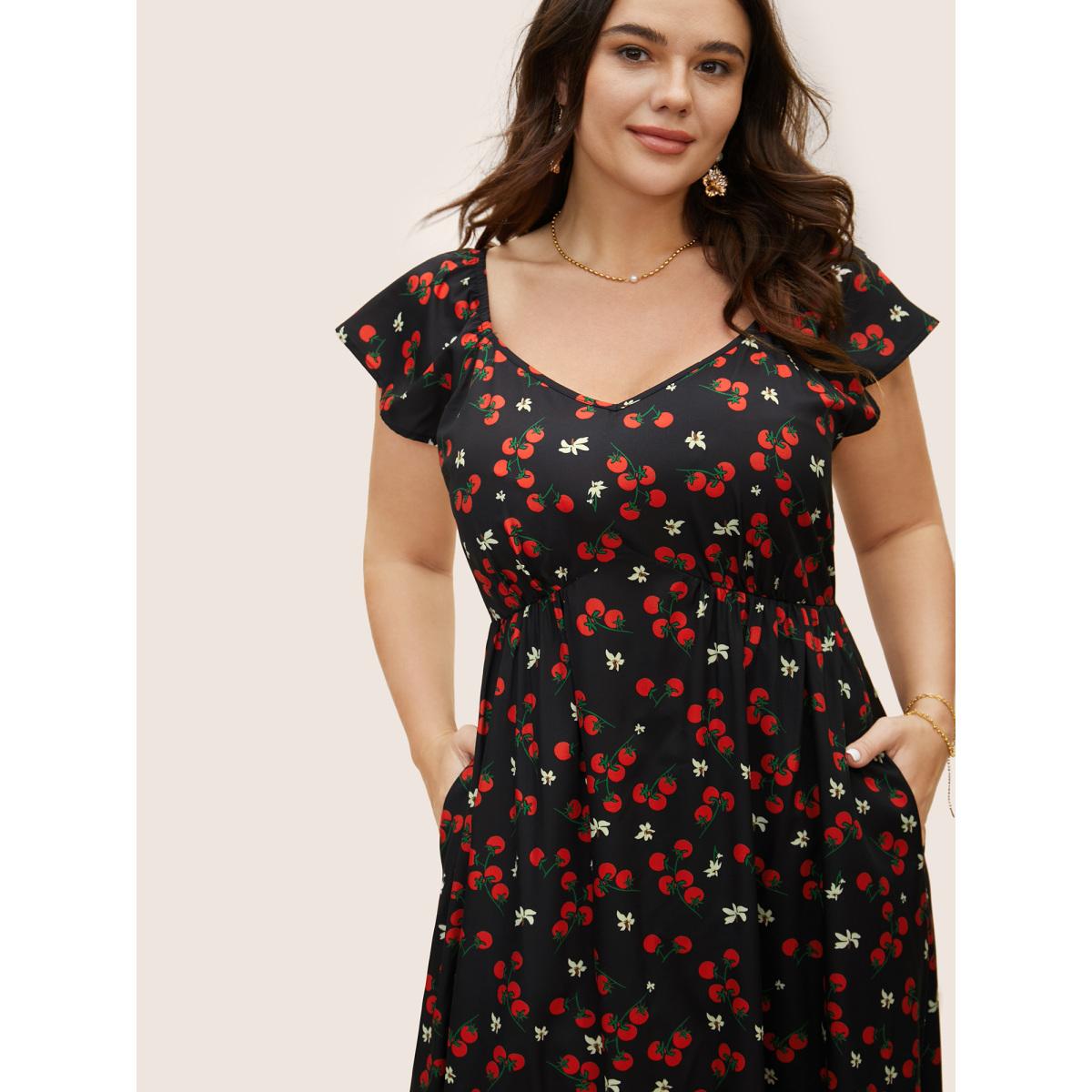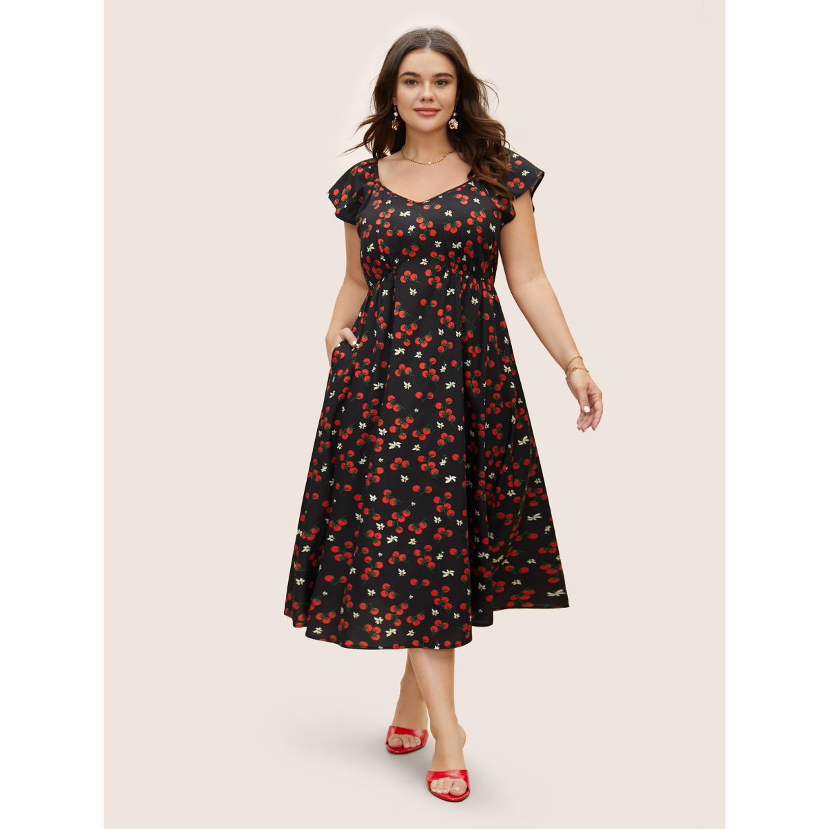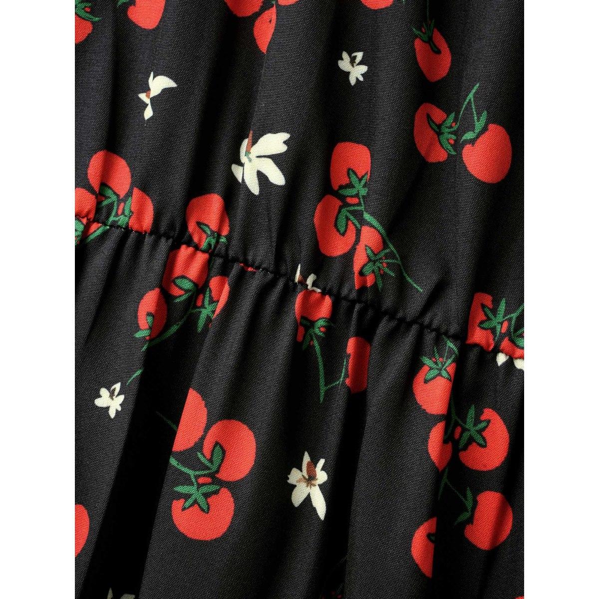 Plus Size Tomato Print Heart Neckline Ruffle Cap Sleeve Dress Black Women Elegant Ruffles Heart neckline Cap Sleeve Curvy BloomChic 22-24/3X