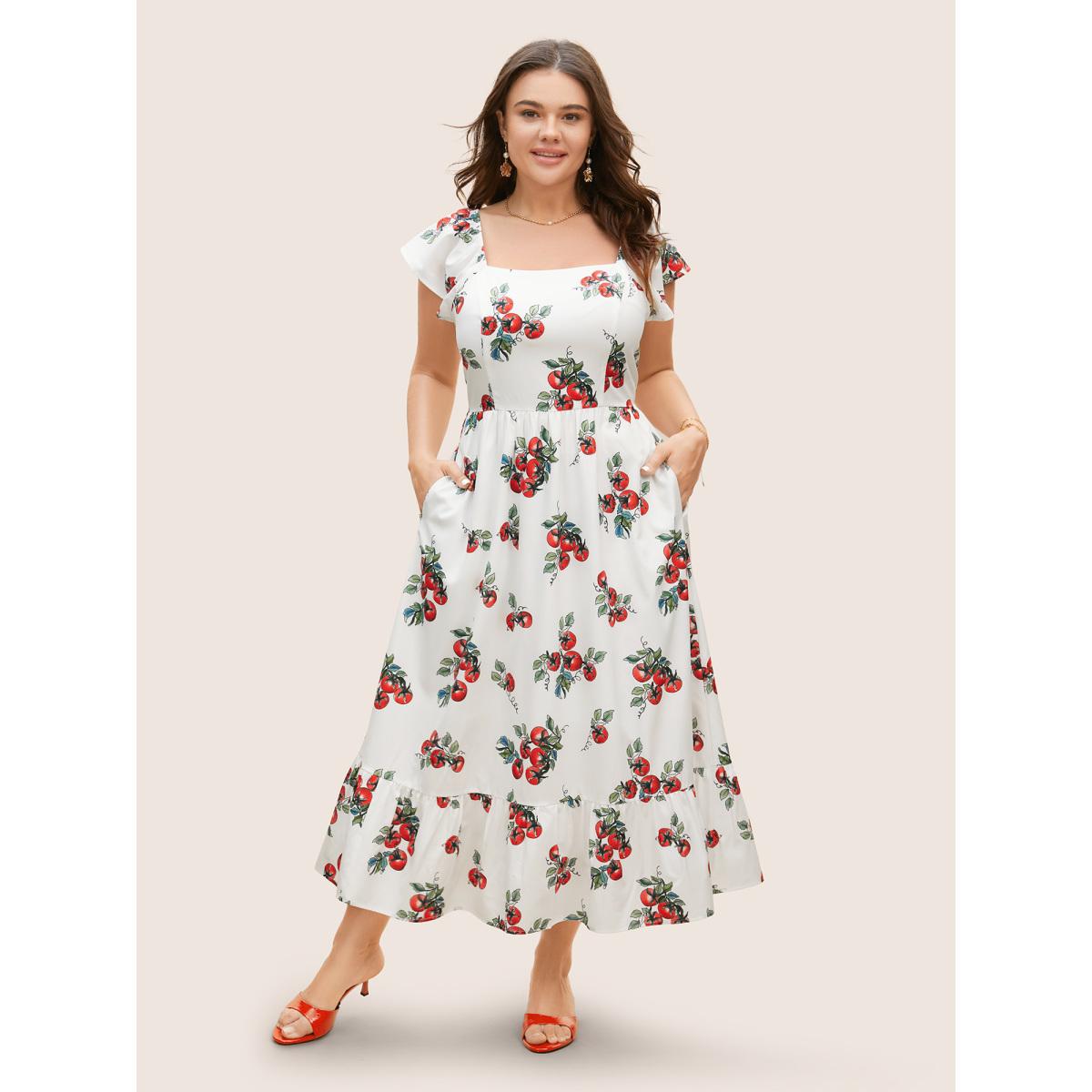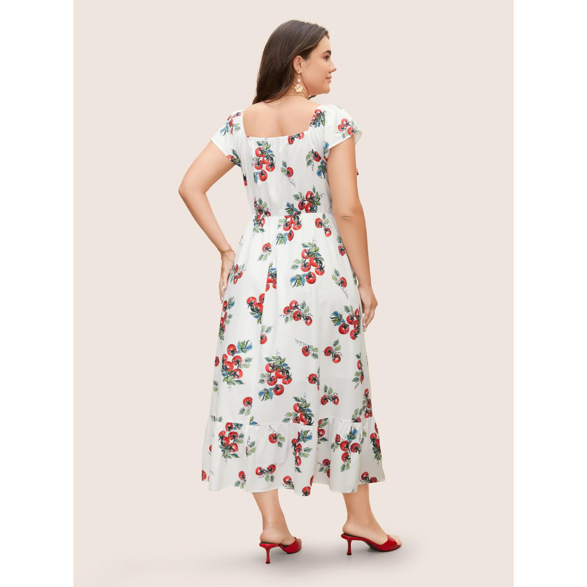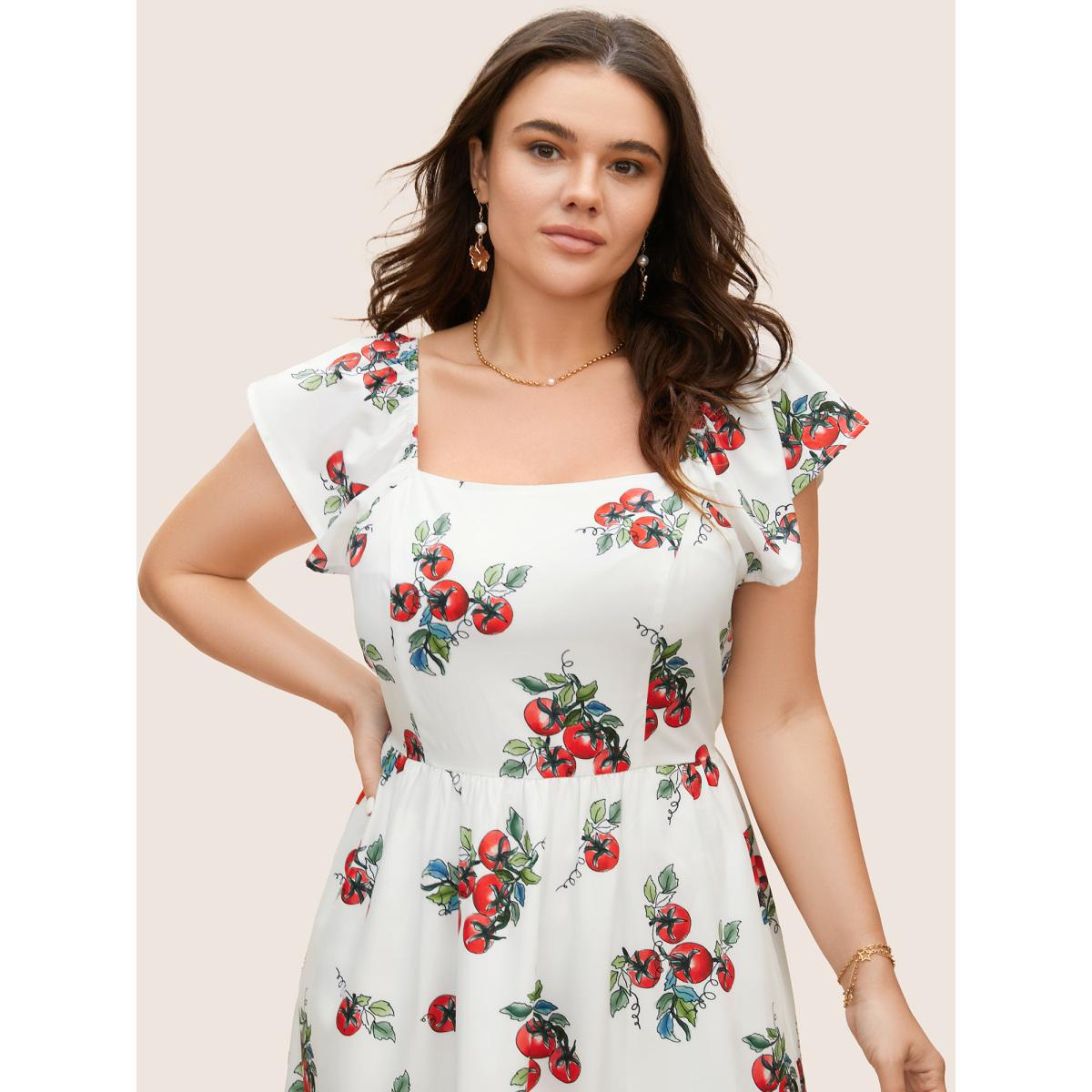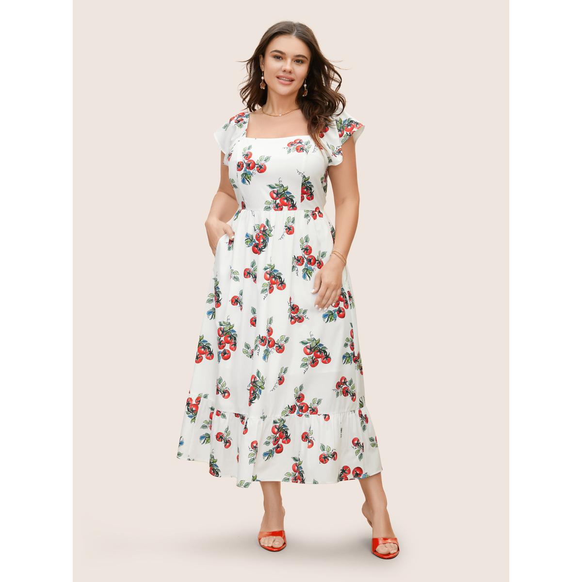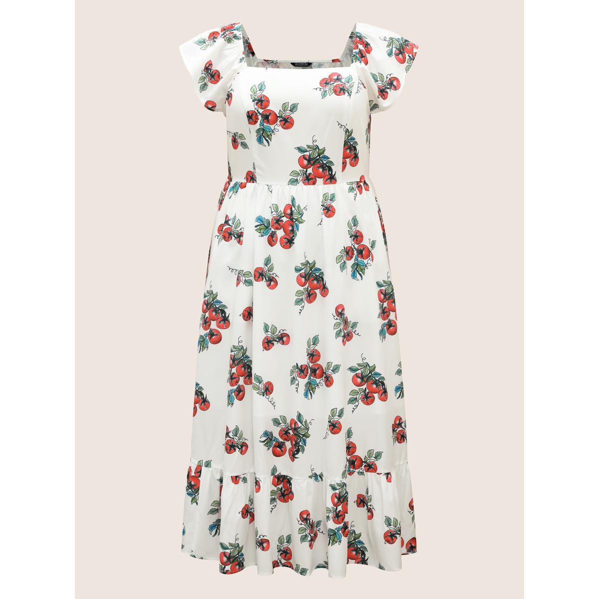 Plus Size Tomato Print Square Neck Ruffle Cap Sleeve Dress Originalwhite Women Elegant Ruffles Square Neck Cap Sleeve Curvy BloomChic 18-20/2X