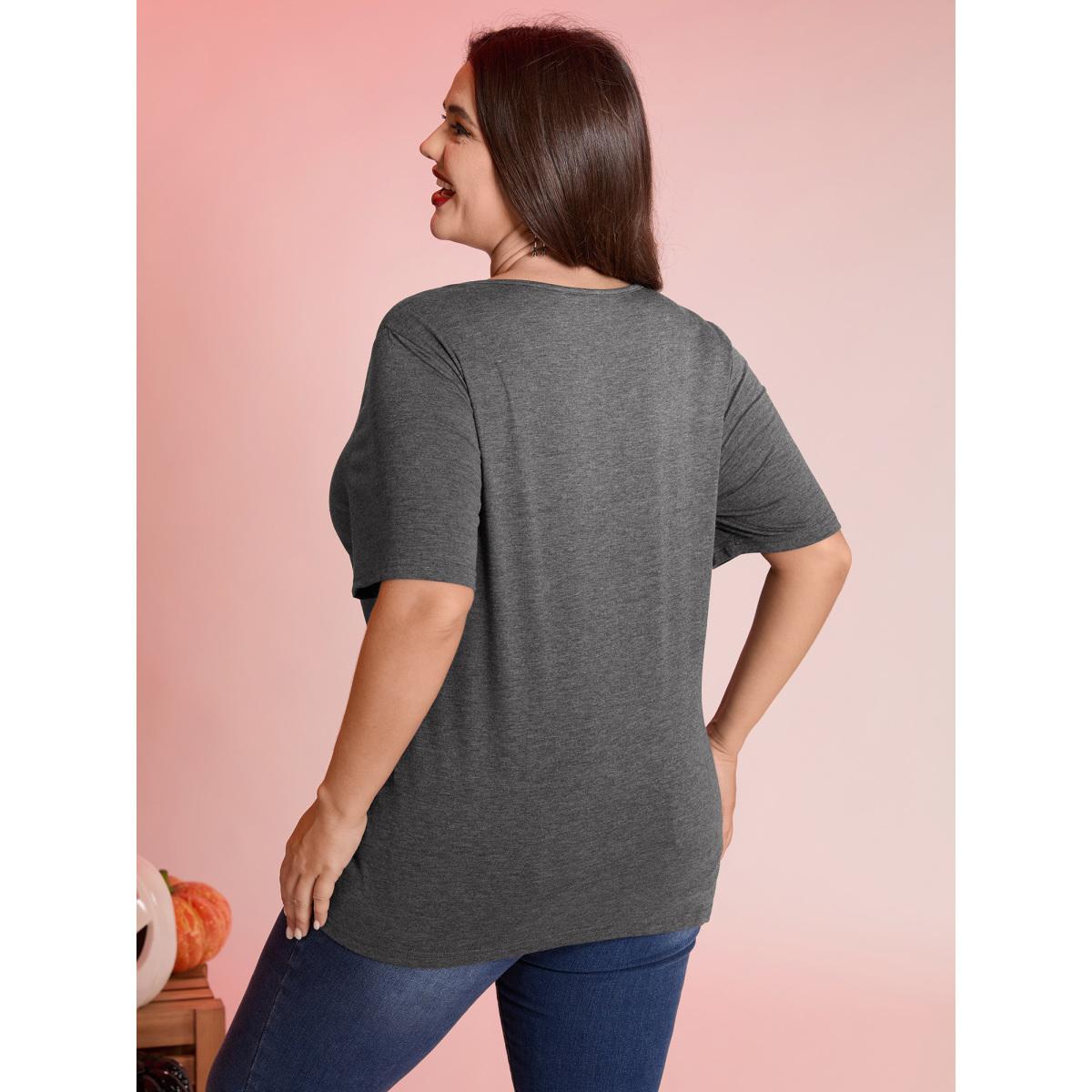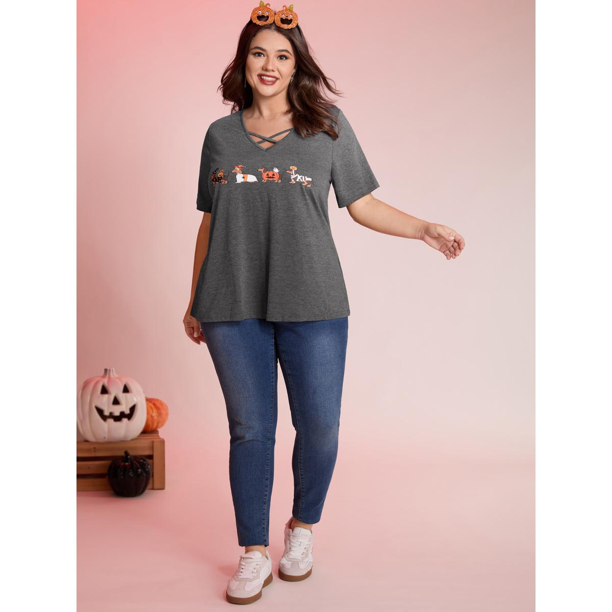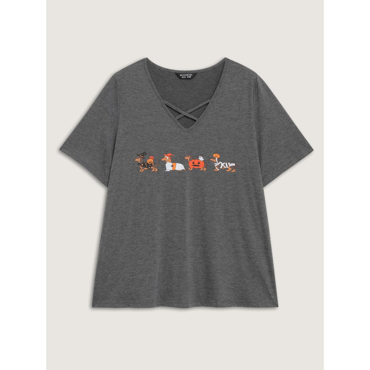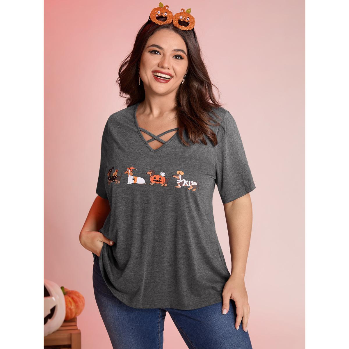 Plus Size Trick or BloomChic Crossover Neck-Tie T-Shirt DimGray Women Leisure Cut-Out Animal V-neck Casual T-shirts BloomChic 12/L