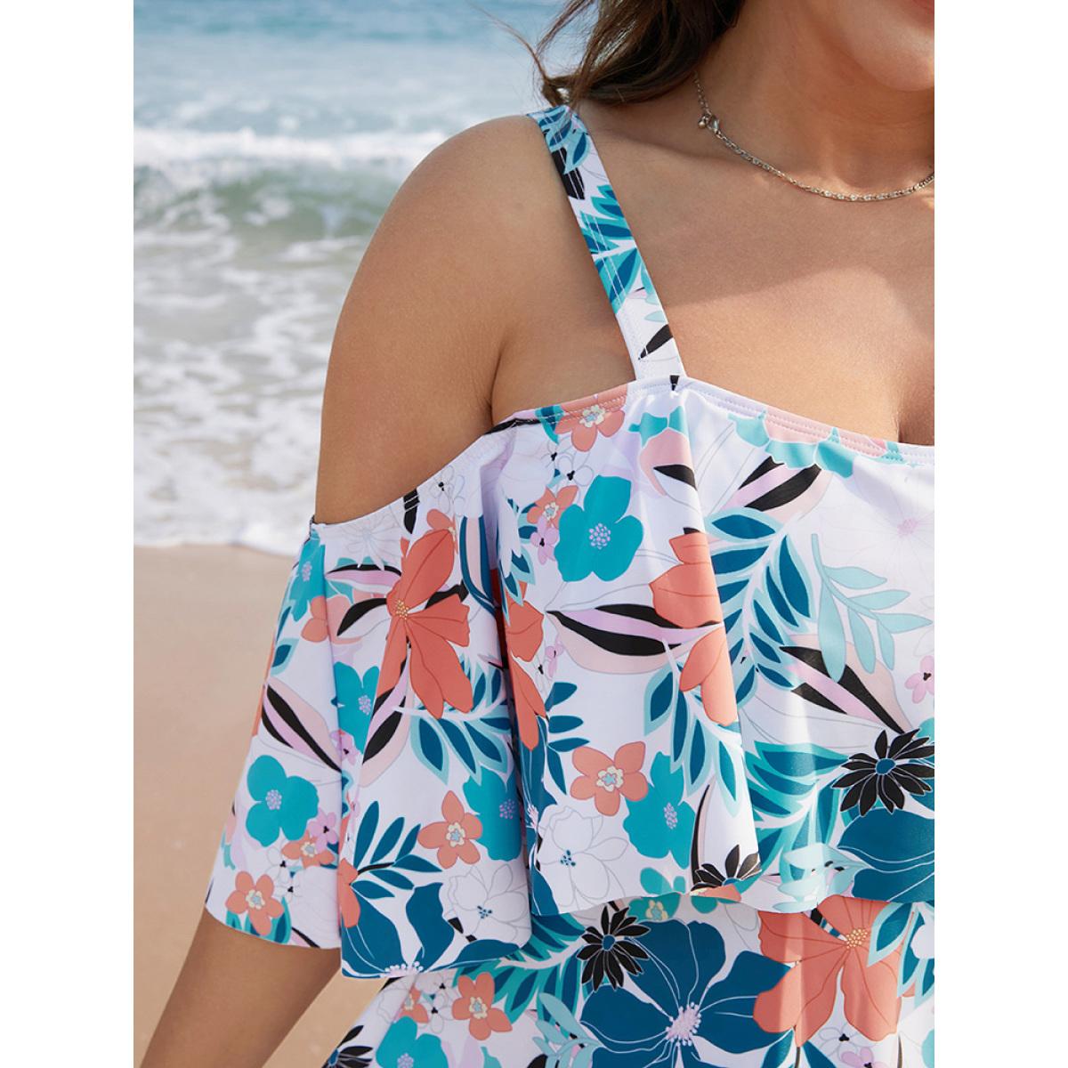 Plus Size Tropical Adjustable Straps Cold Shoulder Ruffles Trim Swim Dress Women's Swimwear Multicolor Resort Bodycon One-shoulder neck High stretch Curve Swim Dresses BloomChic 22-24/3X