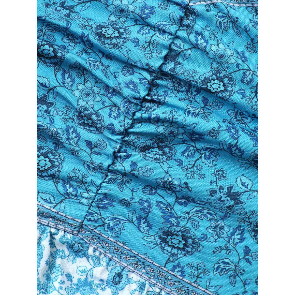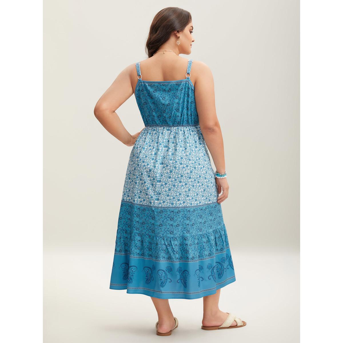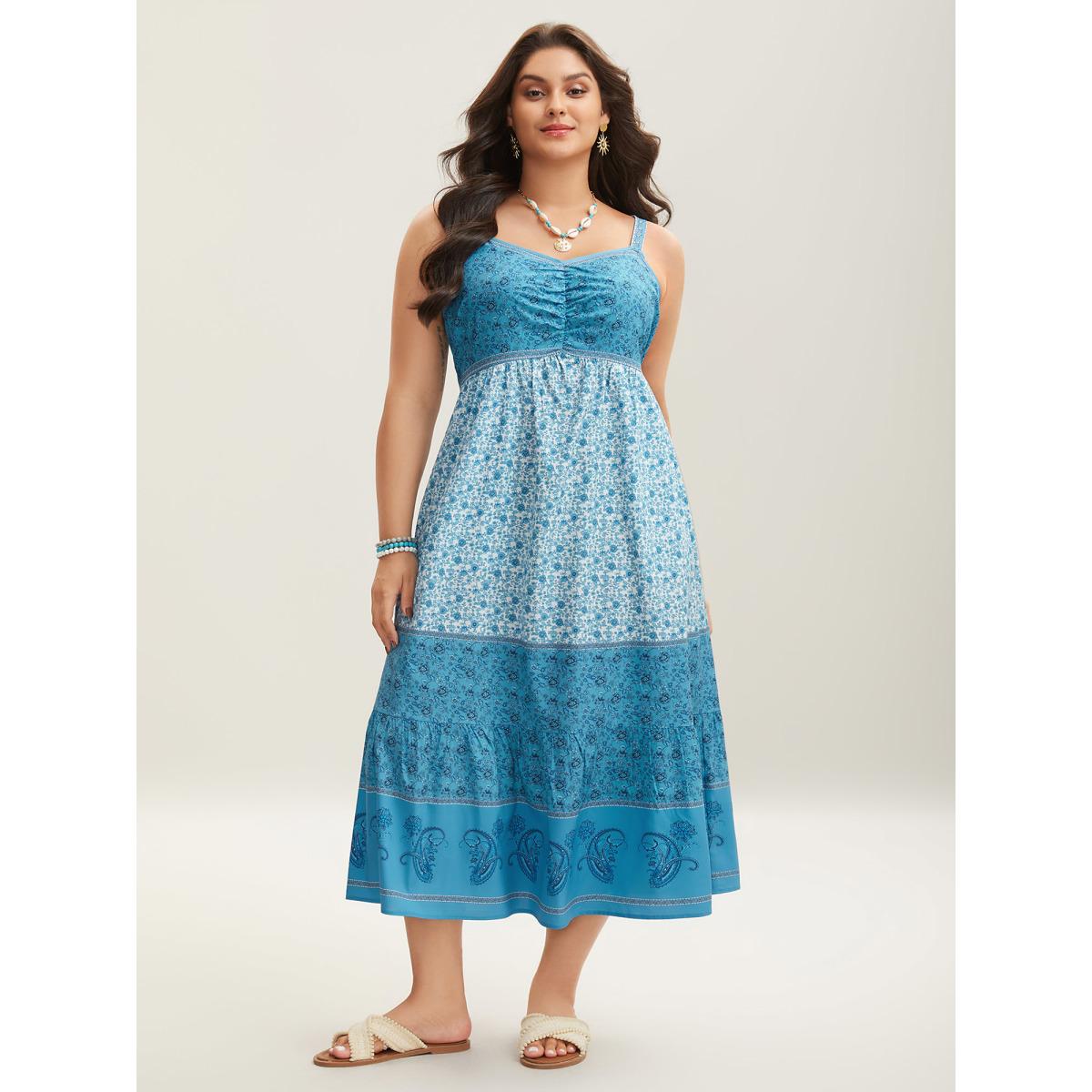 Plus Size Tropical Blues Cinched Cami Midi Dress Cerulean Women Boho Gathered Heart neckline Sleeveless Curvy BloomChic 30/6X