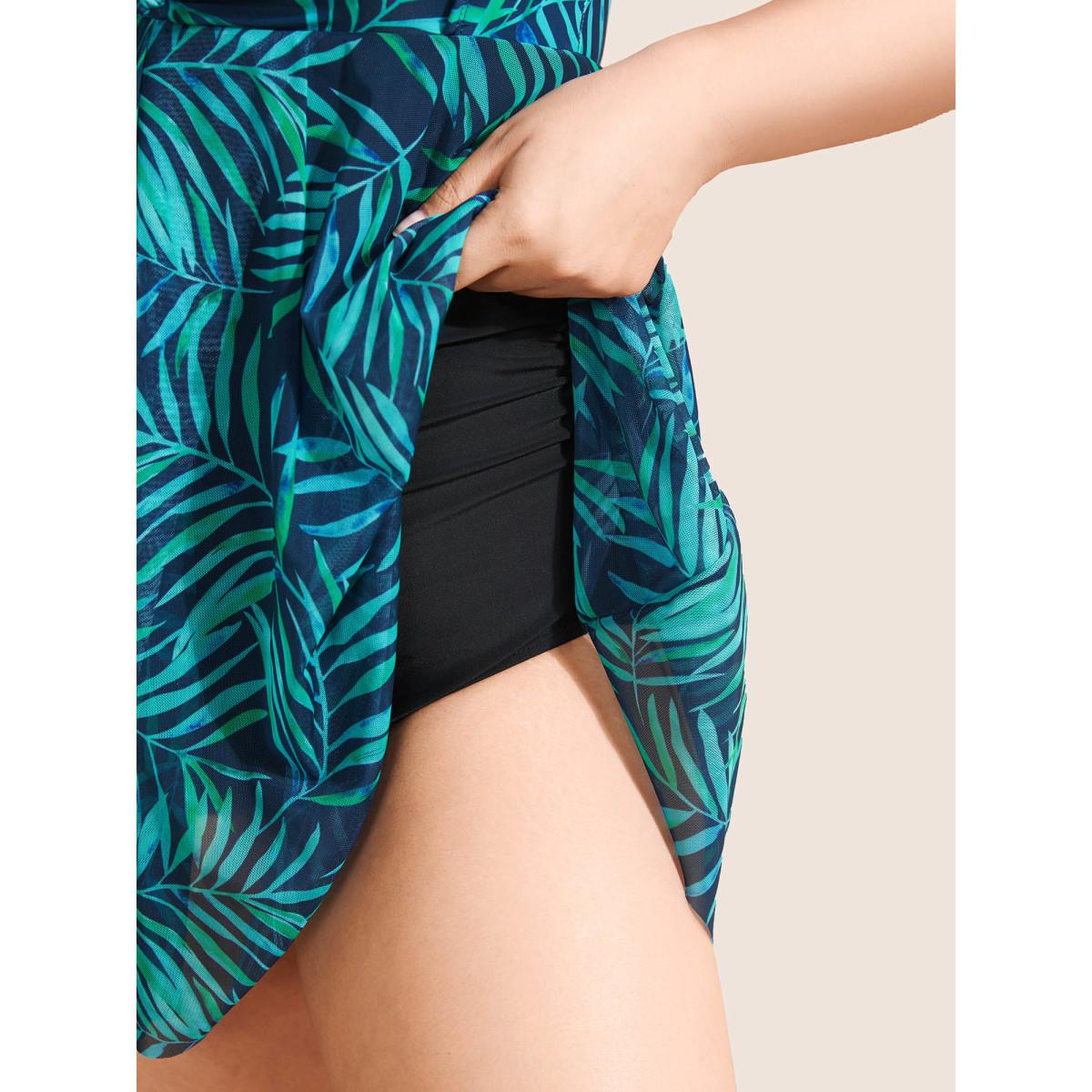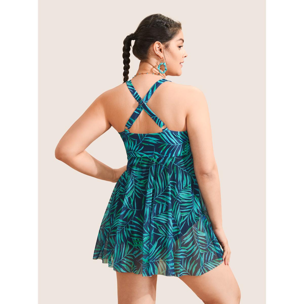 Plus Size Tropical Plant Print Drawstring Swim Dress Women's Swimwear DarkGreen Beach Bodycon V-neck High stretch Curve Swim Dresses BloomChic 26/4X