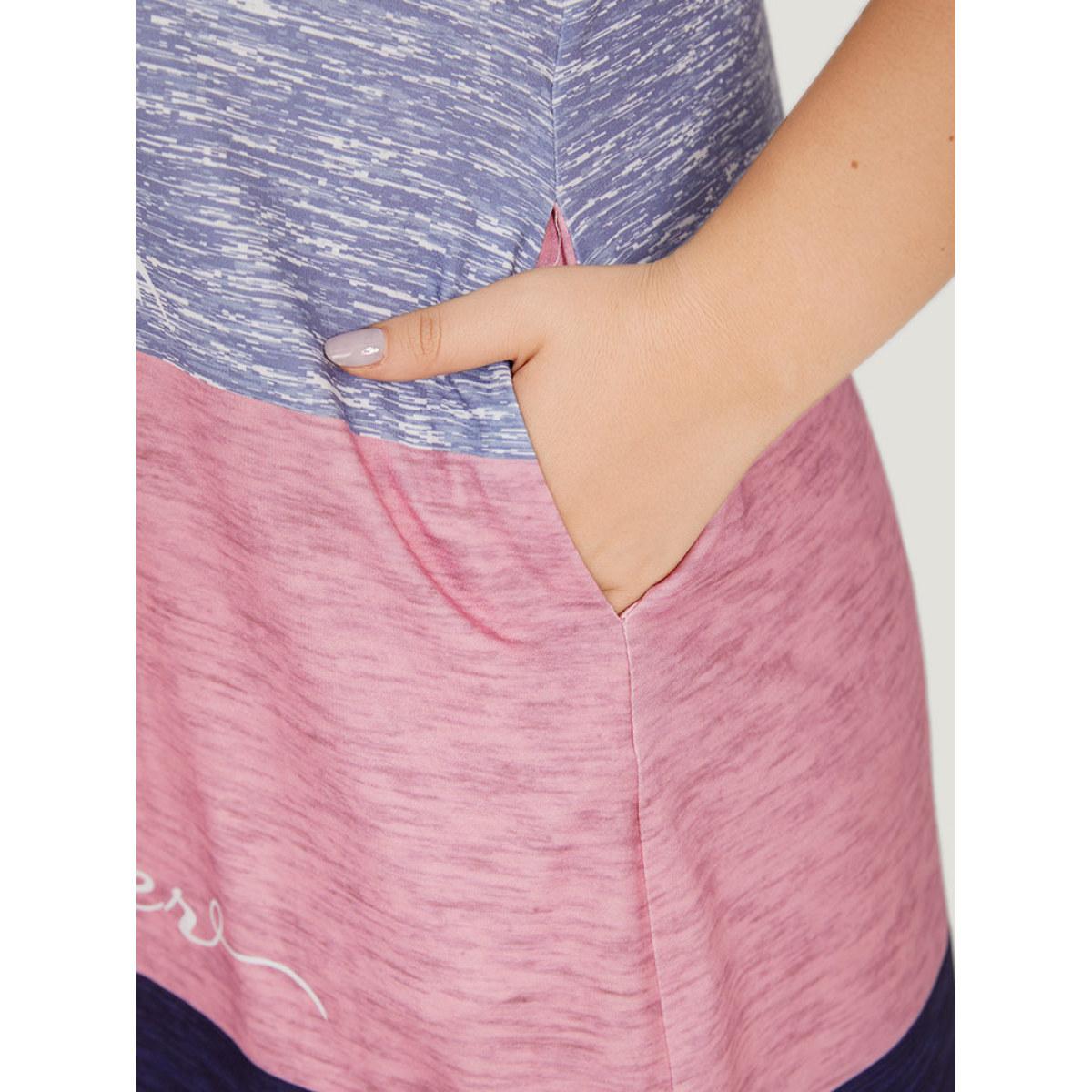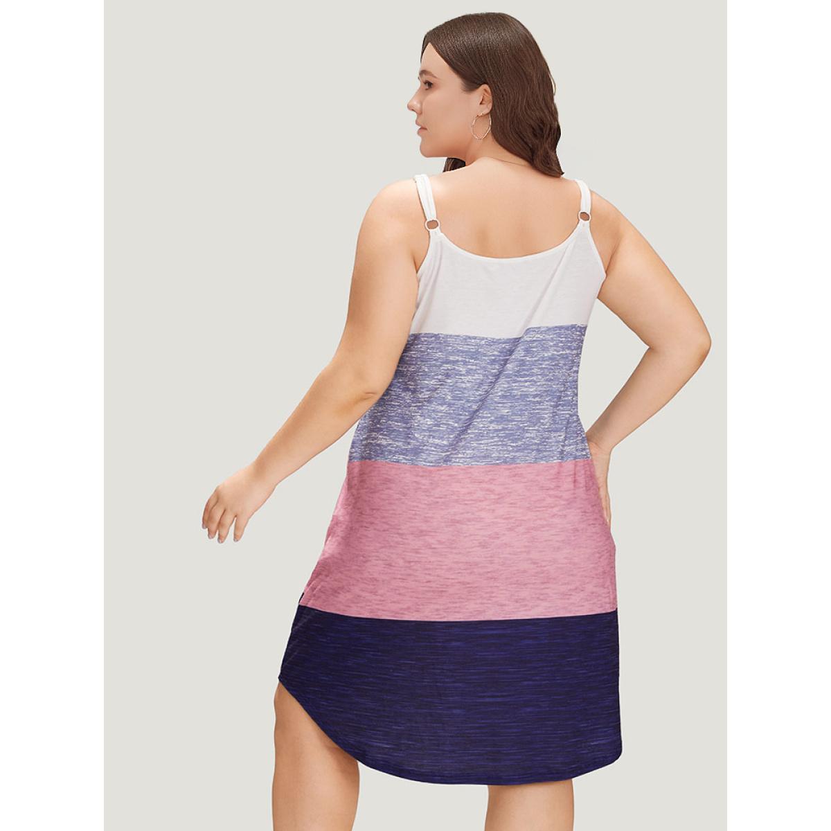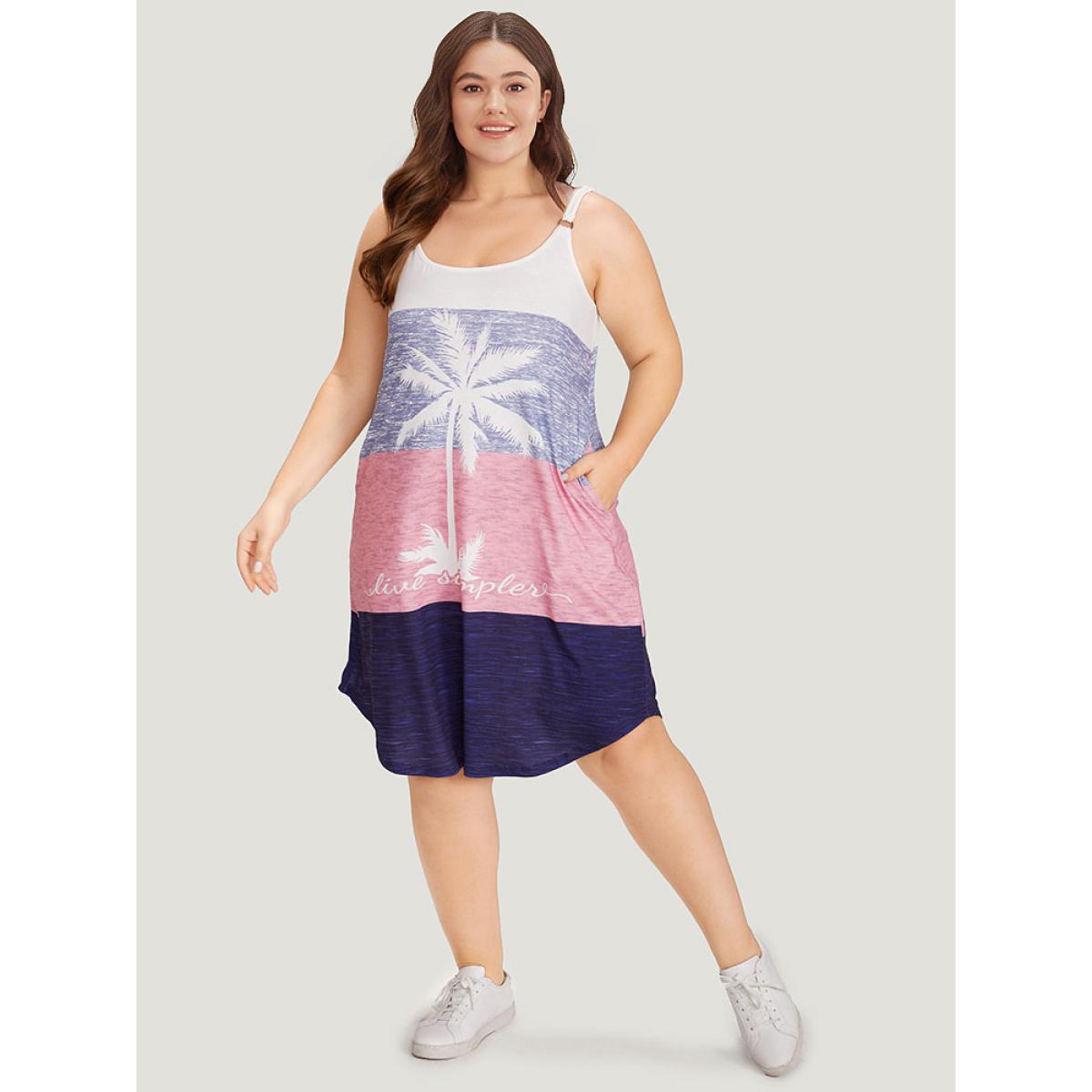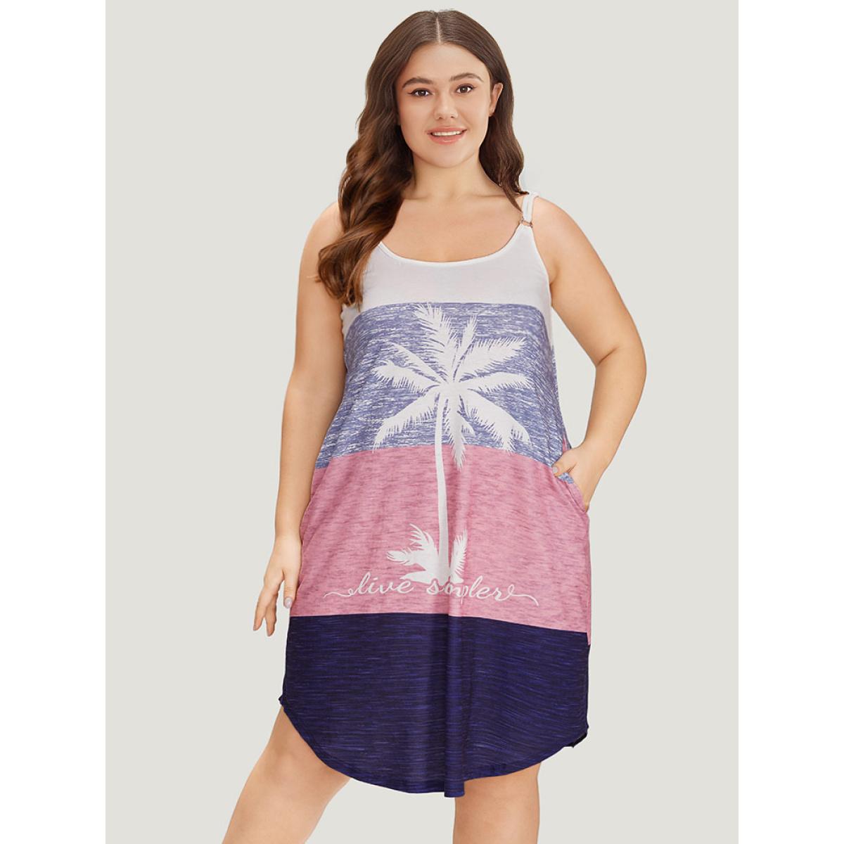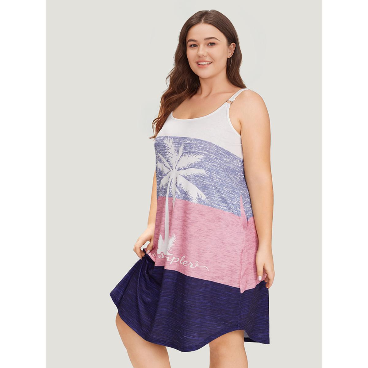Plus Size Tropical Print Colorblock Contrast Arc Hem Cami Dress Multicolor Women Vacation Printed Spaghetti Strap Sleeveless Curvy Knee Dress BloomChic 28/5X