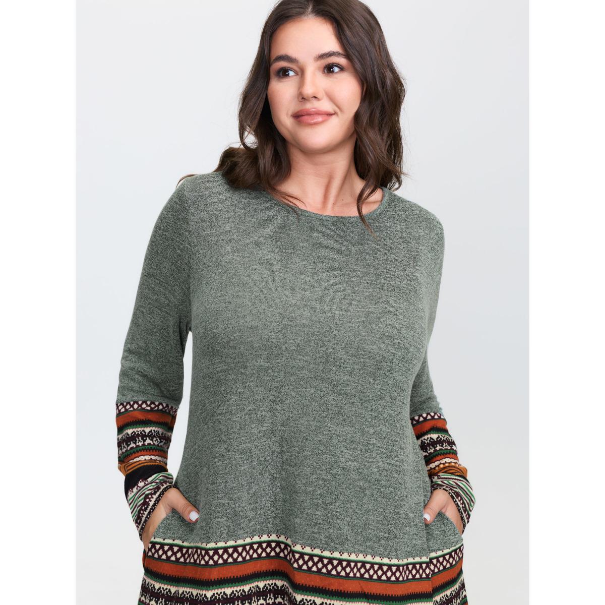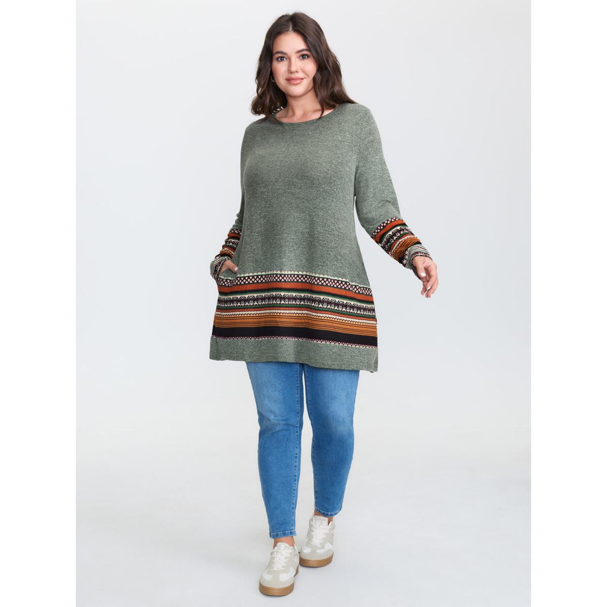 Plus Size Tunic Boho Print Pocket T-shirt Sage Women Leisure Contrast Round Neck Loose Casual T-shirts BloomChic 10/M