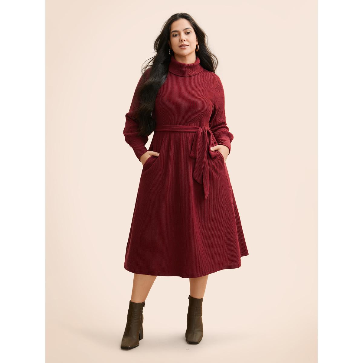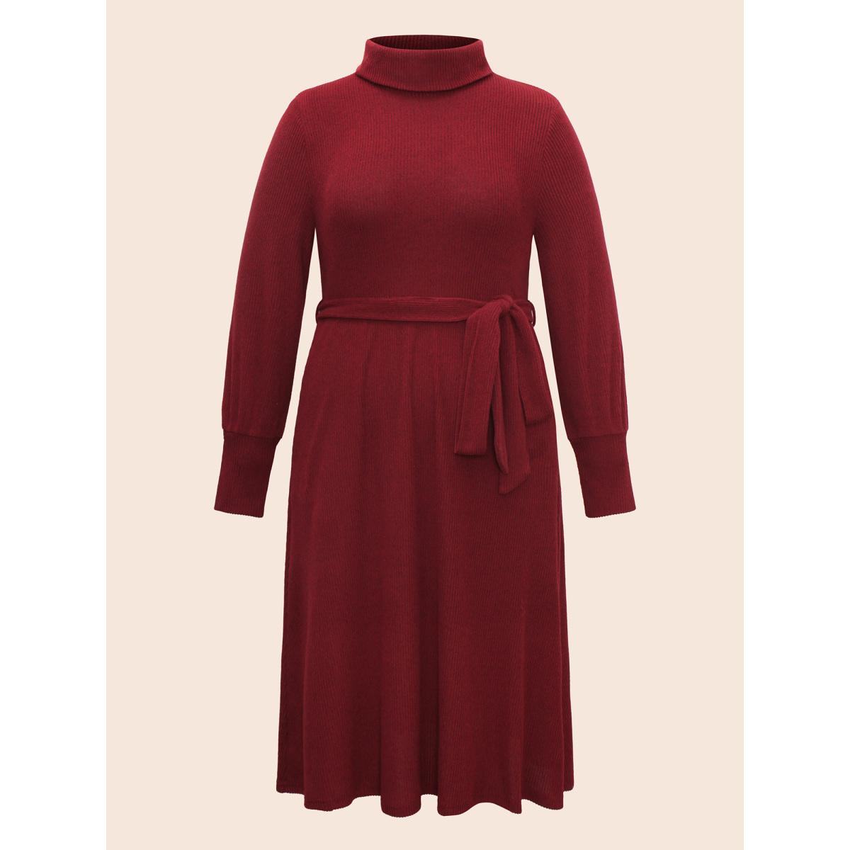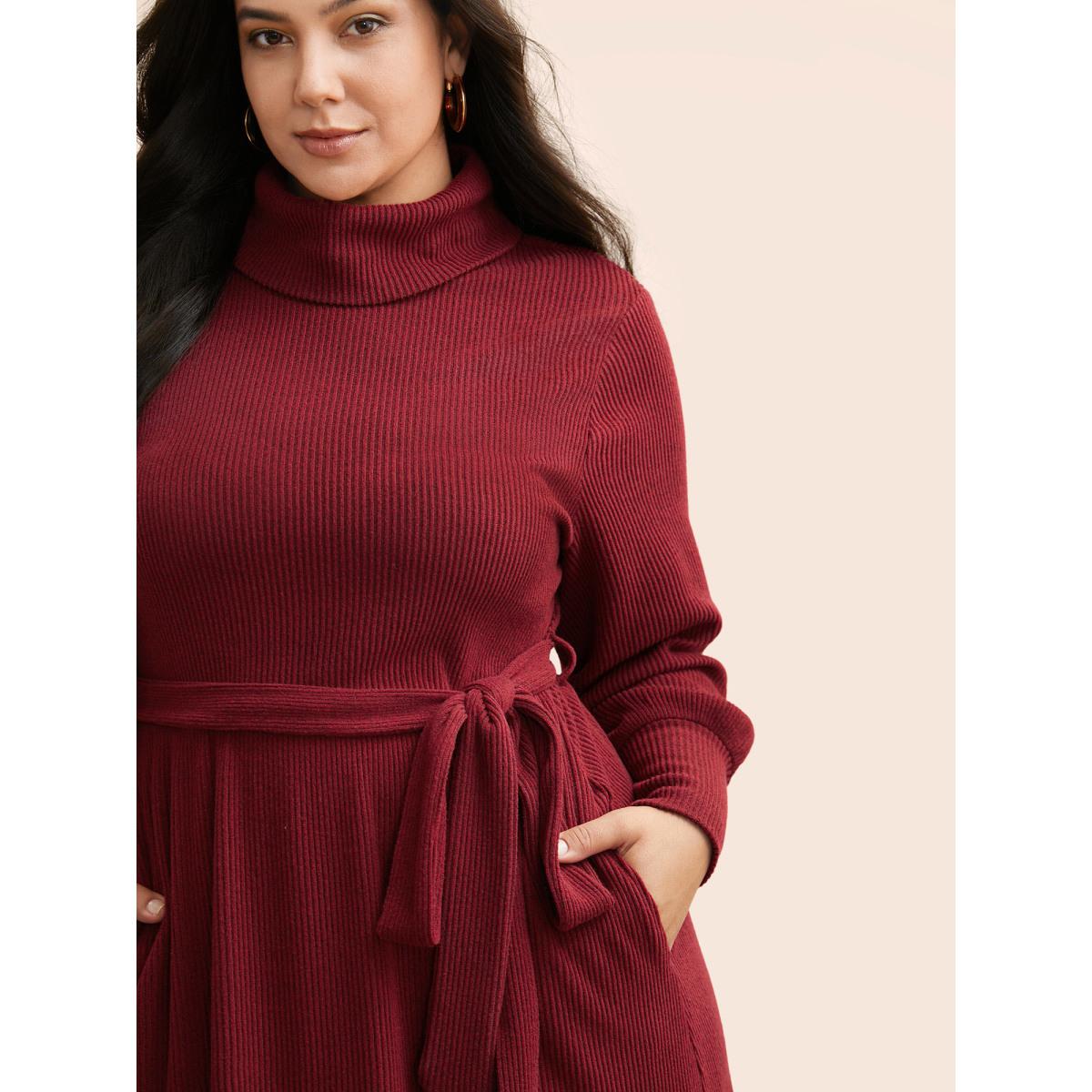 Plus Size Turtleneck Belted High Stretch Knit Dress Burgundy Women Casual Texture Knit Dresses Bloomchic 22-24/3X
