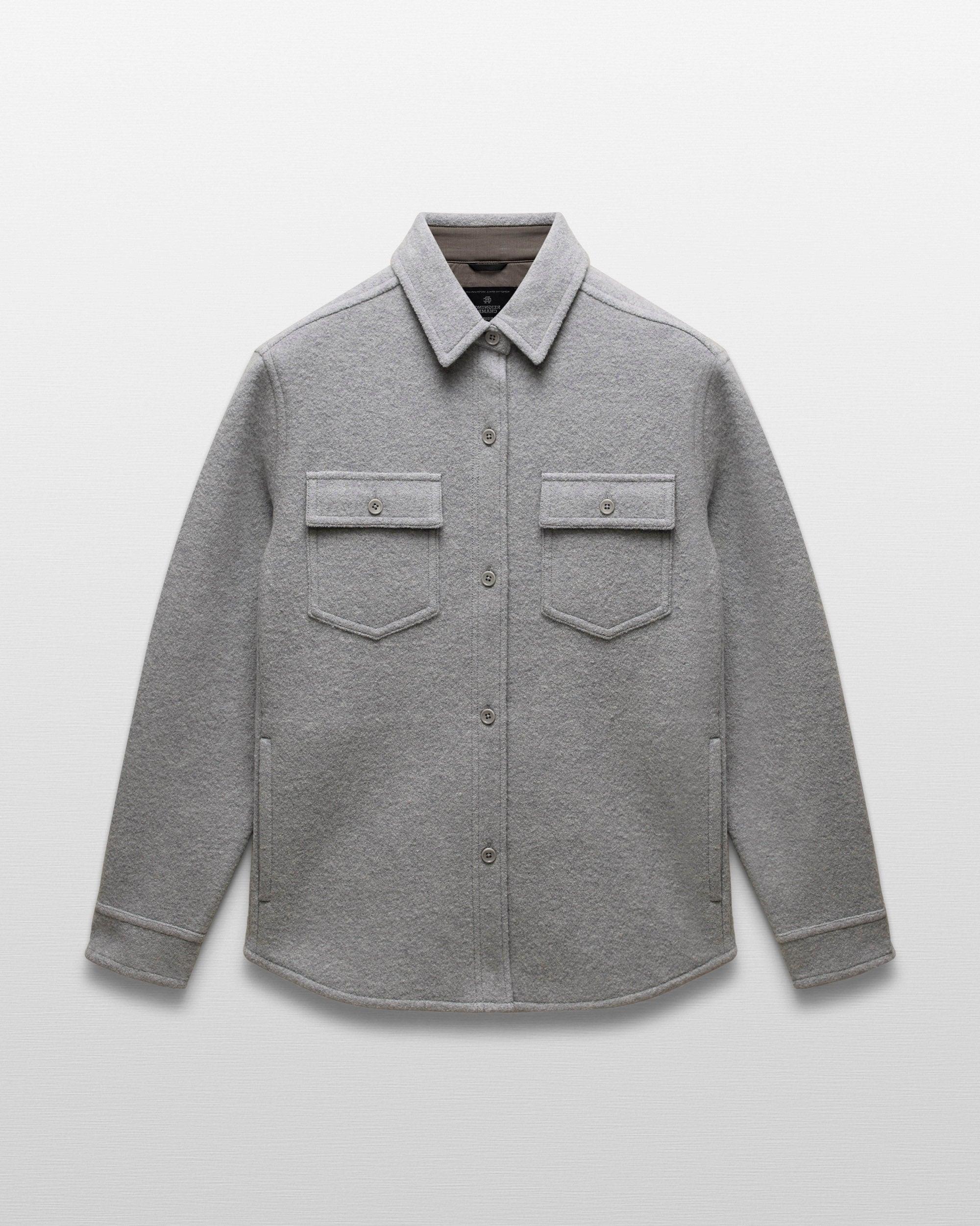 Overview This classic overshirt is crafted from boiled merino wool with a dense, hairy texture. Featuring a standard fit, with full-cut sleeves and torso to provide versatility for layering. Designed with a pointed collar, flap chest pockets, corozo logo buttons, on-seam side pockets, adjustable cuffs, and a scooped hem. Details Pointed collar 24L corozo logo buttons Set-in sleeves Flap chest pockets On-seam side pockets Corozo button cuffs Scooped hem Lined collar, placket and cuffs Made in China Style: RC-8036 XS S M L XL XXL Neck Width 15 16 16.5 17 18 18.5 Shoulder Width 48 49.5 51 53 54.5 56.5 Chest Width 53.5 56 58.5 62 66 70 Body Length 73 75 77 79 80.5 82.5 Sleeve Length 61.5 63 64 65.5 66.5 68