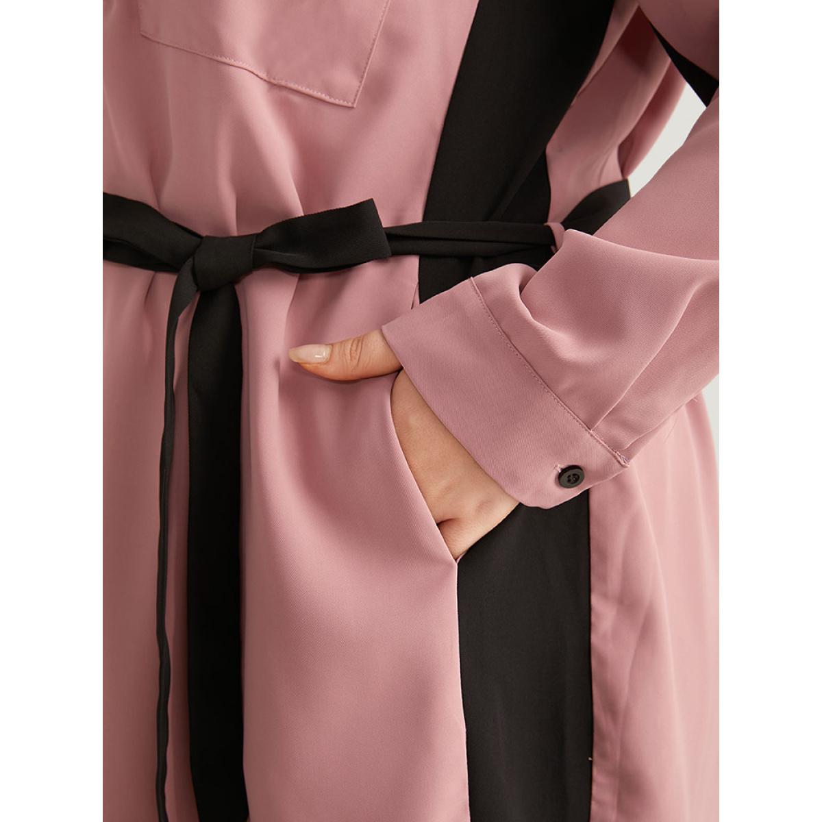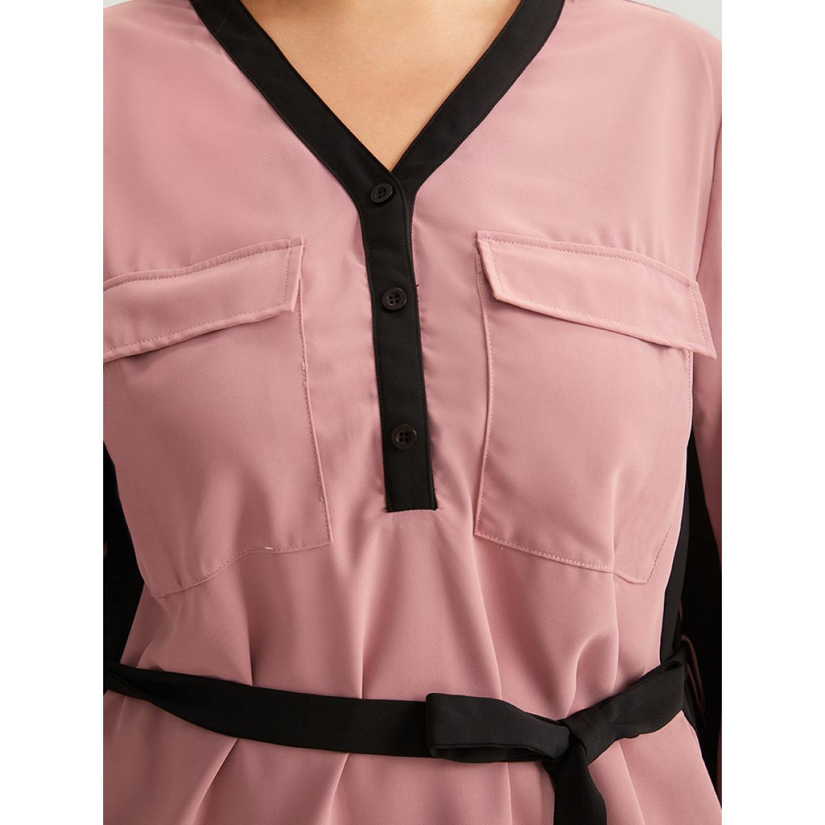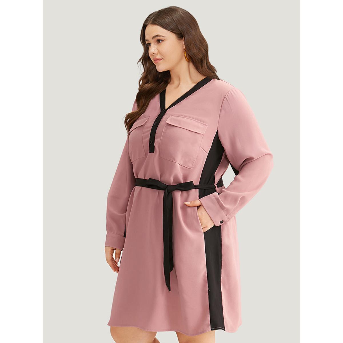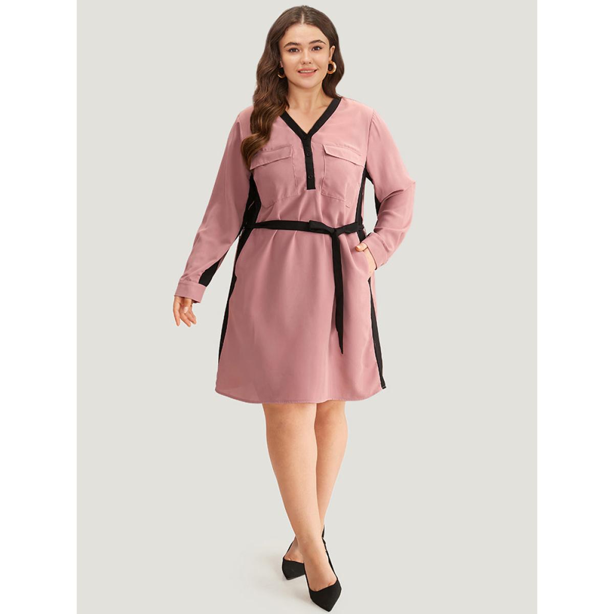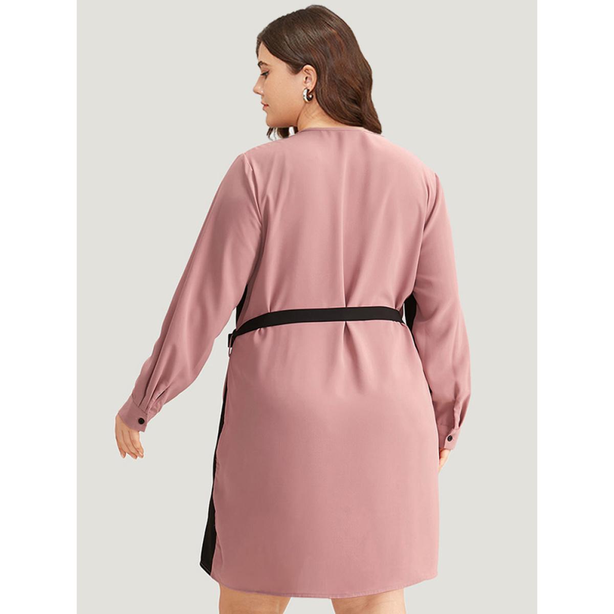 Plus Size Twill Two Tone Metal Button Up Belted Dress DustyPink Women Office Belted V-neck Long Sleeve Curvy Knee Dress BloomChic 12/L