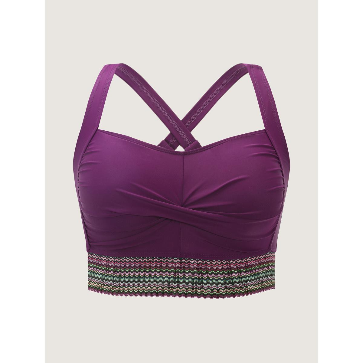 Plus Size Twist Front Patchwork Woven Ribbon Swim Top Women's Swimwear Eggplant Resort Woven ribbon&lace trim High stretch Skinny Heart neckline Curve Swim Tops BloomChic 12/L
