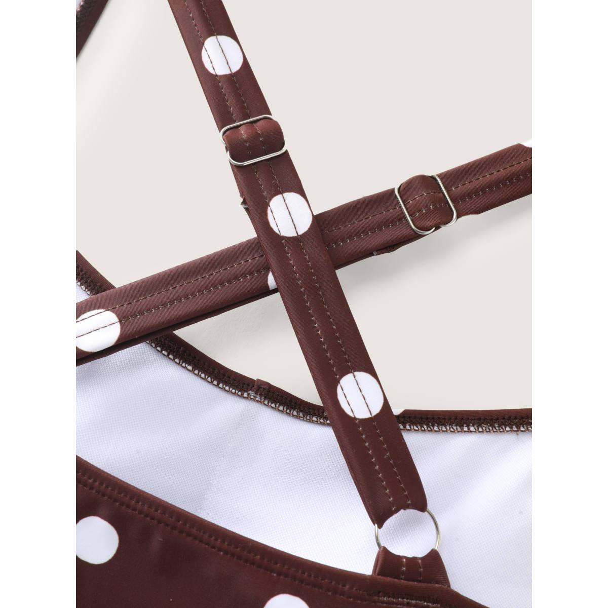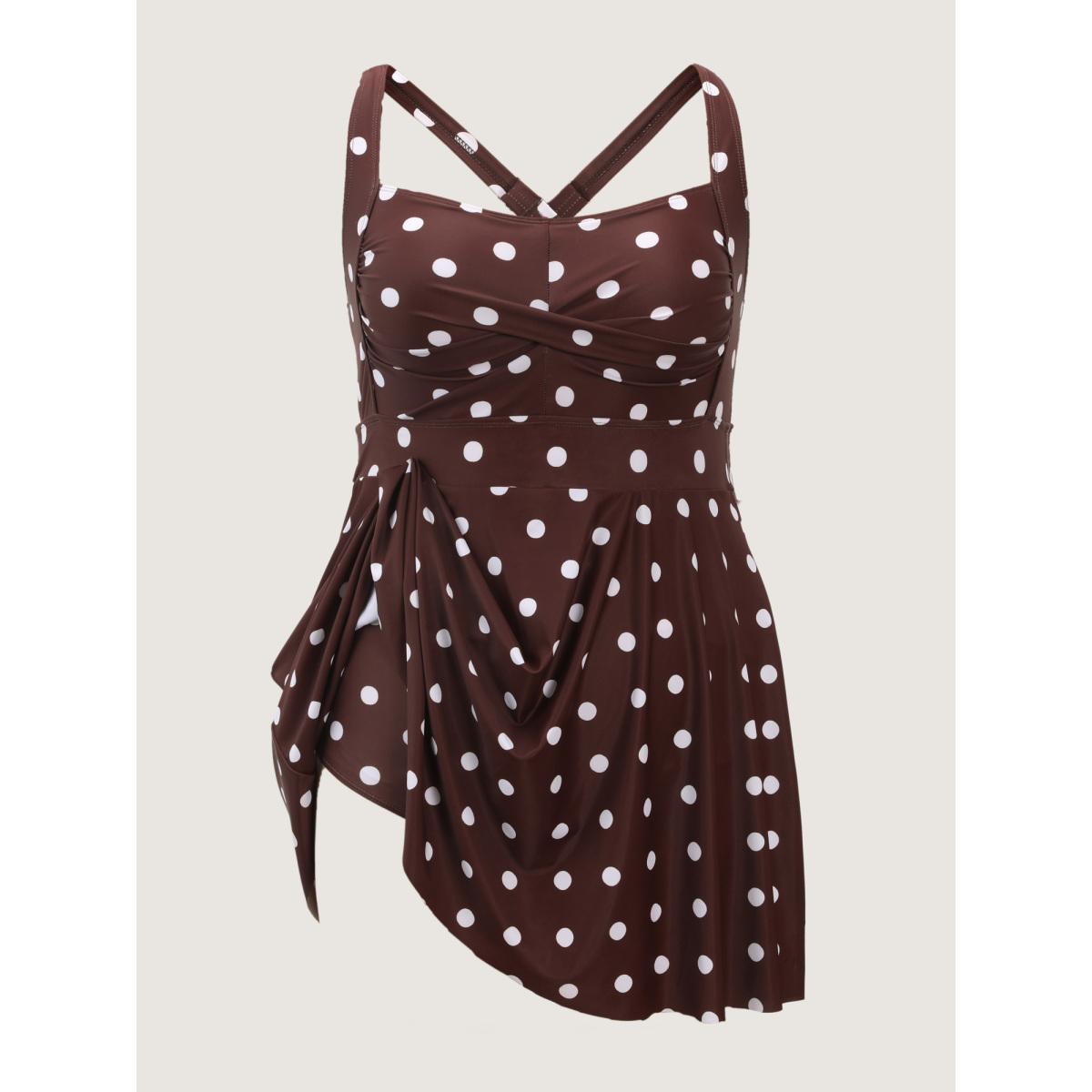 Plus Size Twist-Front Polka Dots Swim Dress Women's Swimwear DarkBrown Resort Bodycon Square Neck High stretch Curve Swim Dresses BloomChic 14-16/1X